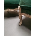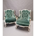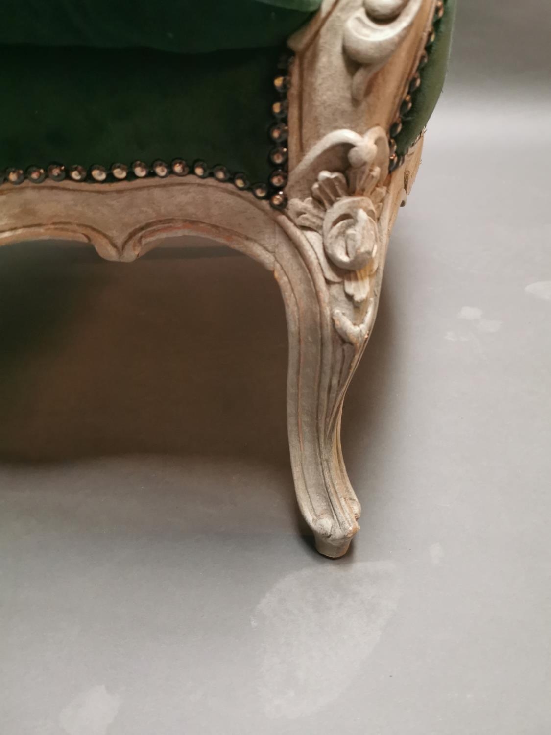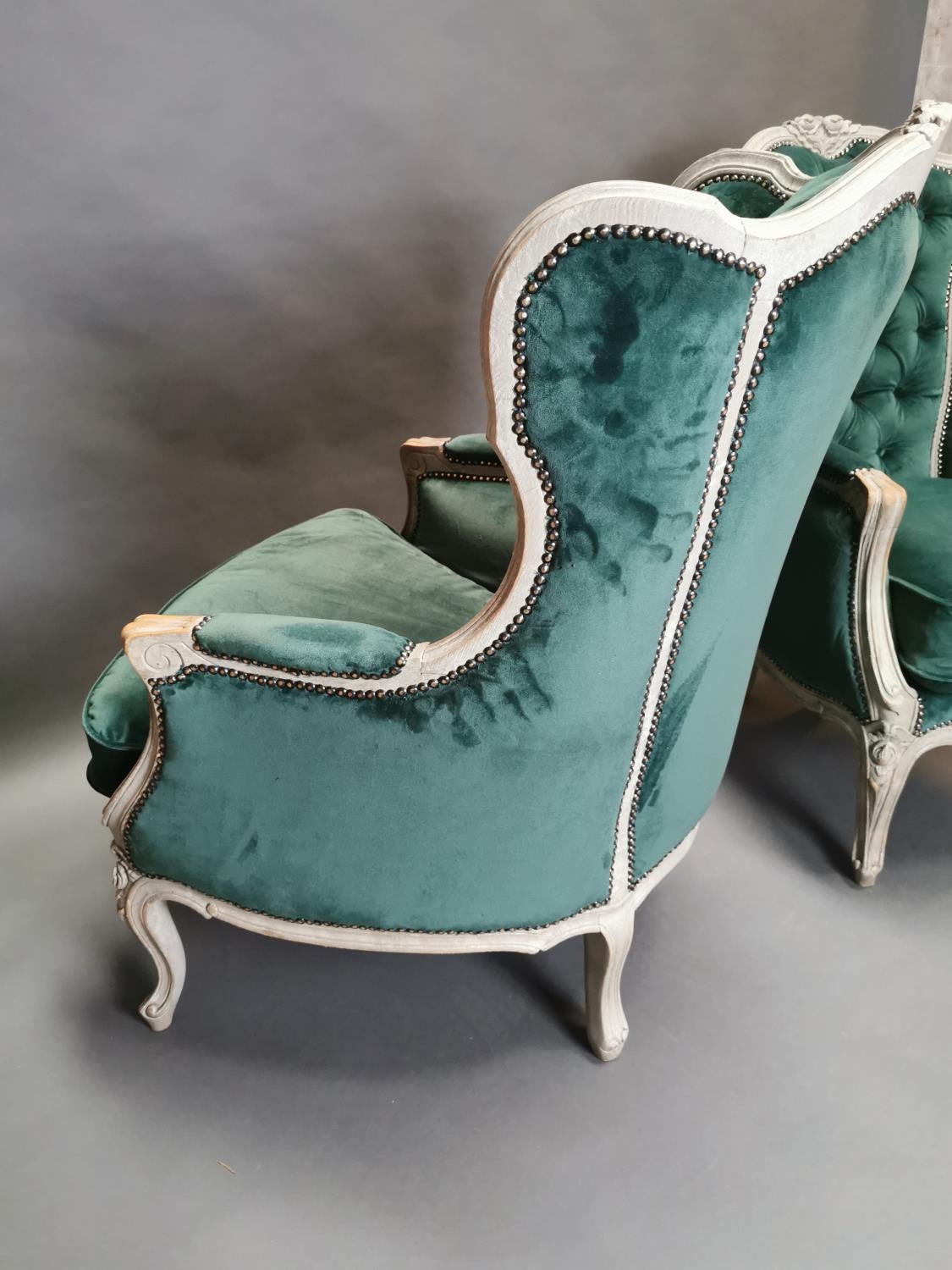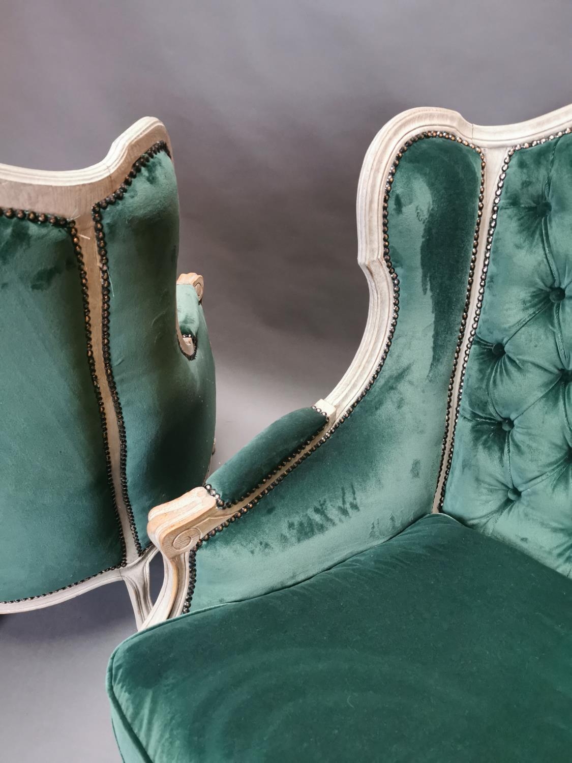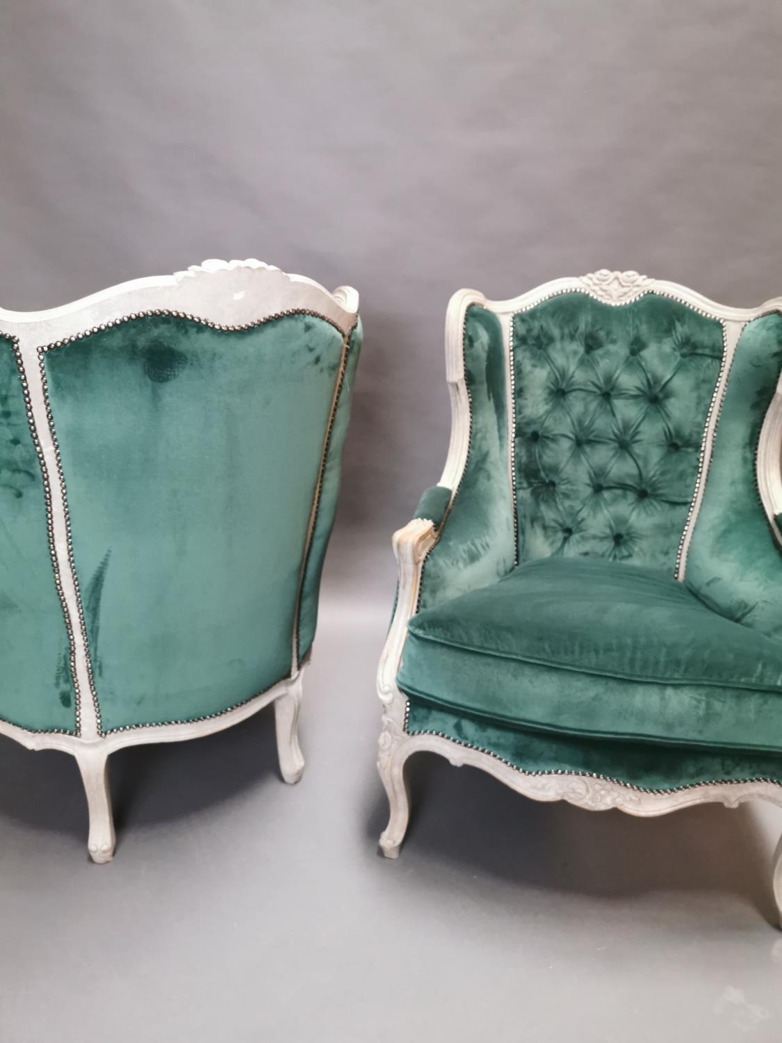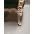 Pair of early 20th C. bleached oak and crushed green velvet upholstered arm chairs in the French style.