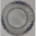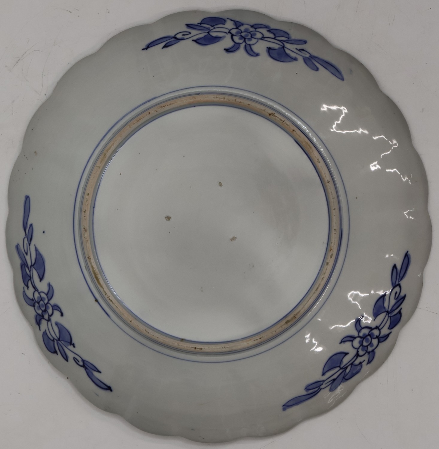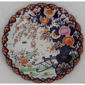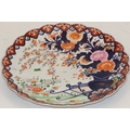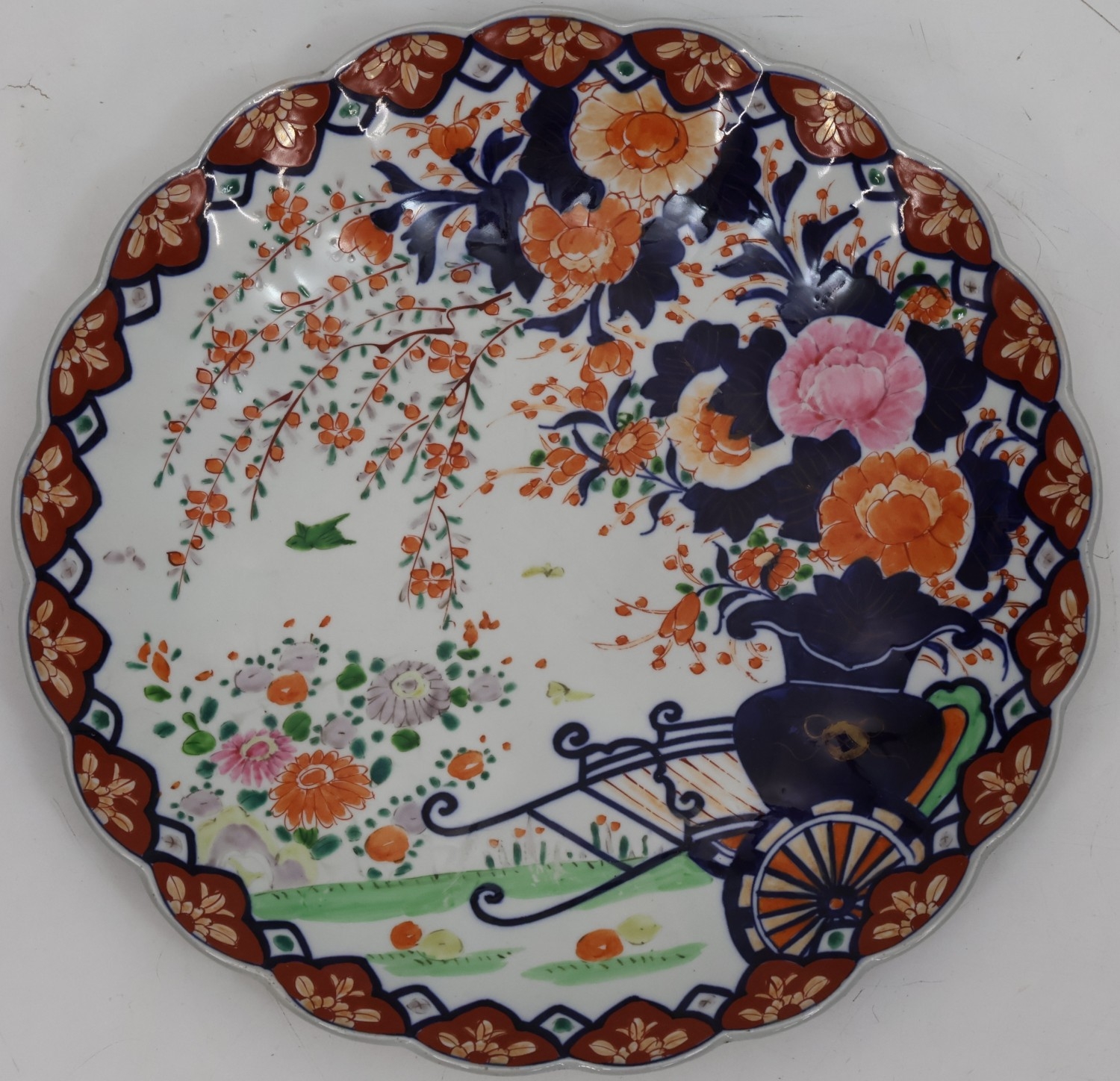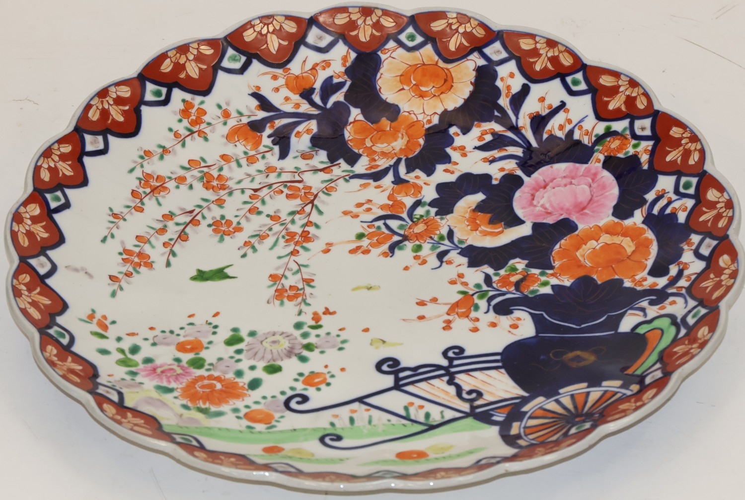 An Imari round scallop shaped charger on white, red and blue ground with garden and bird decoration, 41cm diameter