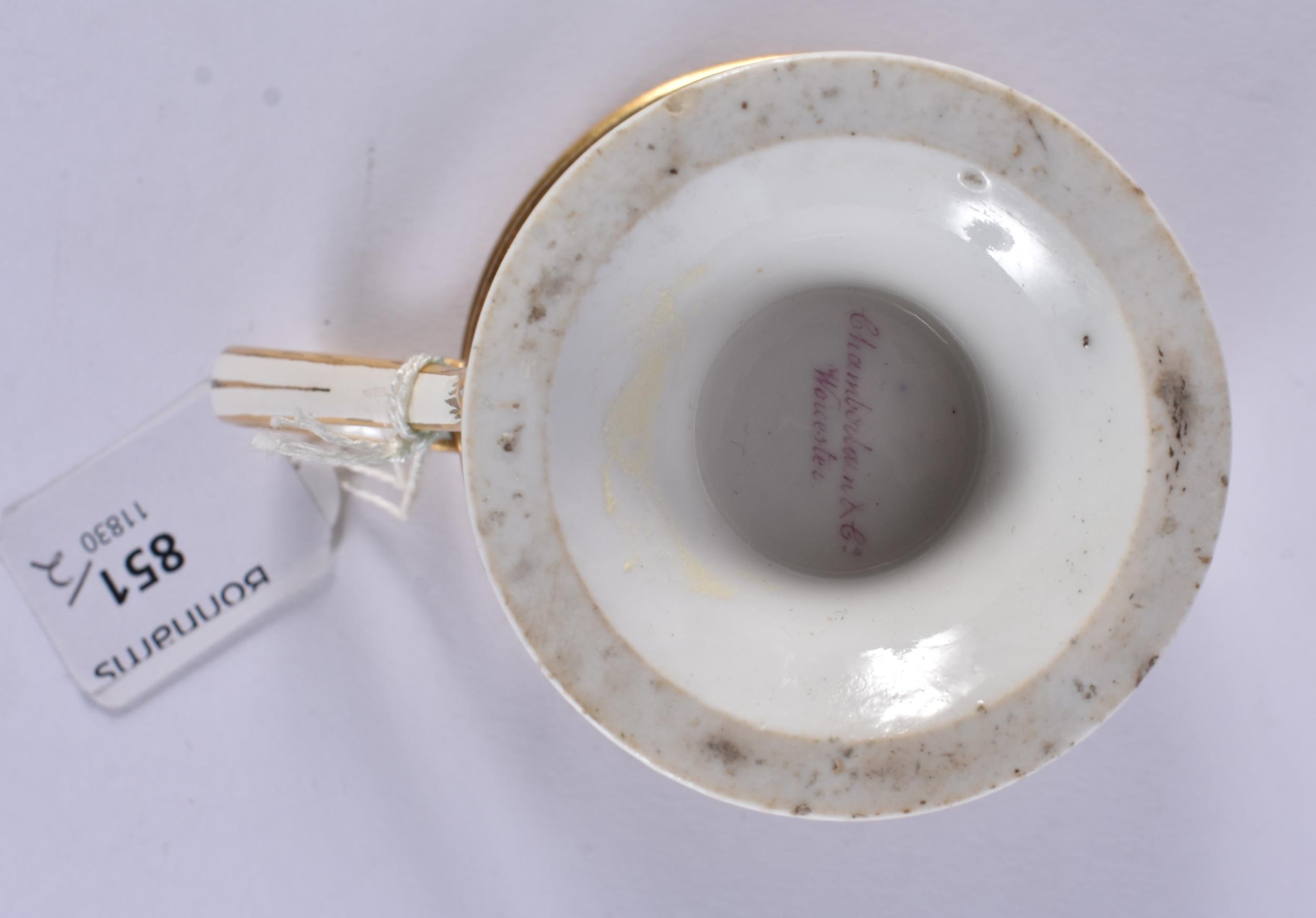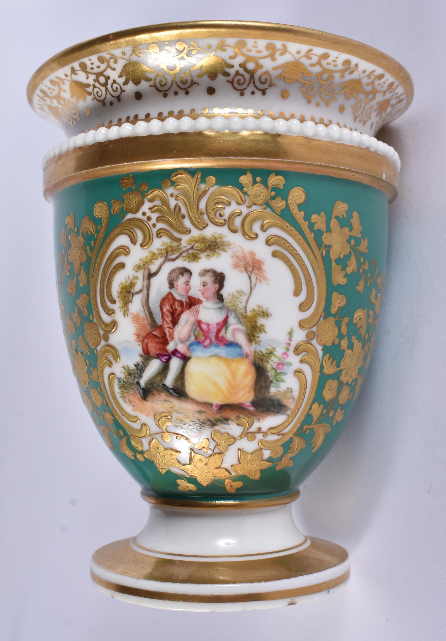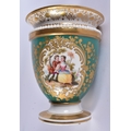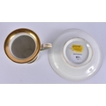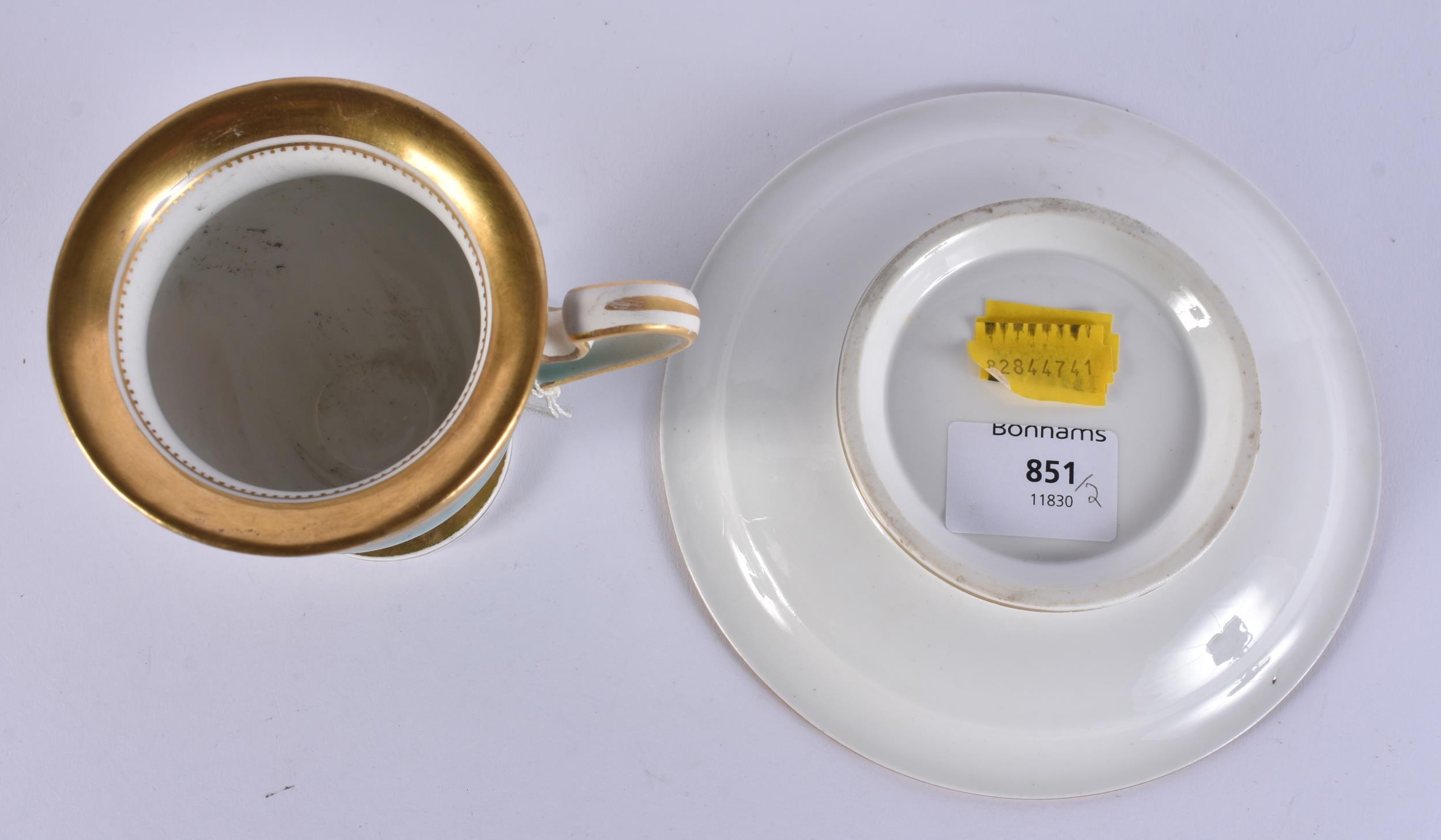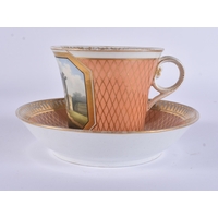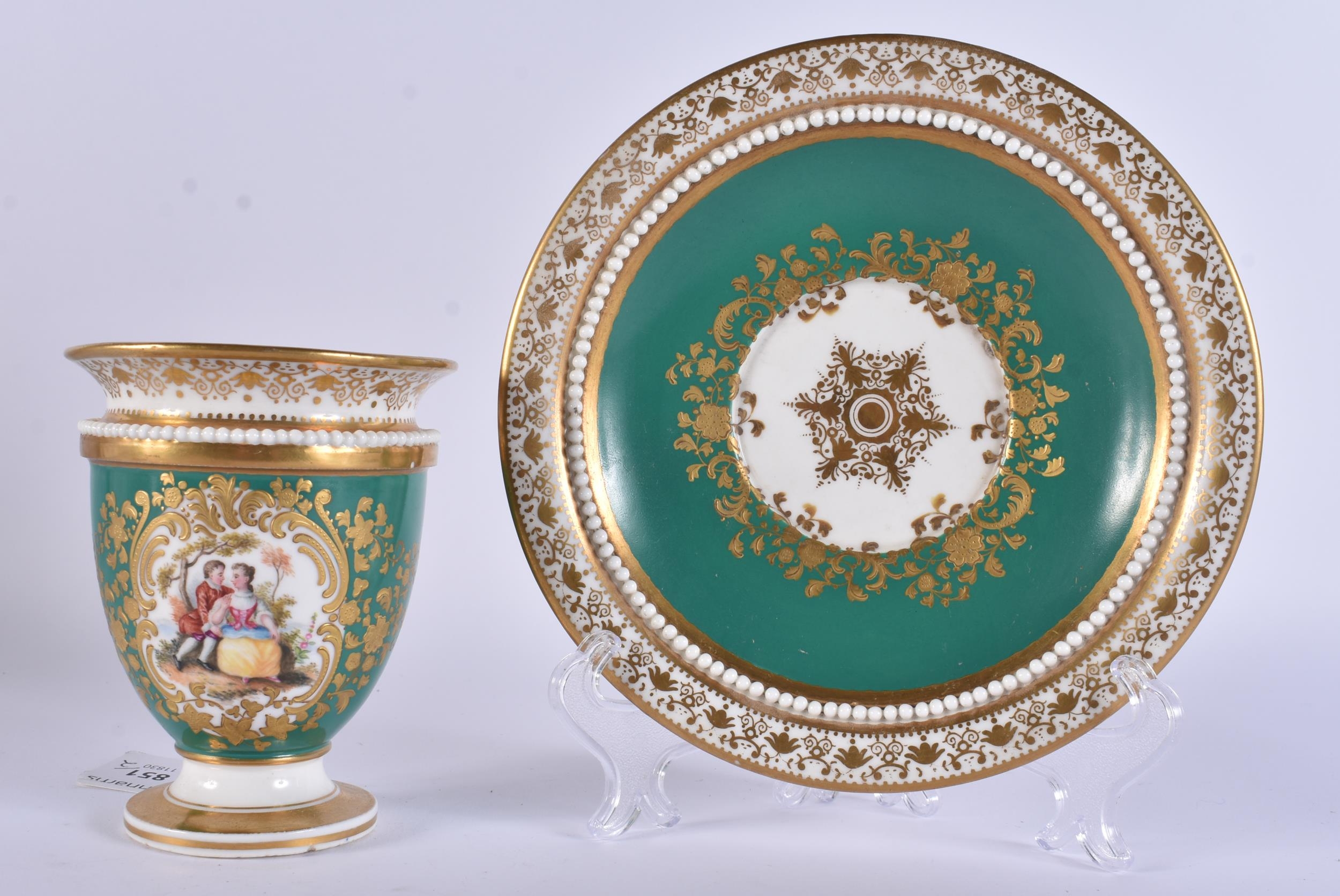 AN EARLY 19TH CENTURY CHAMBERLAINS WORCESTER CUP AND SAUCER painted with lovers on a rich gilt and green ground. 16 cm diameter.