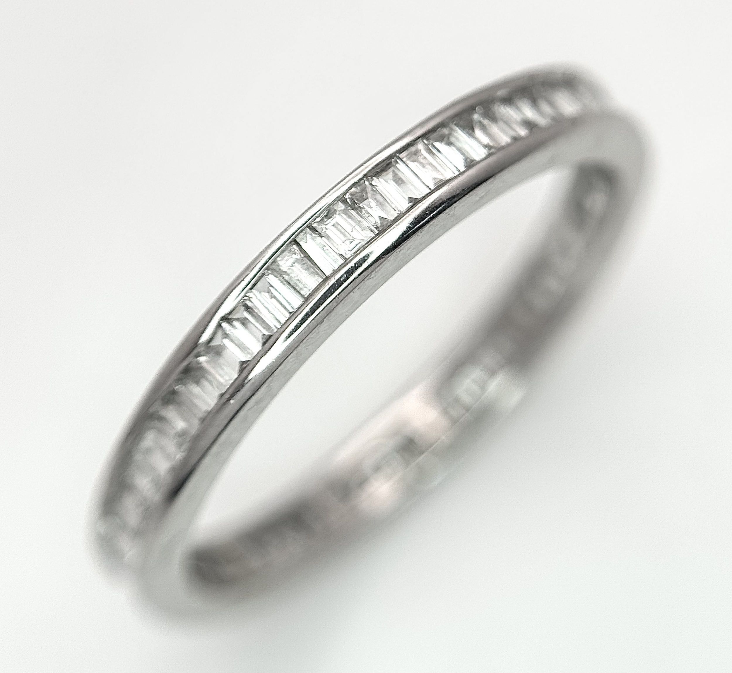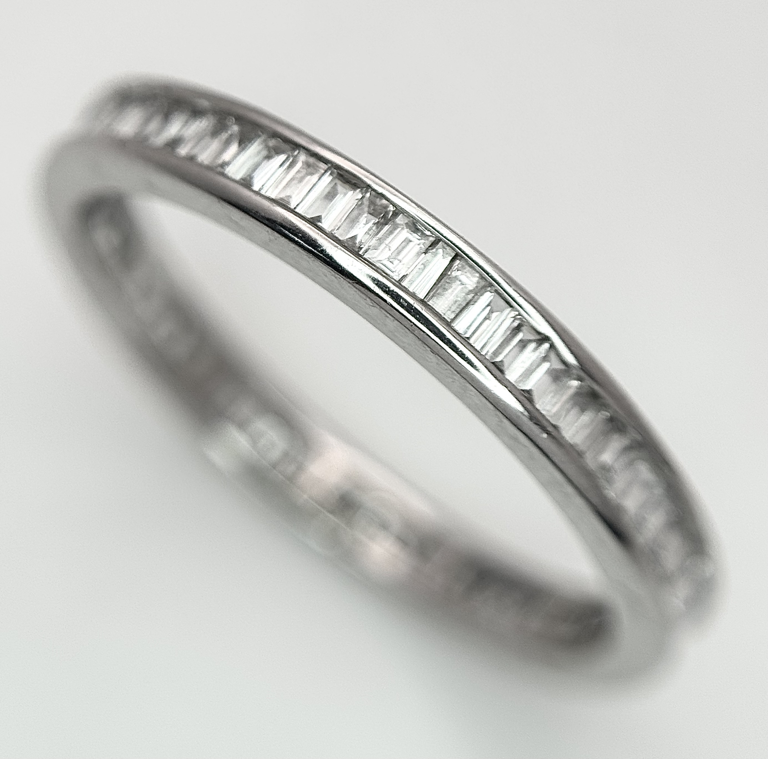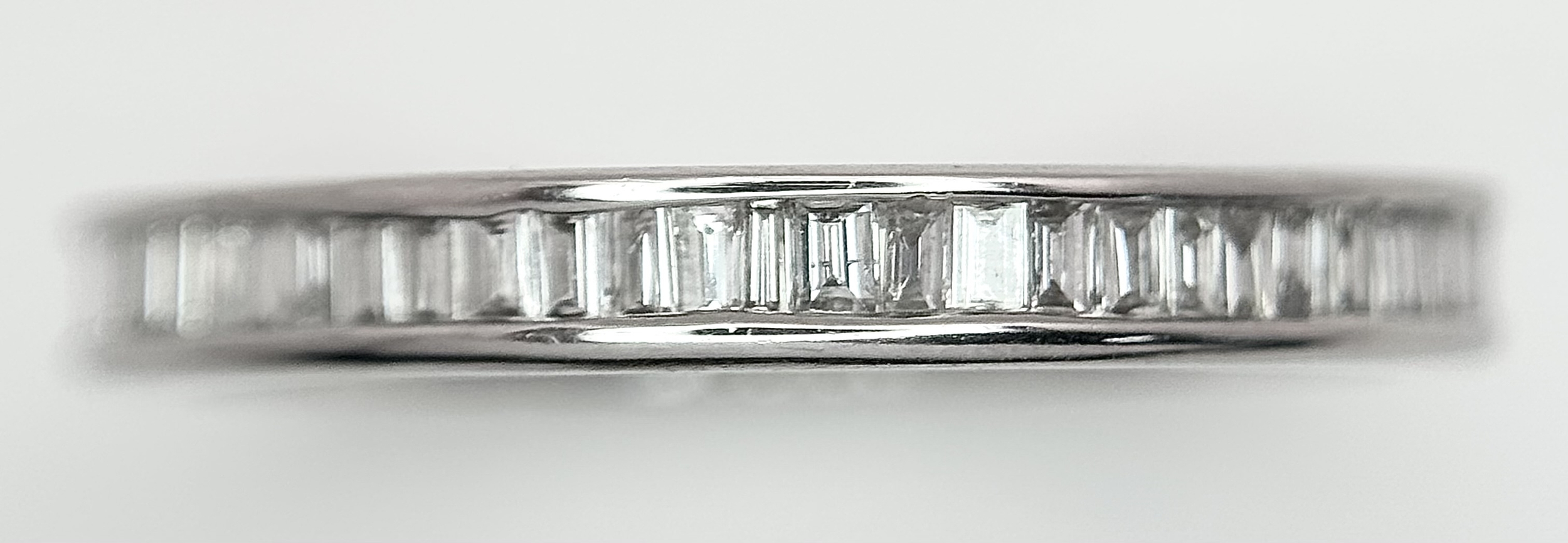 A 9K White Gold Diamond Eternity Ring. 1ctw of baguette channel set diamonds. Size P 1/2. 1/73g. MT71