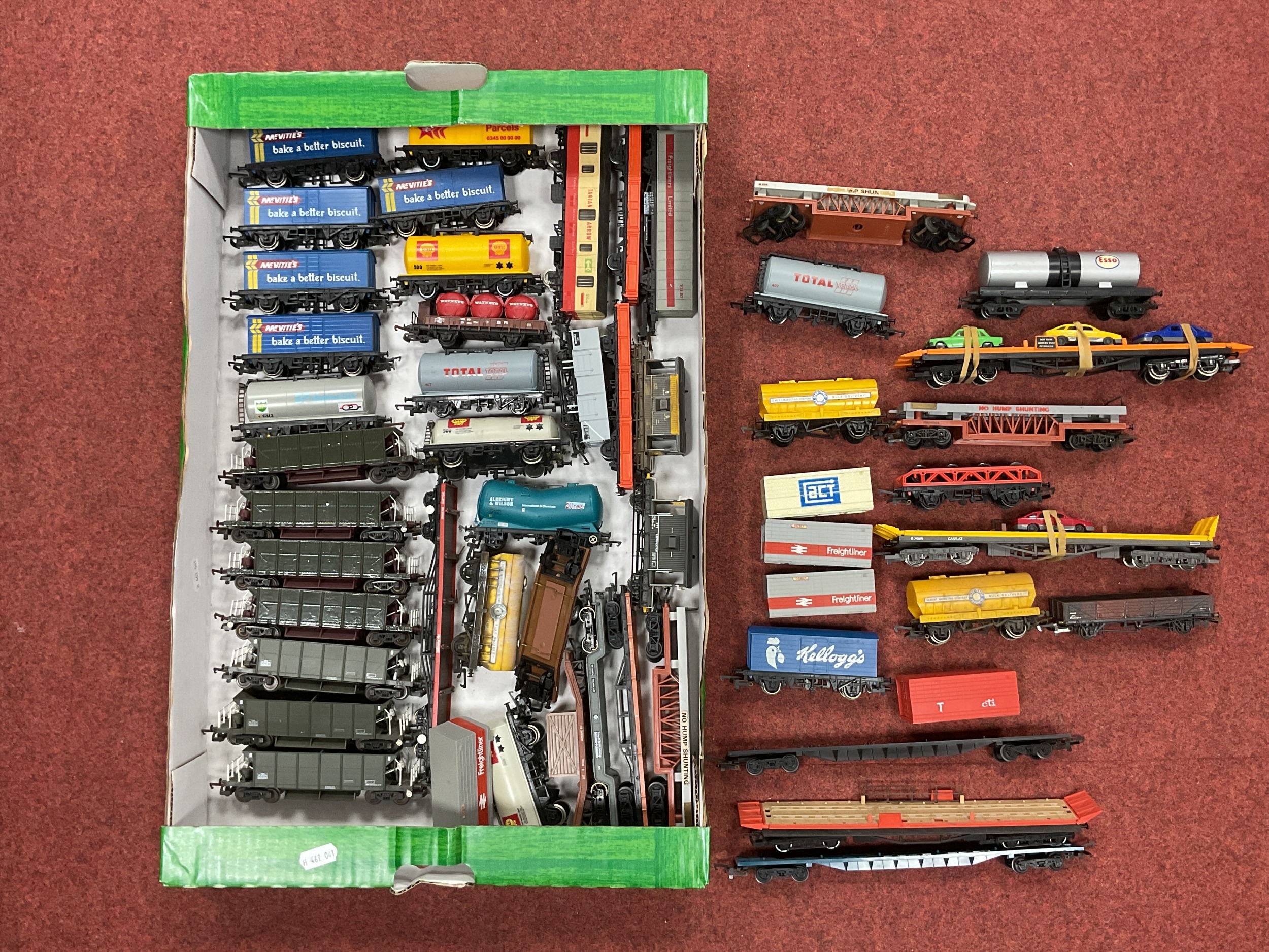 Approximately forty 00 gauge modern image wagons by Hornby, Lima and others, including Freightliner flats with containers, bogie ballast hoppers, tank wagons and car transporters, playworn.