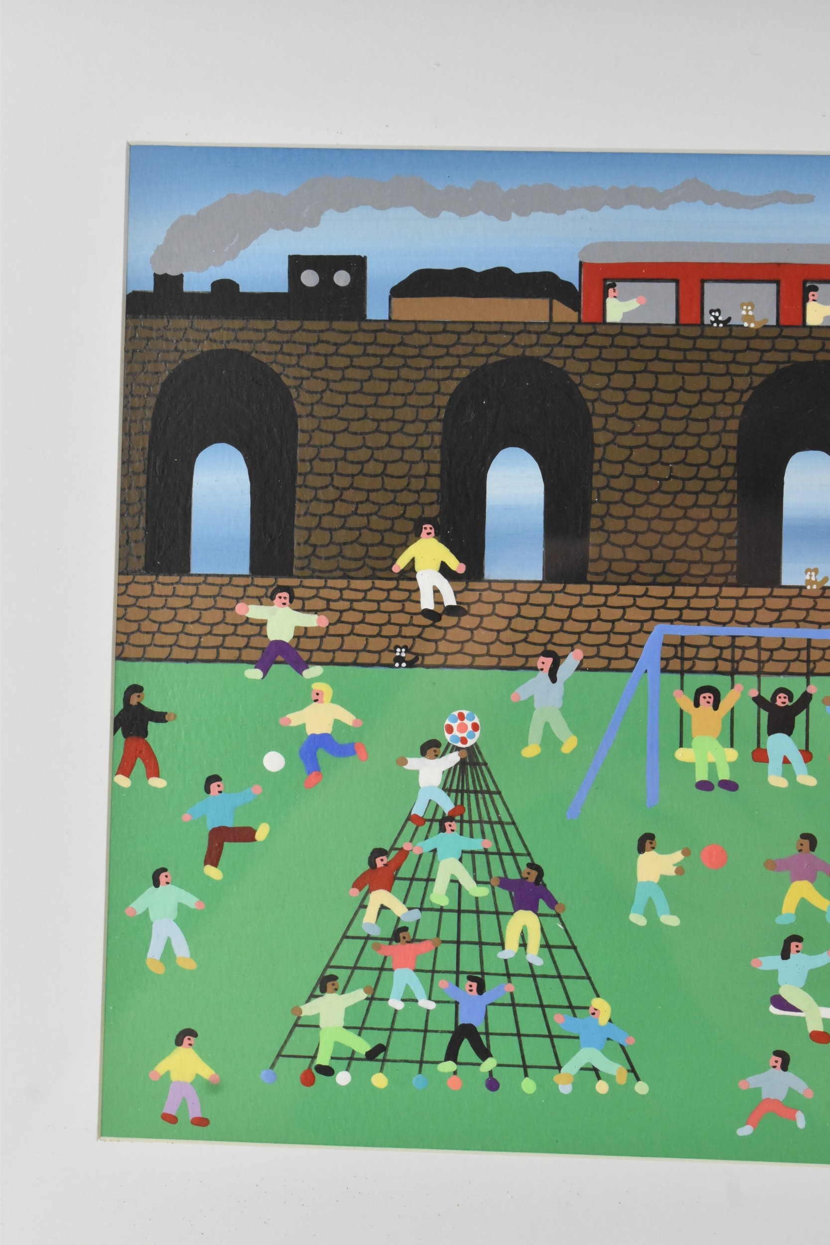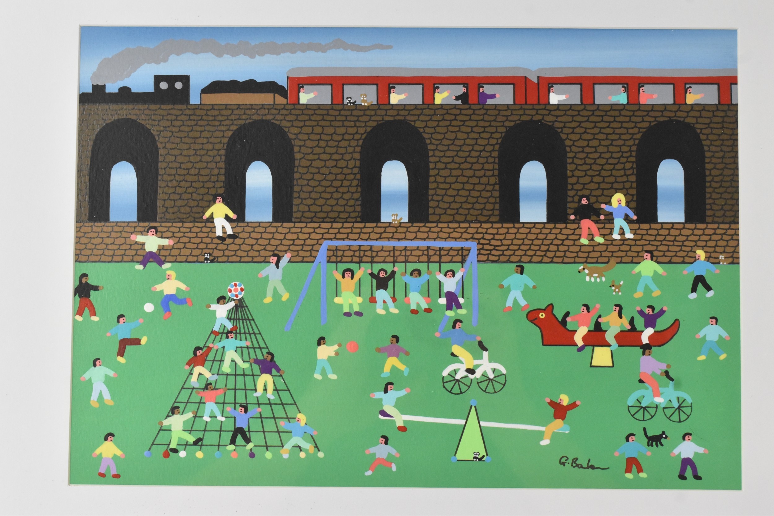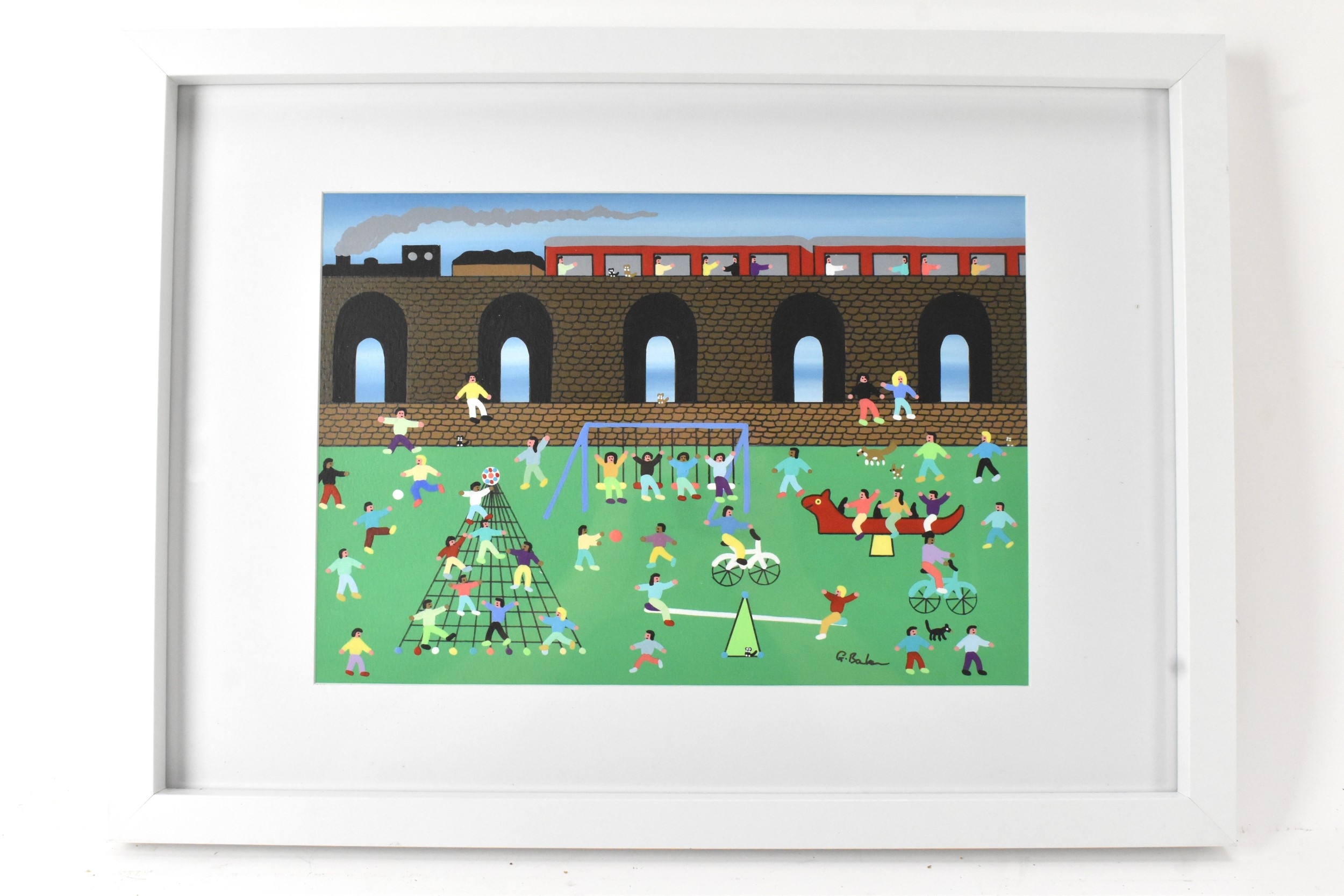 Gordon Barker (contemporary Devon artist), acrylic on board, entitled 'Fun in the Viaduct Park', signed to the lower right corner, 29cm x 20cm, the frame 45.5cm x 33cm