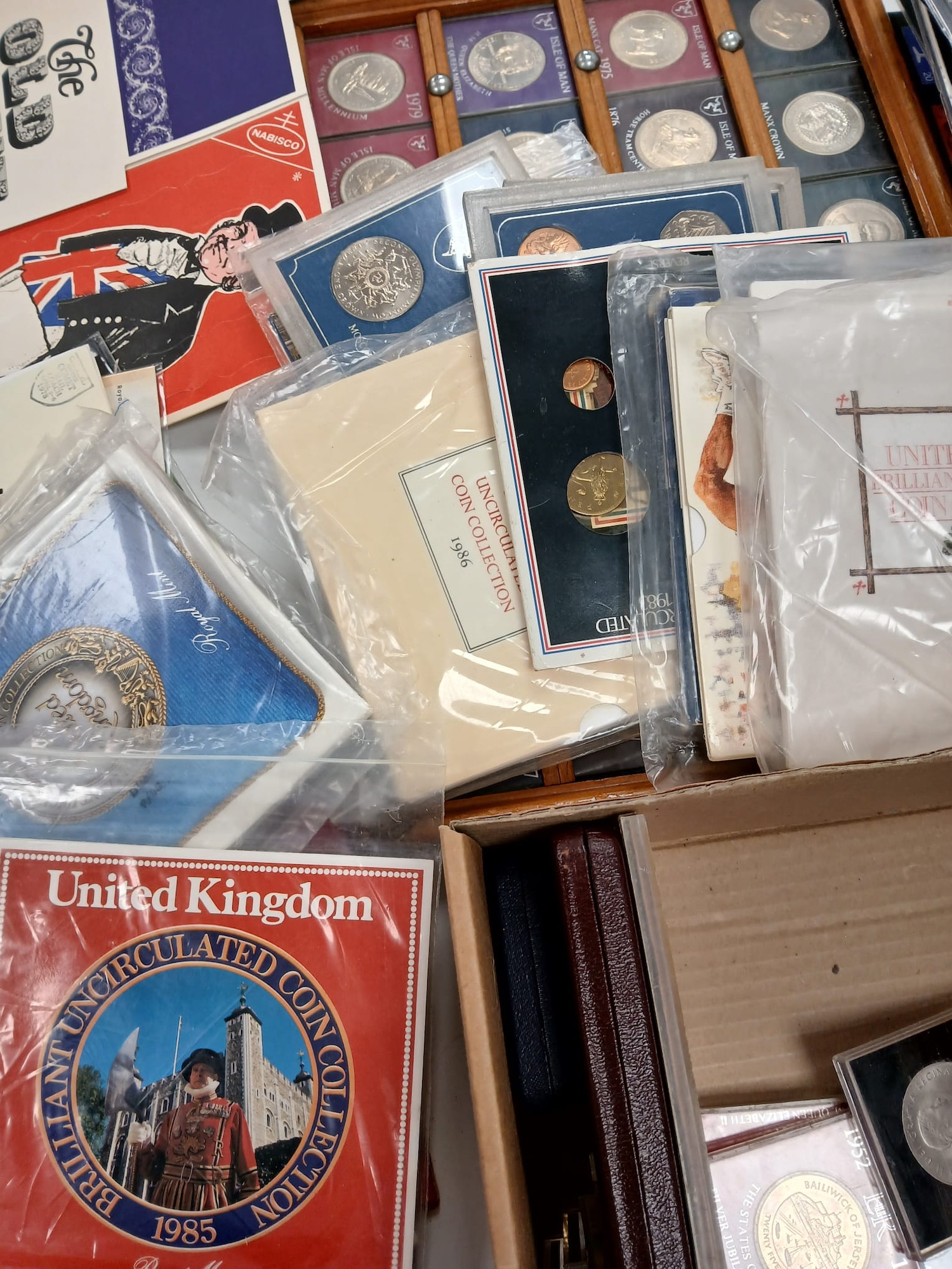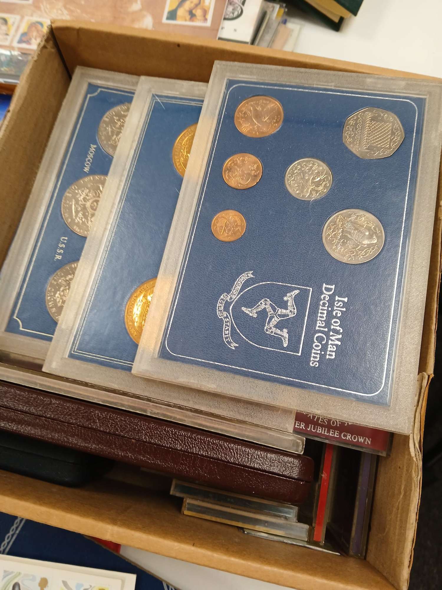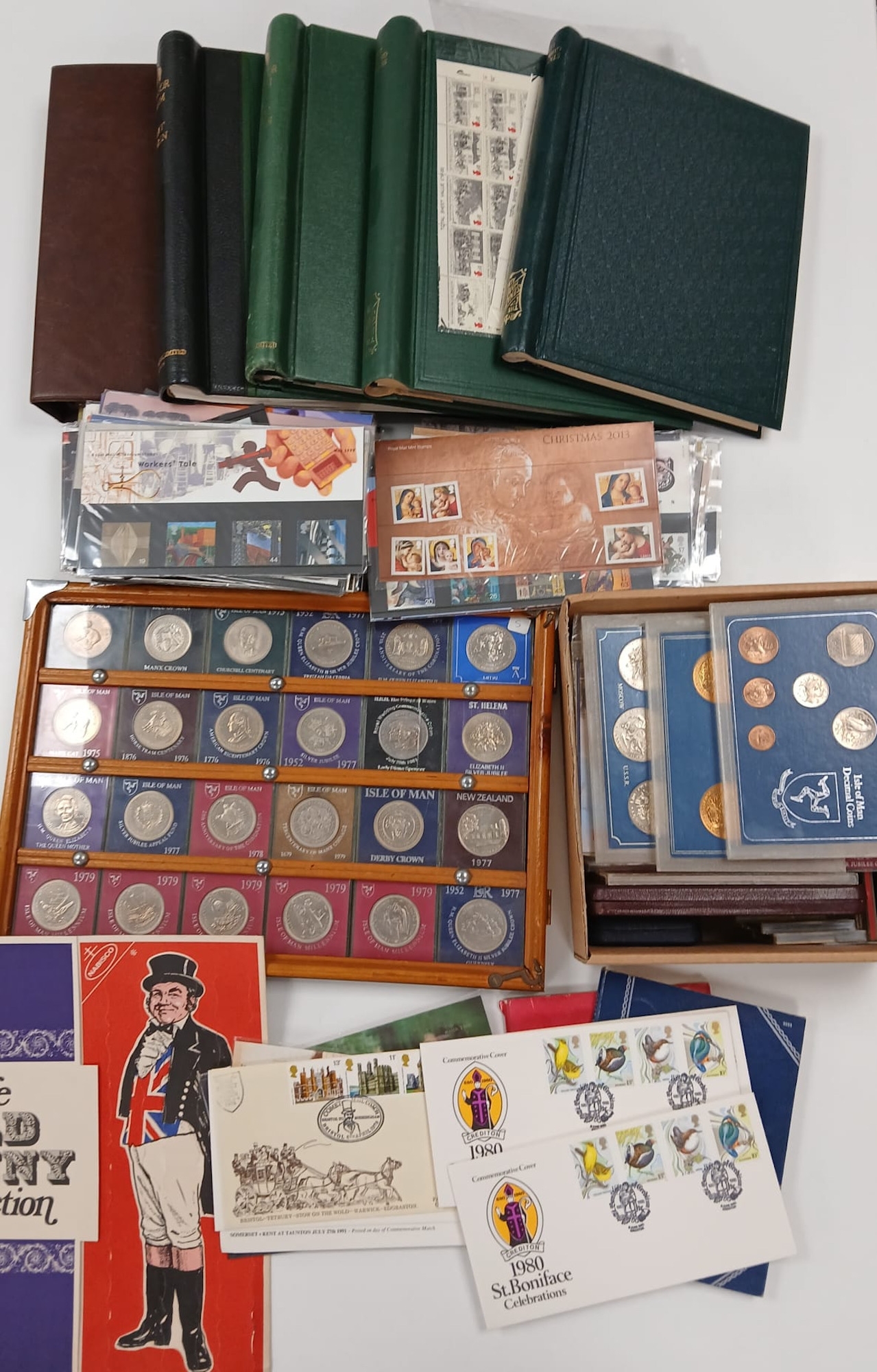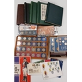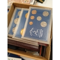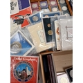 Stamps and Coins. A collection of GB presentation packs, world coins, cased modern crowns, thematic stamps, coin year sets etc, in two bags.