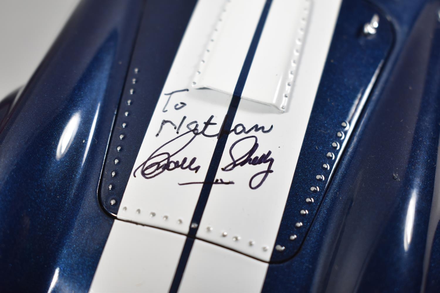 A Cased Shelby Collectibles Model of a Shelby Cobra 427S/C Bonnet Signed by Carroll Shelby, To Nathan