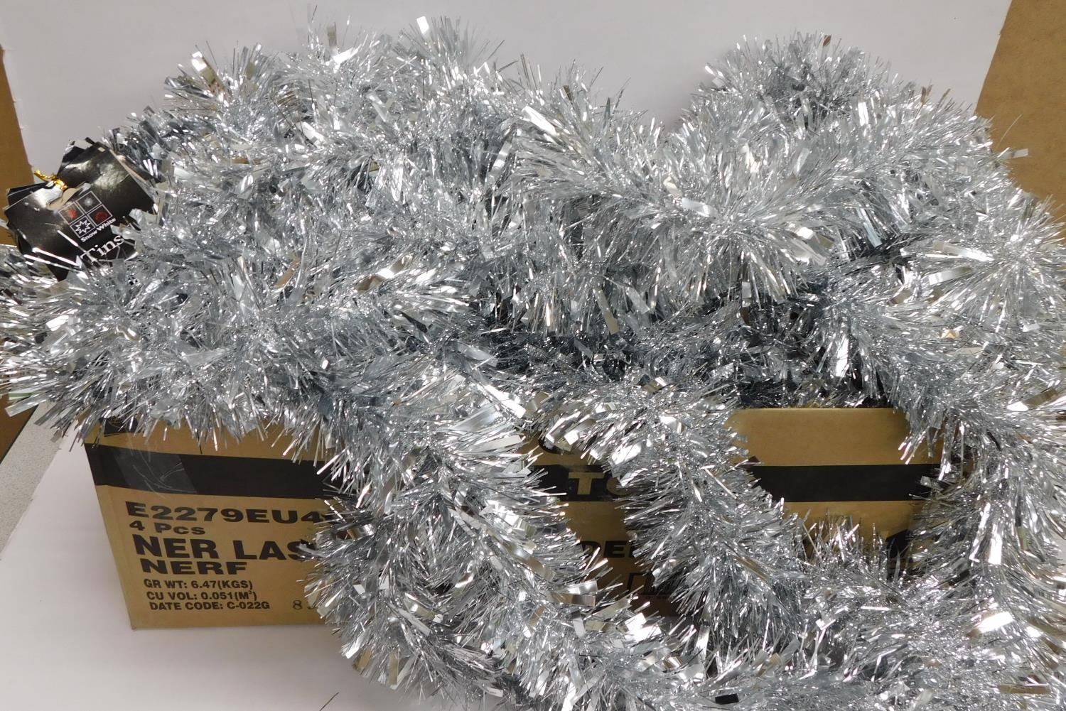 Large box of silver tinsel packs