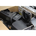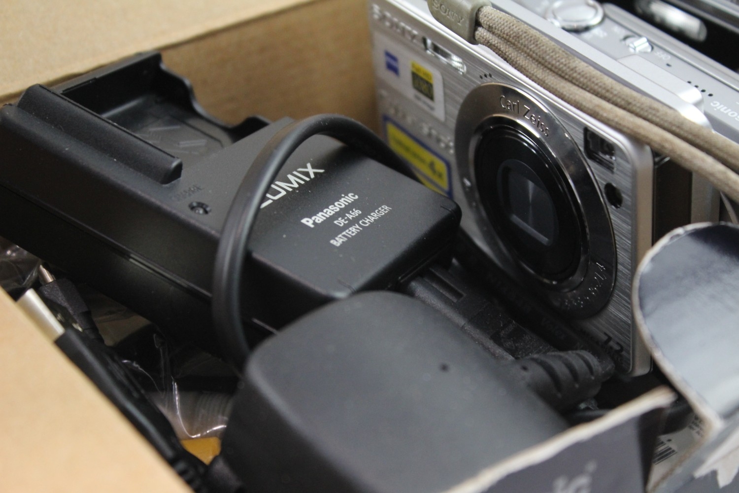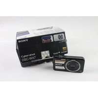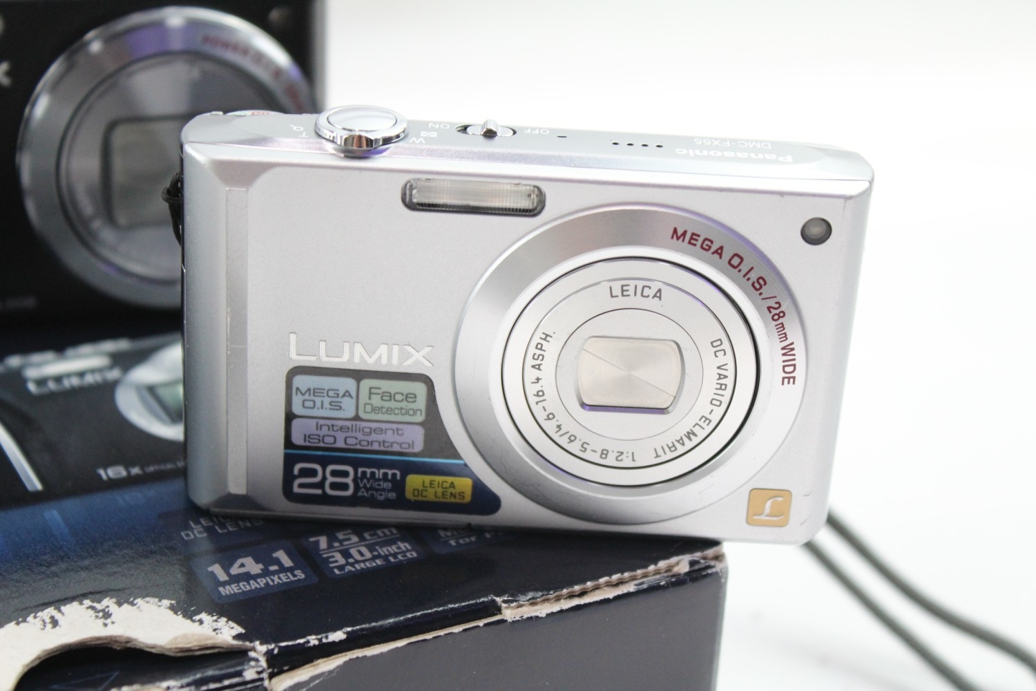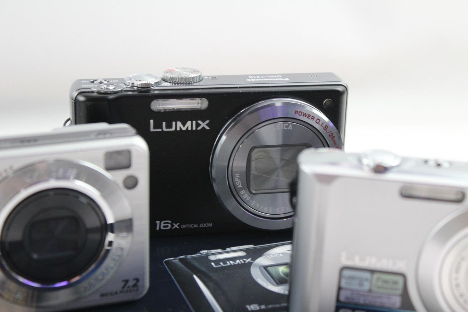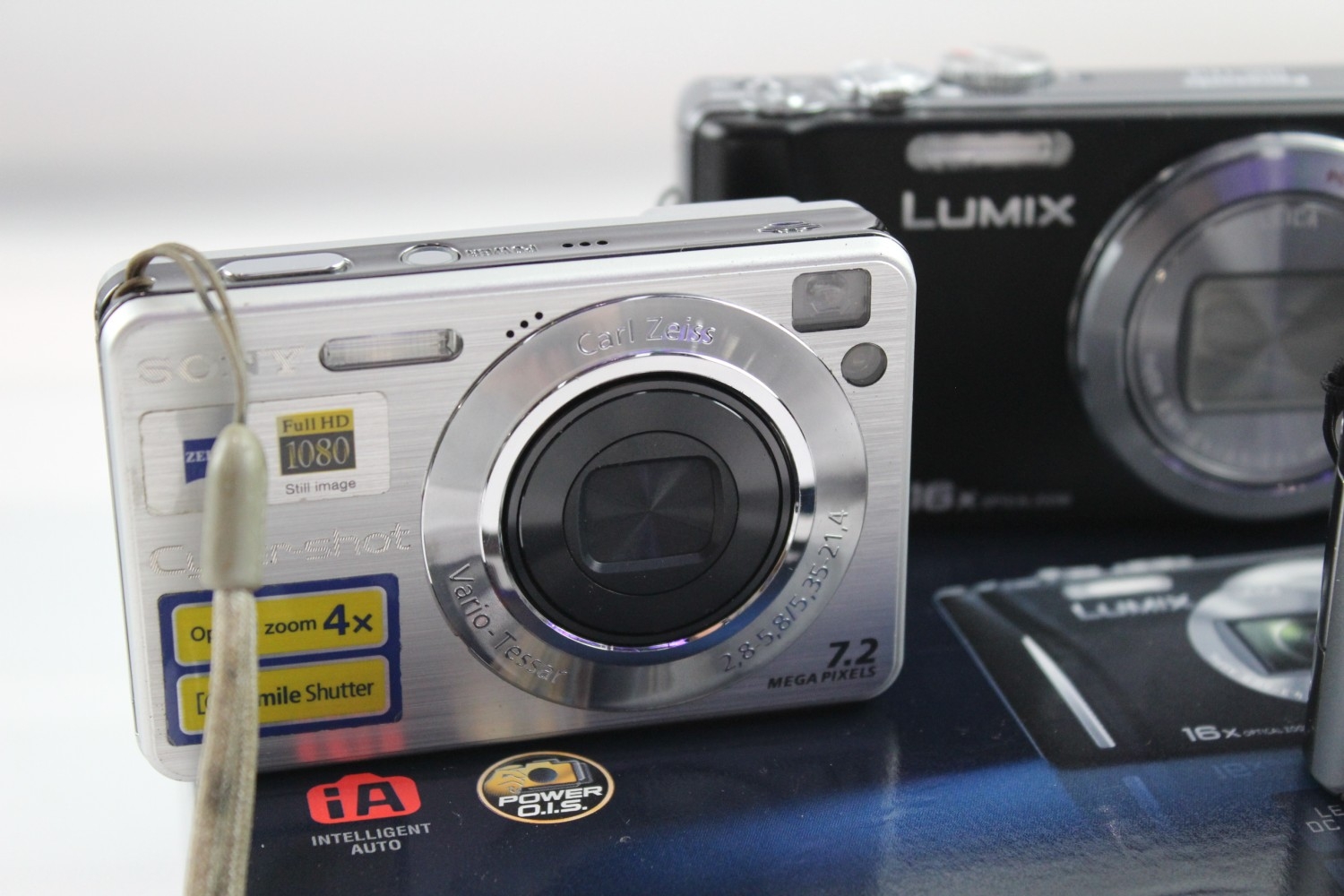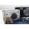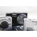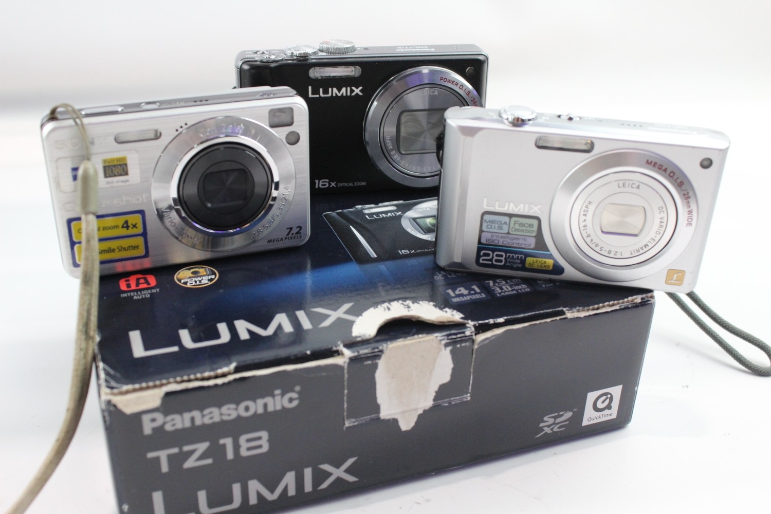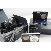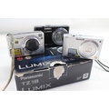 Three compact digital cameras, one boxed Panasonic Lumix DMC-TZ18 14.1mp with charger, cable, software disc and instruction manual, one Panasonic Lumix DMC-FX55 8mp CCD sensor and one Sony Cyber-shot DSC-W110 7.2mp