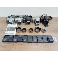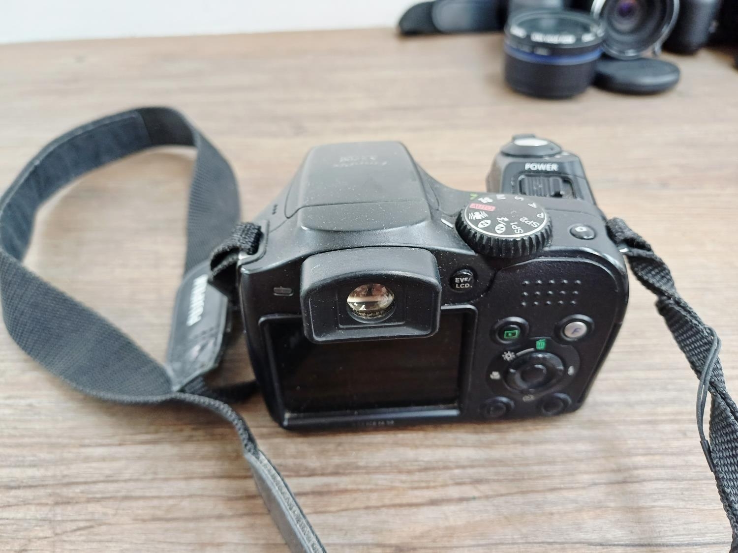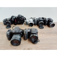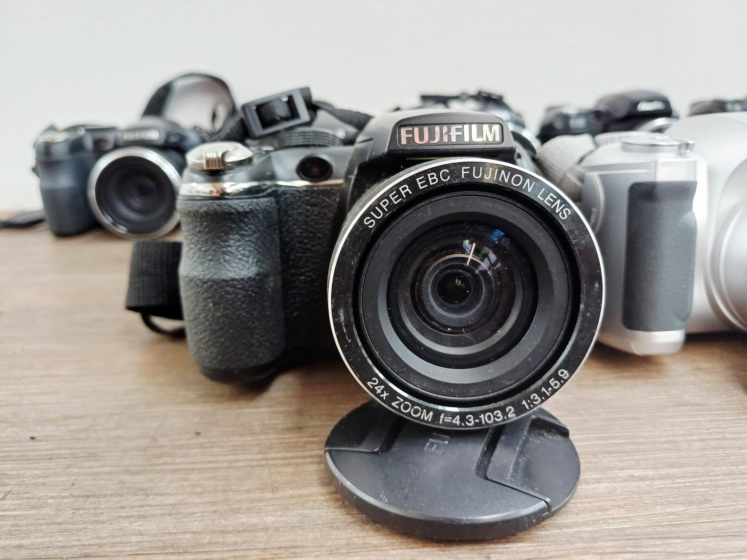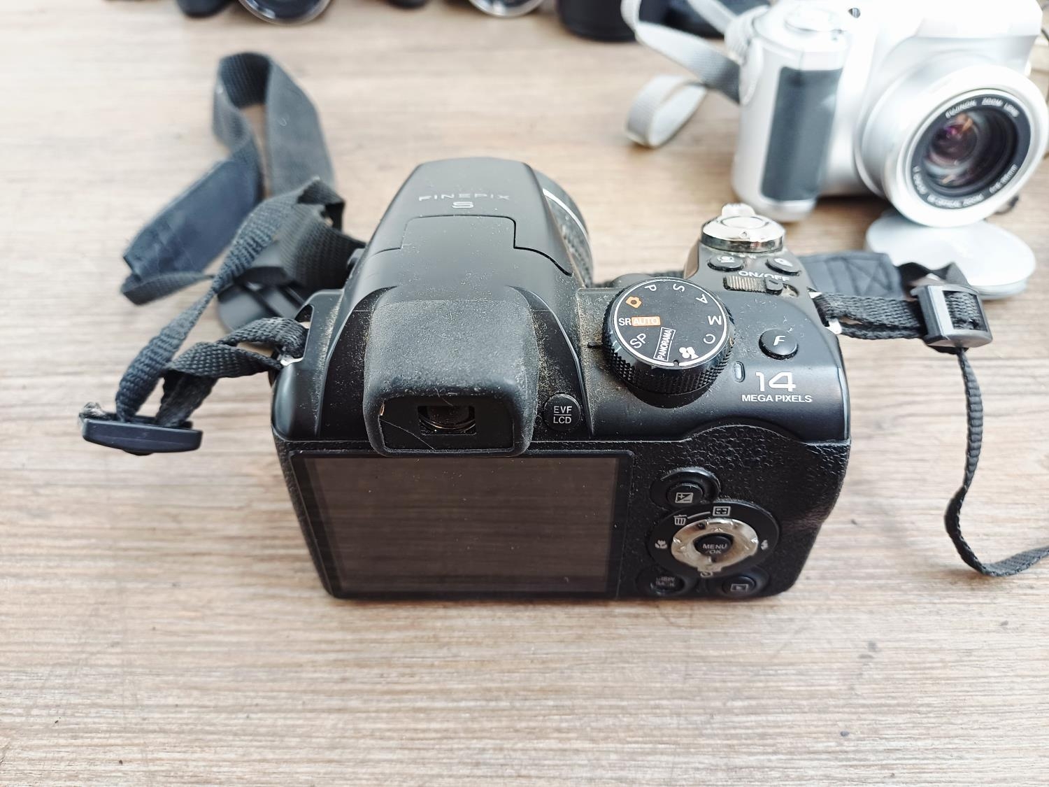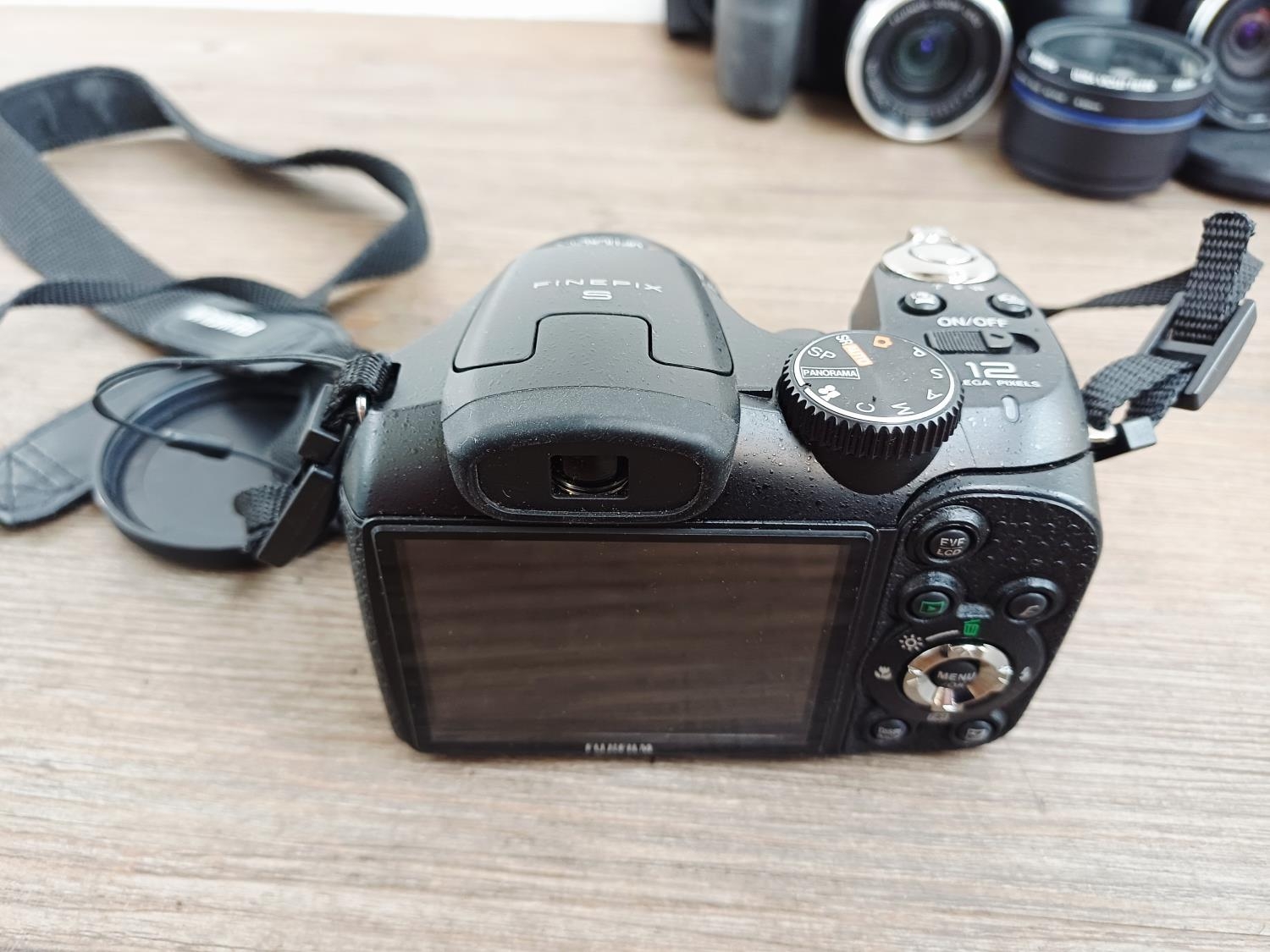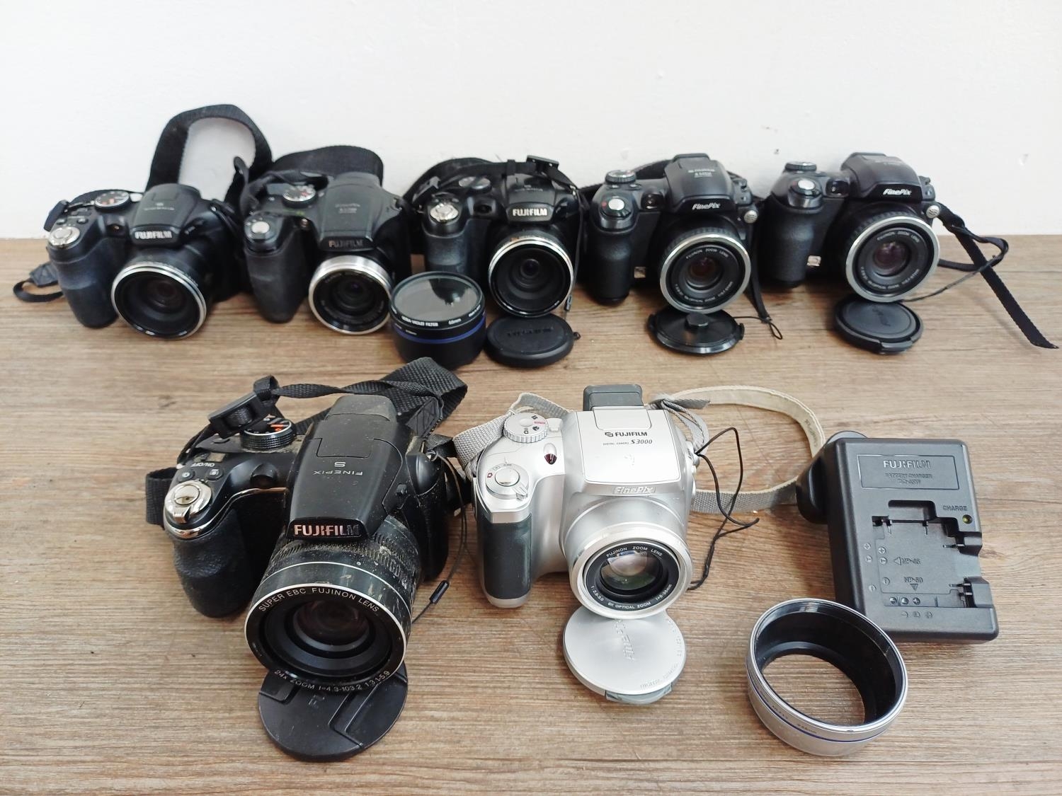 Seven Fujifilm FinePix digital bridge cameras, S4200 14mp, S3000 3mp, S1600 12mp, S5700 7.1mp, S1800 12mp and two S5000 3mp together with Fujifilm BC-45W charger