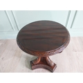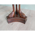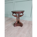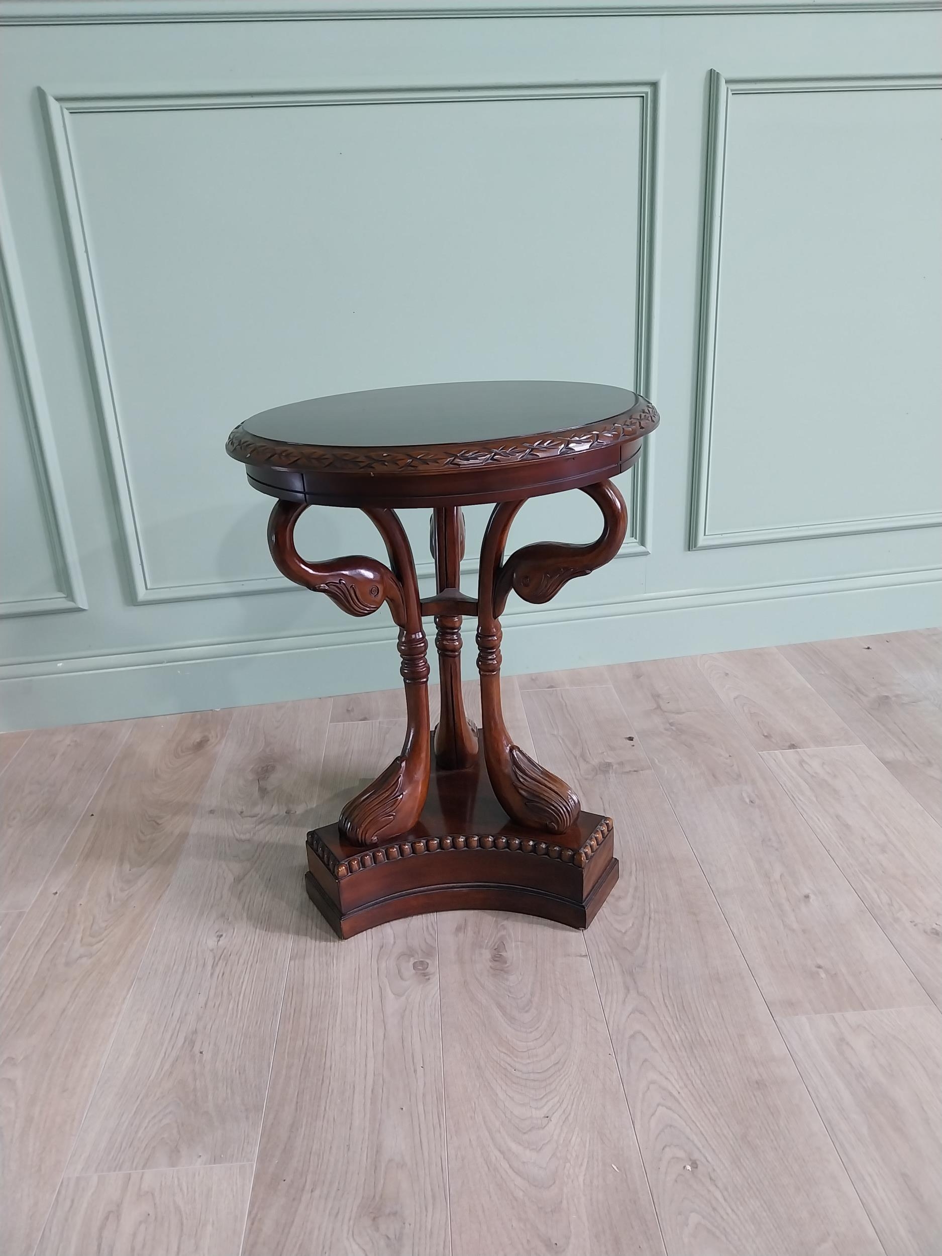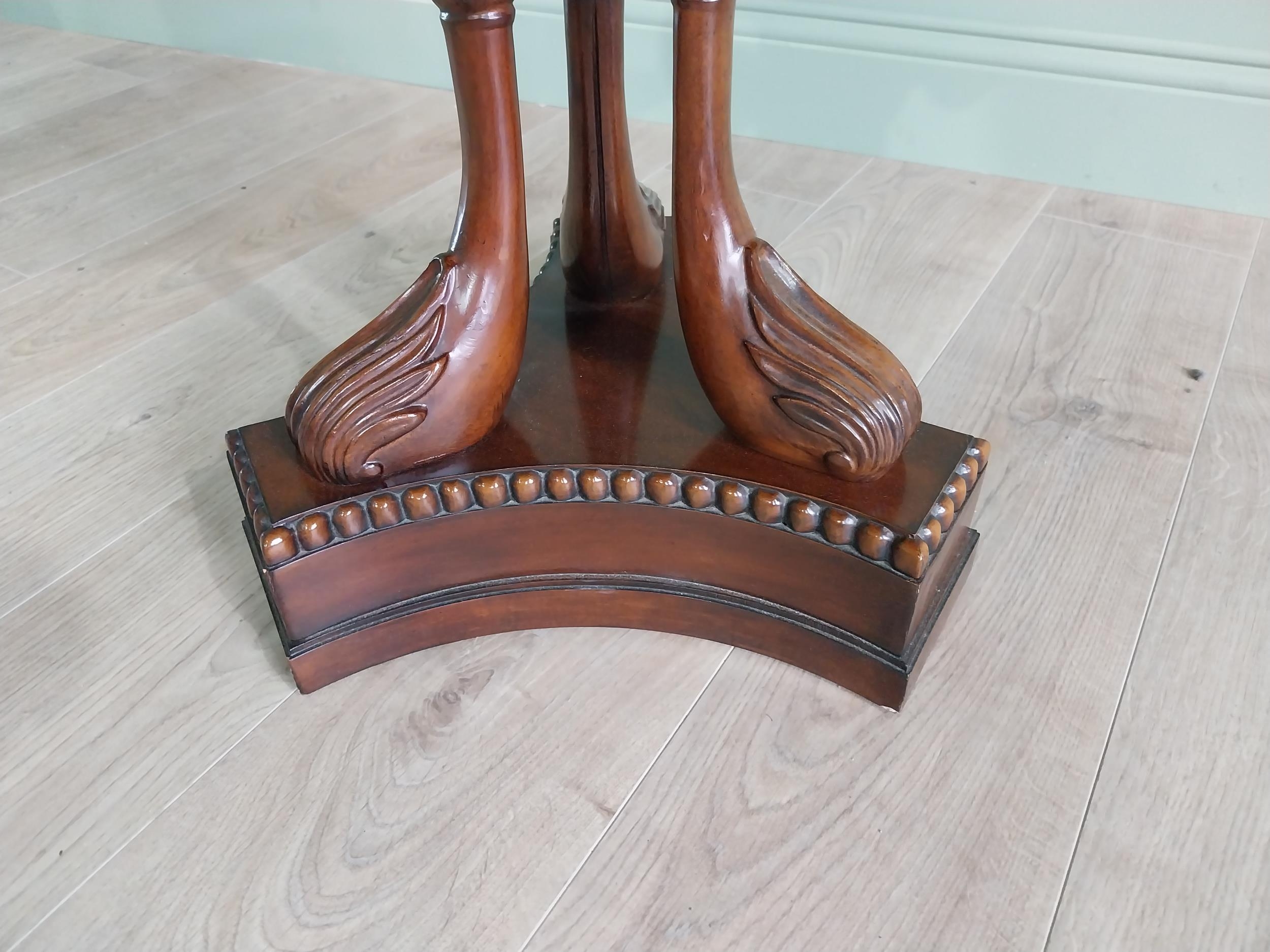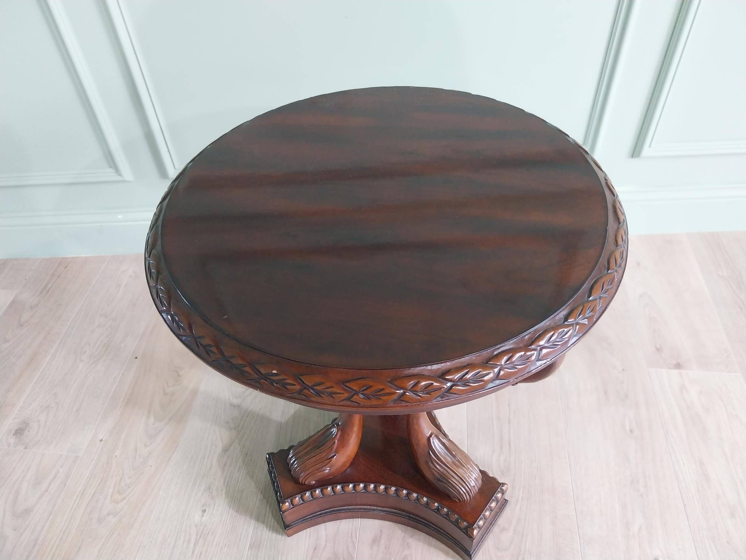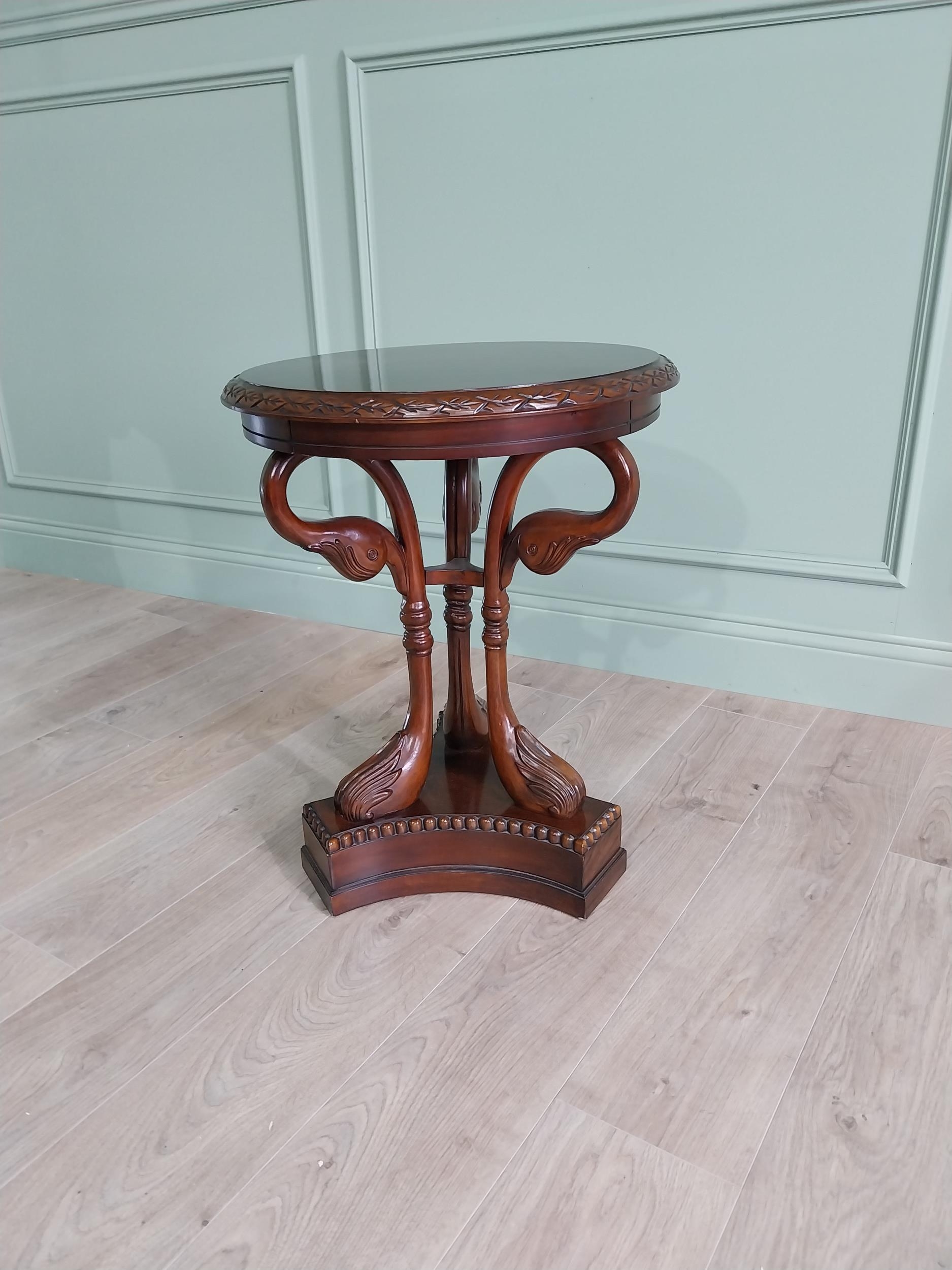 Good quality mahogany lamp table raised on carved swan neck columns and platform base {65 cm H x 61 cm Dia.}.