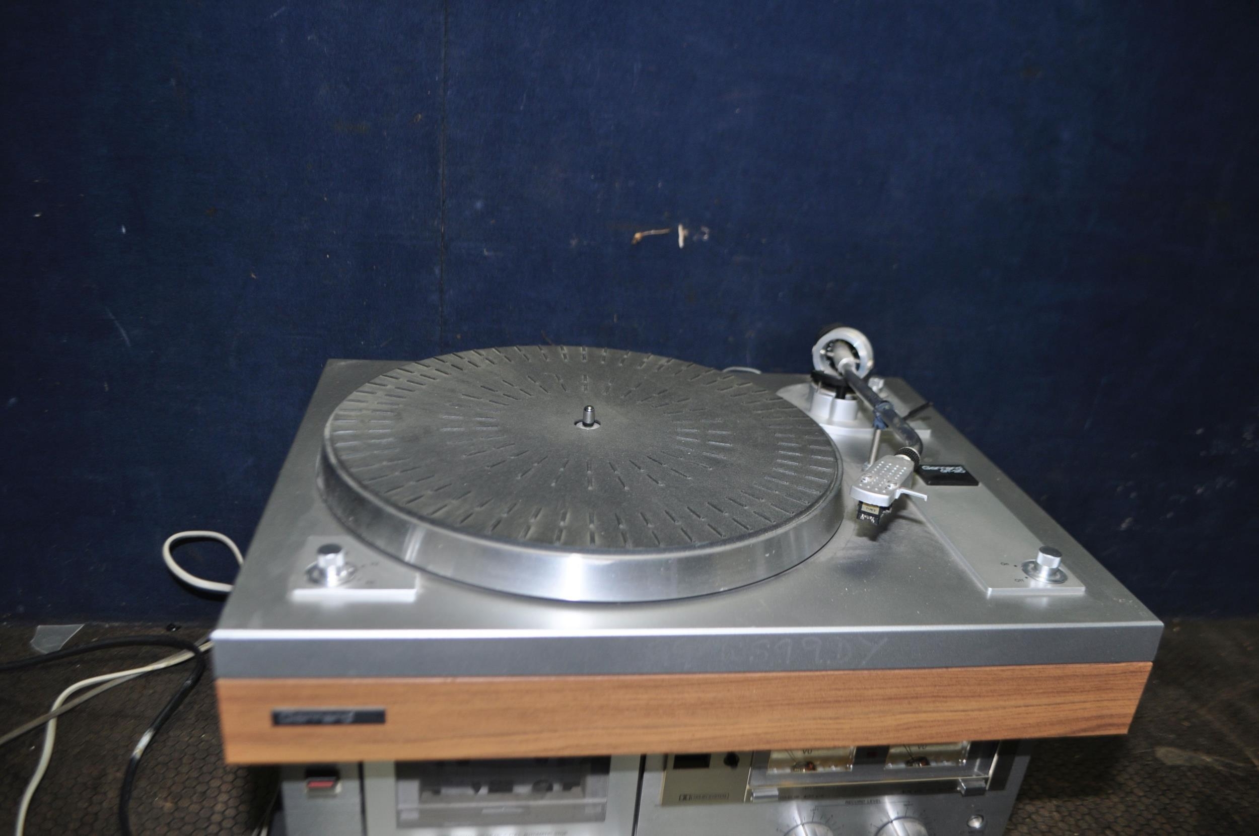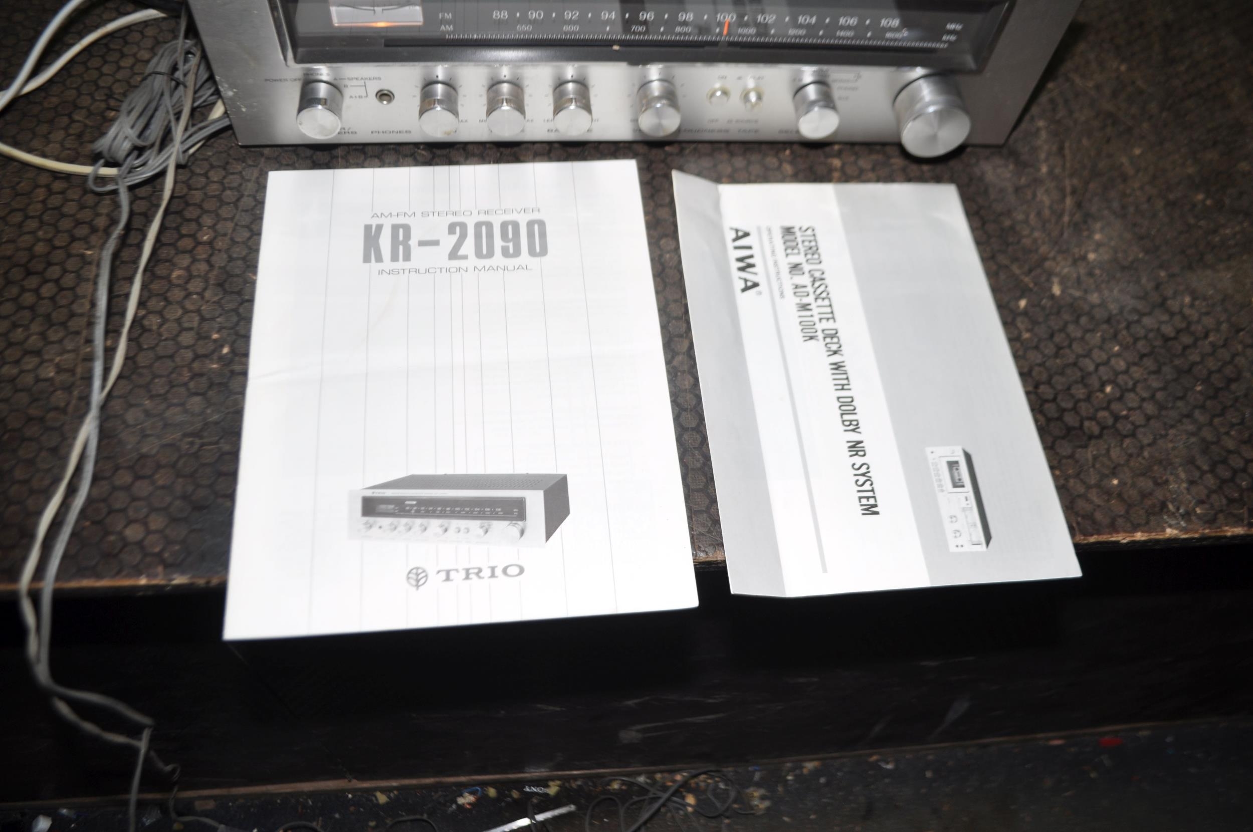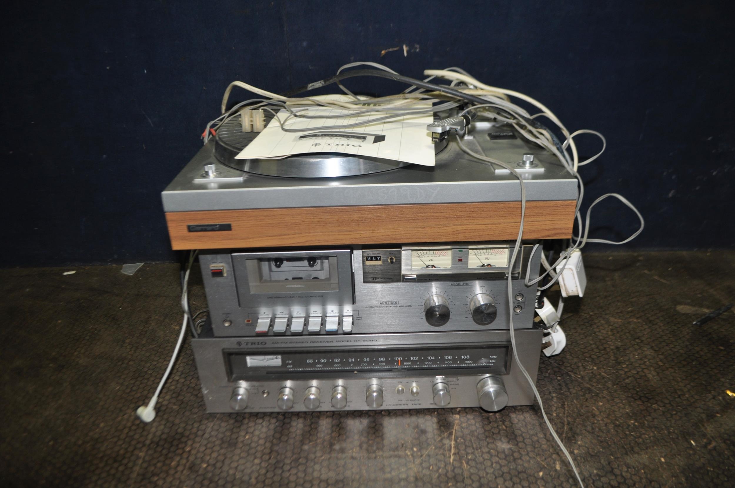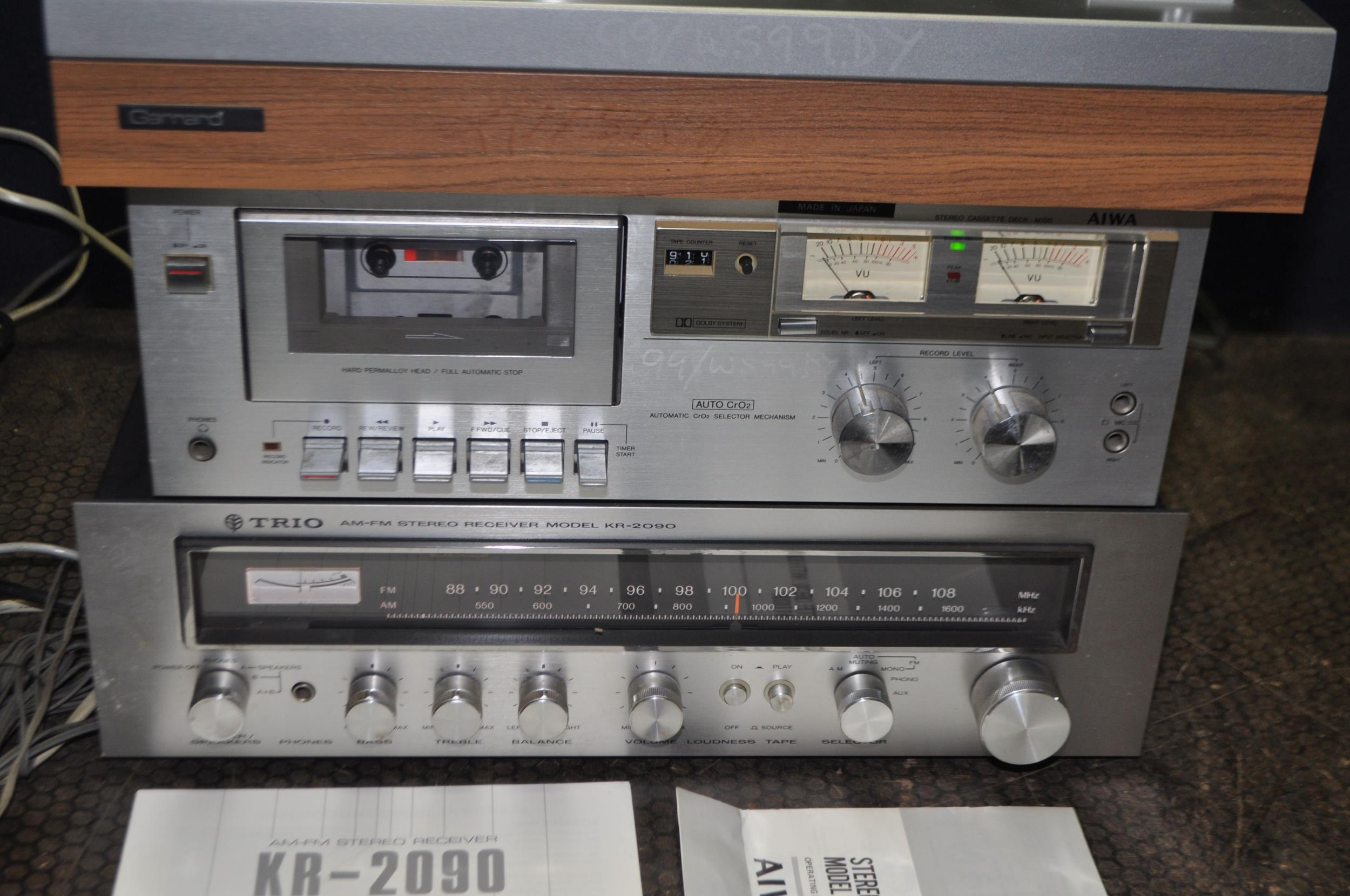 A VINTAGE COMPONENT HI FI comprising of a Garrard GT-20 turntable (new needle required), a Trio KR-2090 Stereo receiver and an Aiwa M100 tape deck (tape doesn't turn) (all PAT fail due to uninsulated plugs but working unless stated) (3)