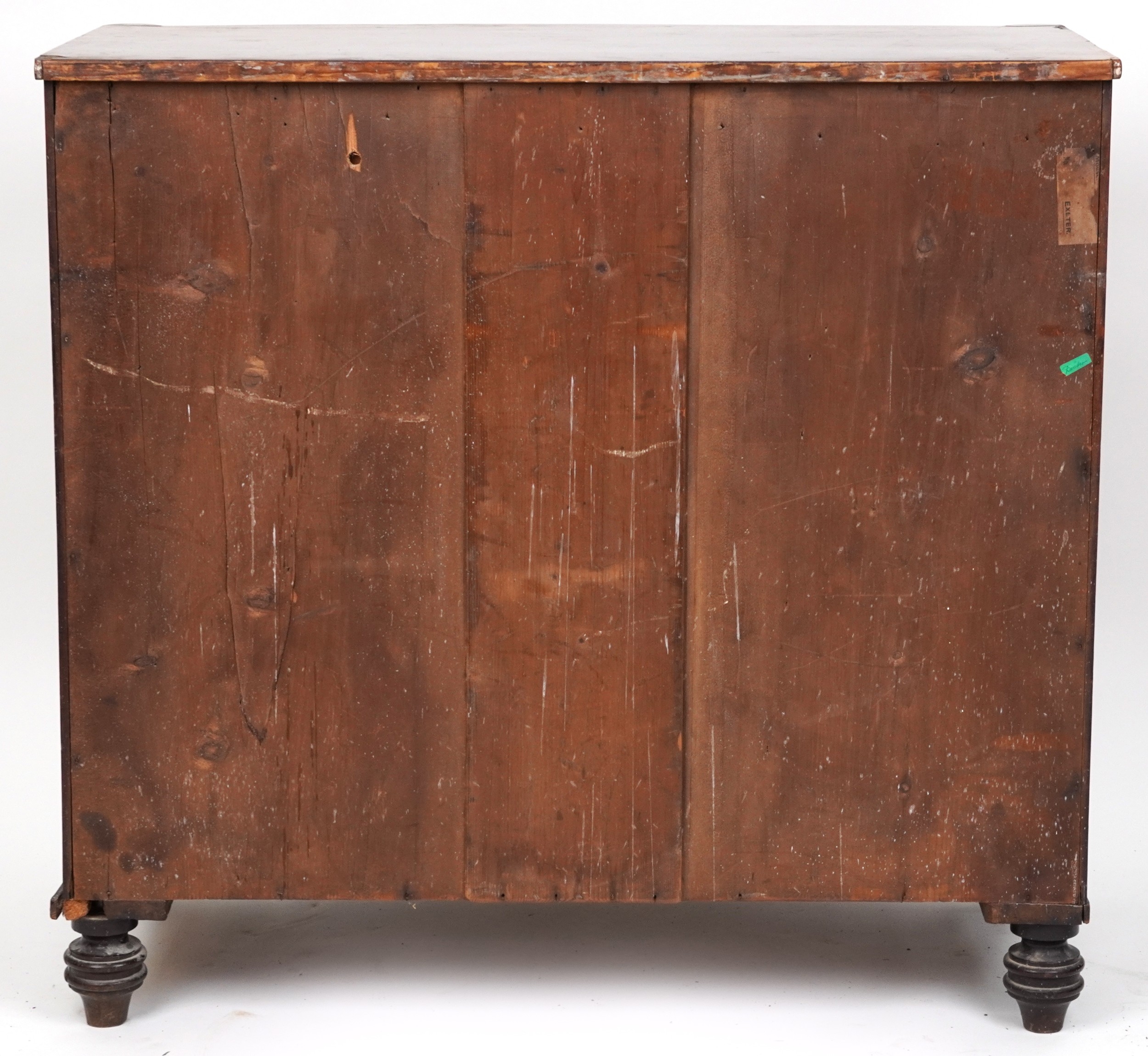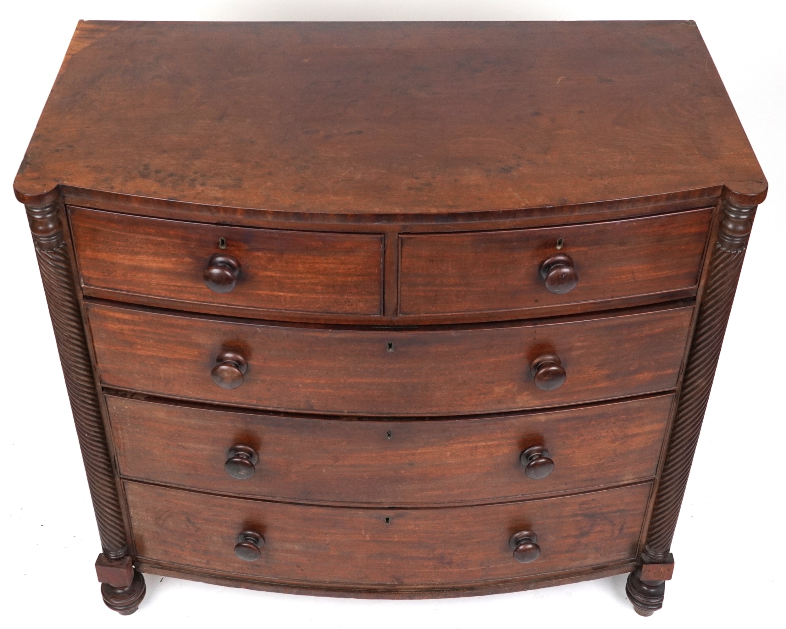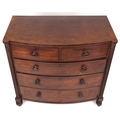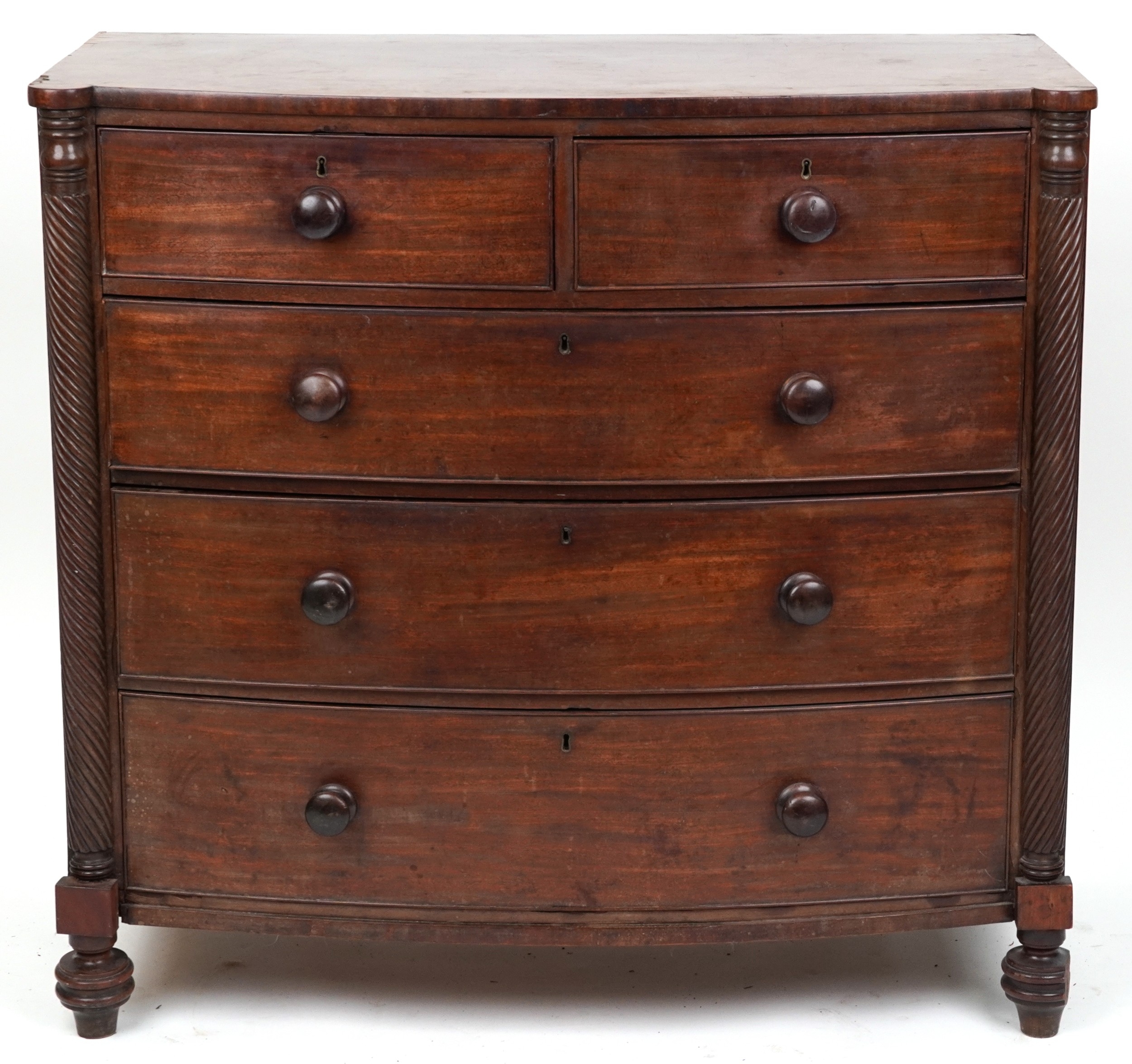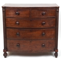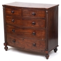 An early 19th century mahogany bow front chest of two short and three graduated long drawers, on turned feet, 103cm H x 108cm W x 57cm D.