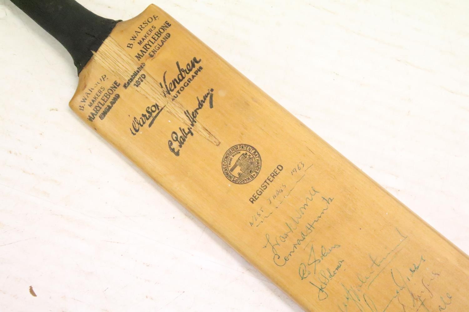 Sports memorabilia - A cricket bat signed by the West Indies 1963 cricket team, as well as the Worcester, Middlesex and Sussex cricket teams
