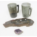 Polished agate slab formed into a bowl with natural rough outer edge, 33cm long together with two Brazilian Ouro Preto stone tankards and an amethyst geode cluster, 17cm high (please note VAT will be payable on the hammer)