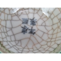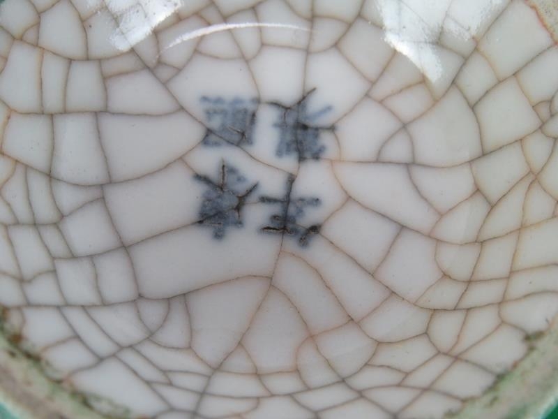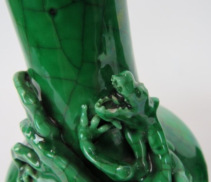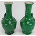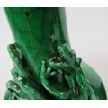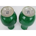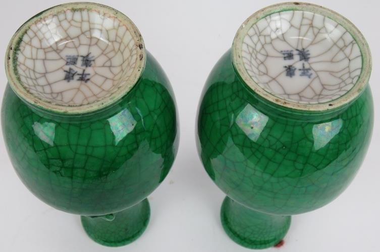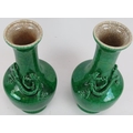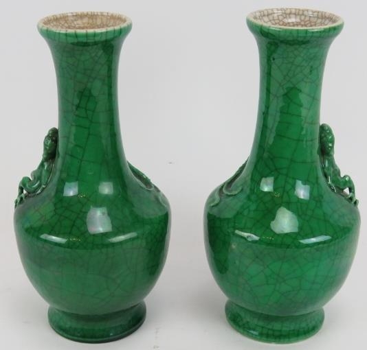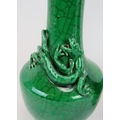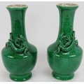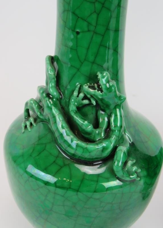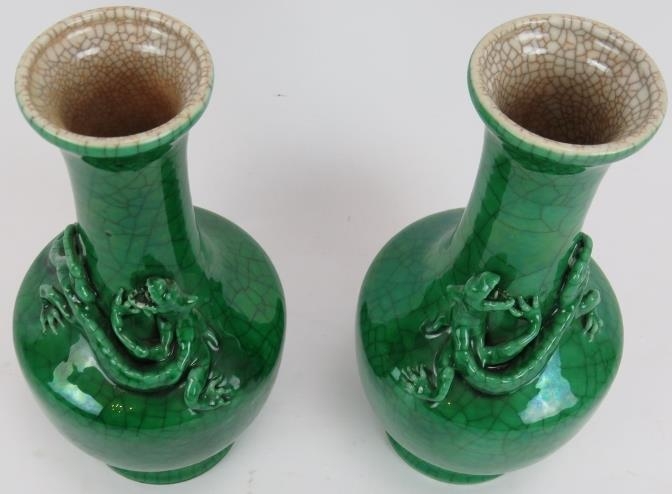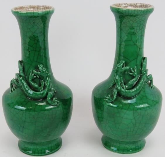 A pair of 20th century Chinese green crackle glaze baluster vases with applied dragon decoration. Four character marks to base. Height 22.5cm. (pr).