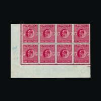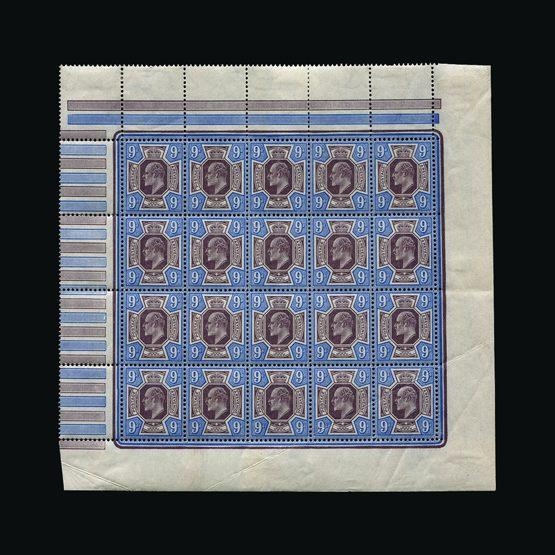 Great Britain - KEVII : 1911-13 SH 9d slate-purple and deep ultramarine, ordinary paper, lower right complete pane of 20, with sheet/interpane margins on all 4 sides, natural paper inclusion on one stamp (R3/5), diagonal gum crease at SE corner affects 3 stamps, wonderfully fresh, stamps u.m. SG Spec. M39(3). Stated to be from plates H2H/D2H. Cat. £6000 incl. premiums for blocks of 4. Very scarce. (image available) [US4]