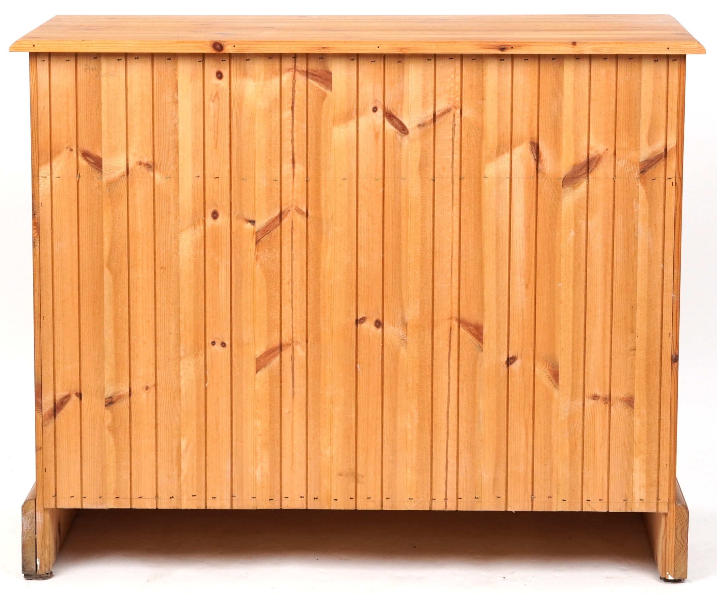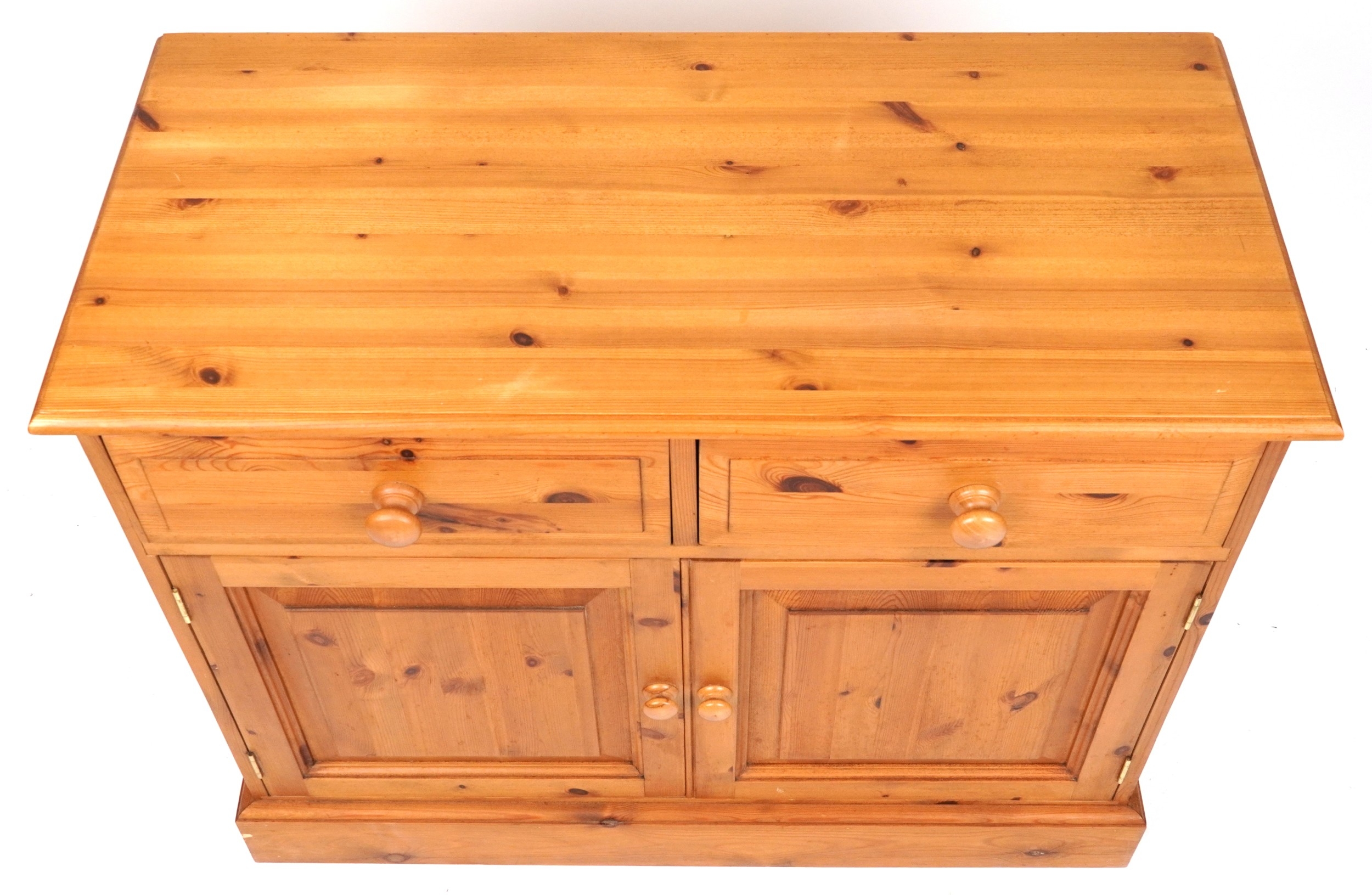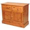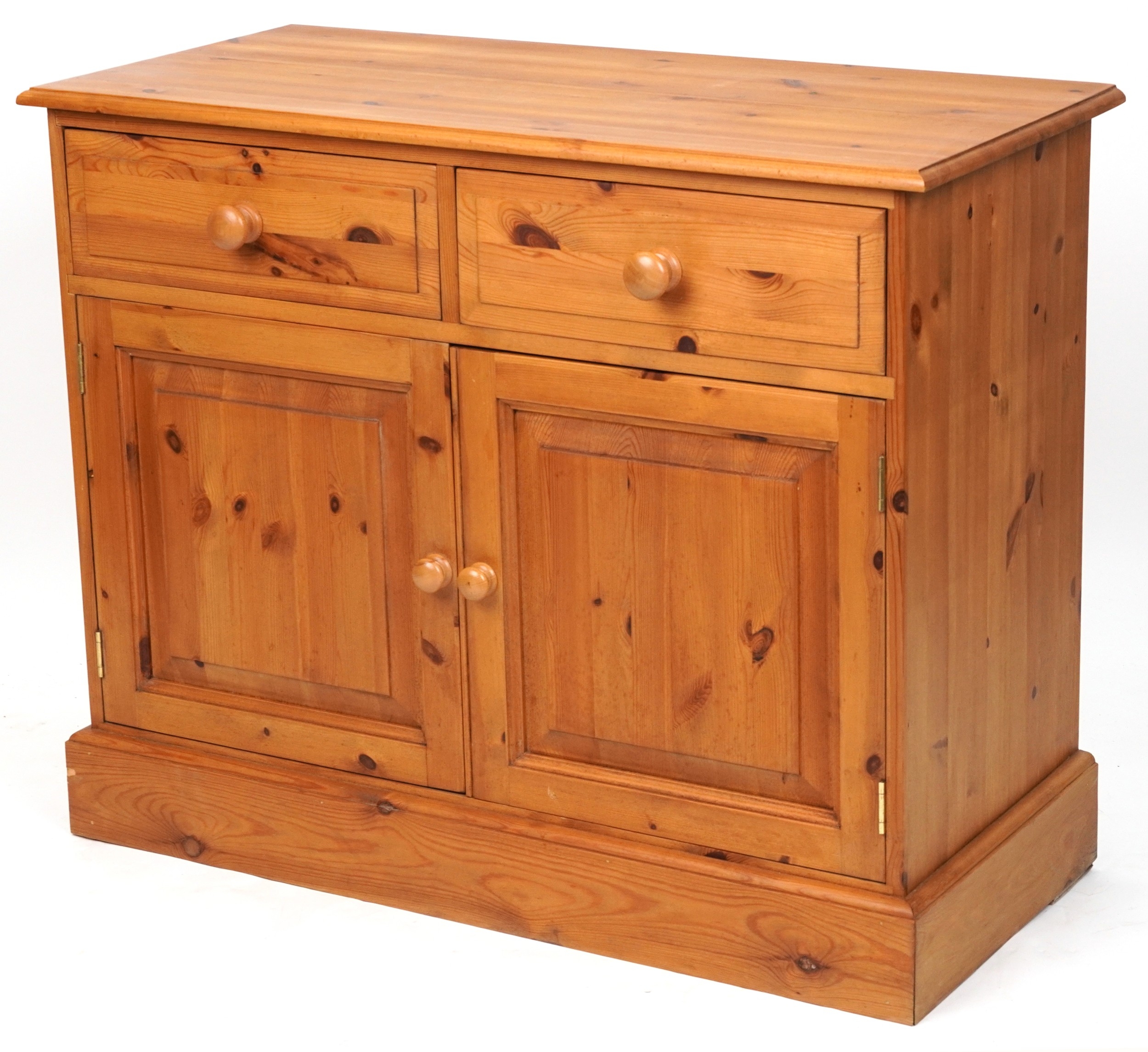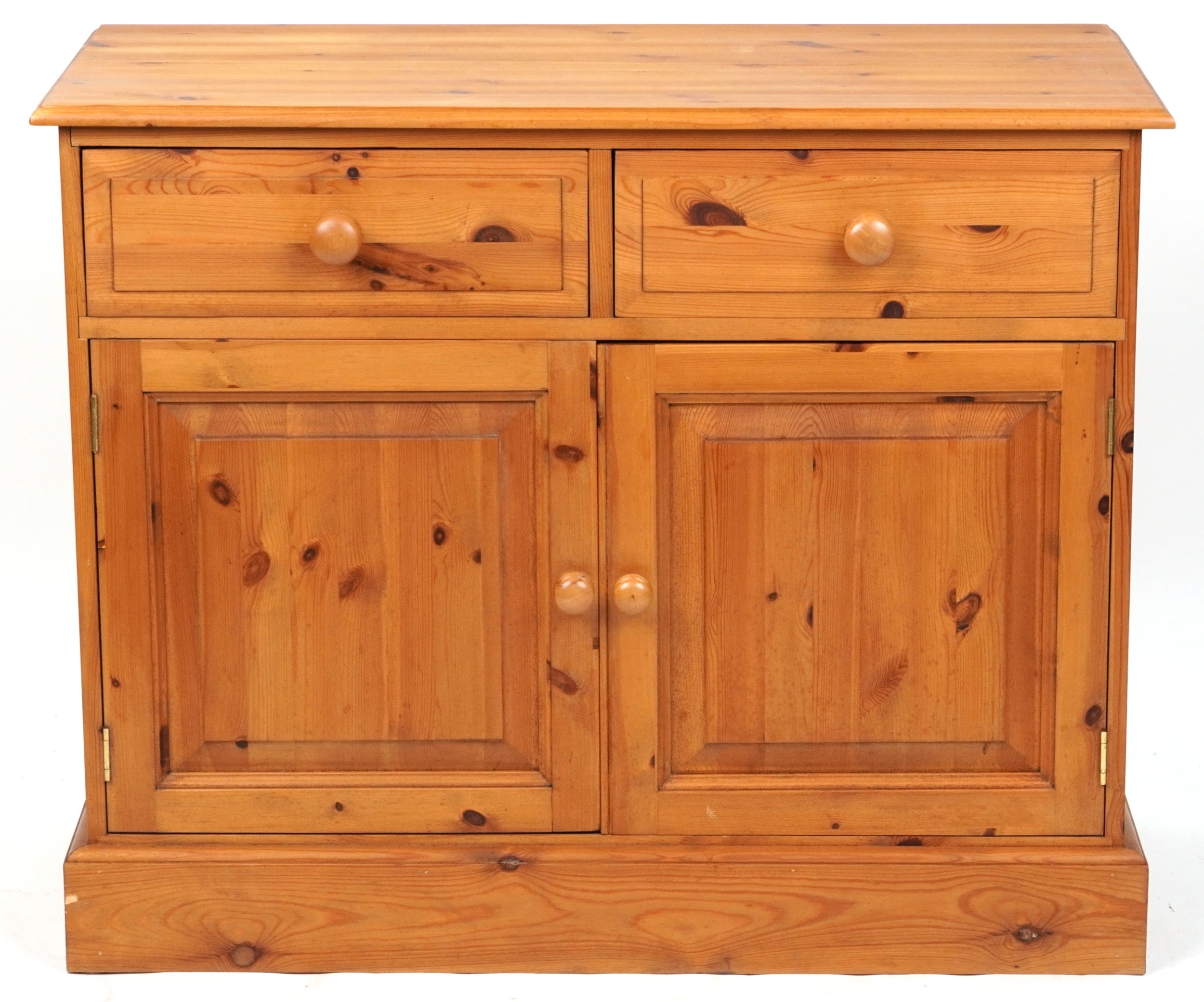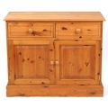 A late 20th century pine side cabinet fitted with two drawers and cupboards, on a plinth base, 81cm H x 101cm W x 47cm D.