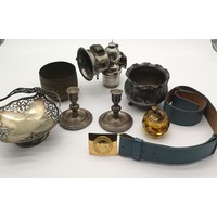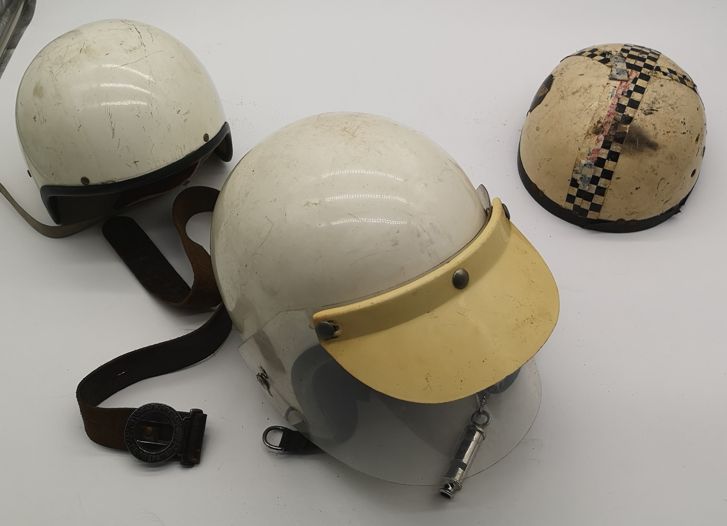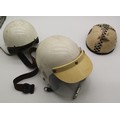 Three Vintage Helmets, to include Vintage Belt and Whistle.