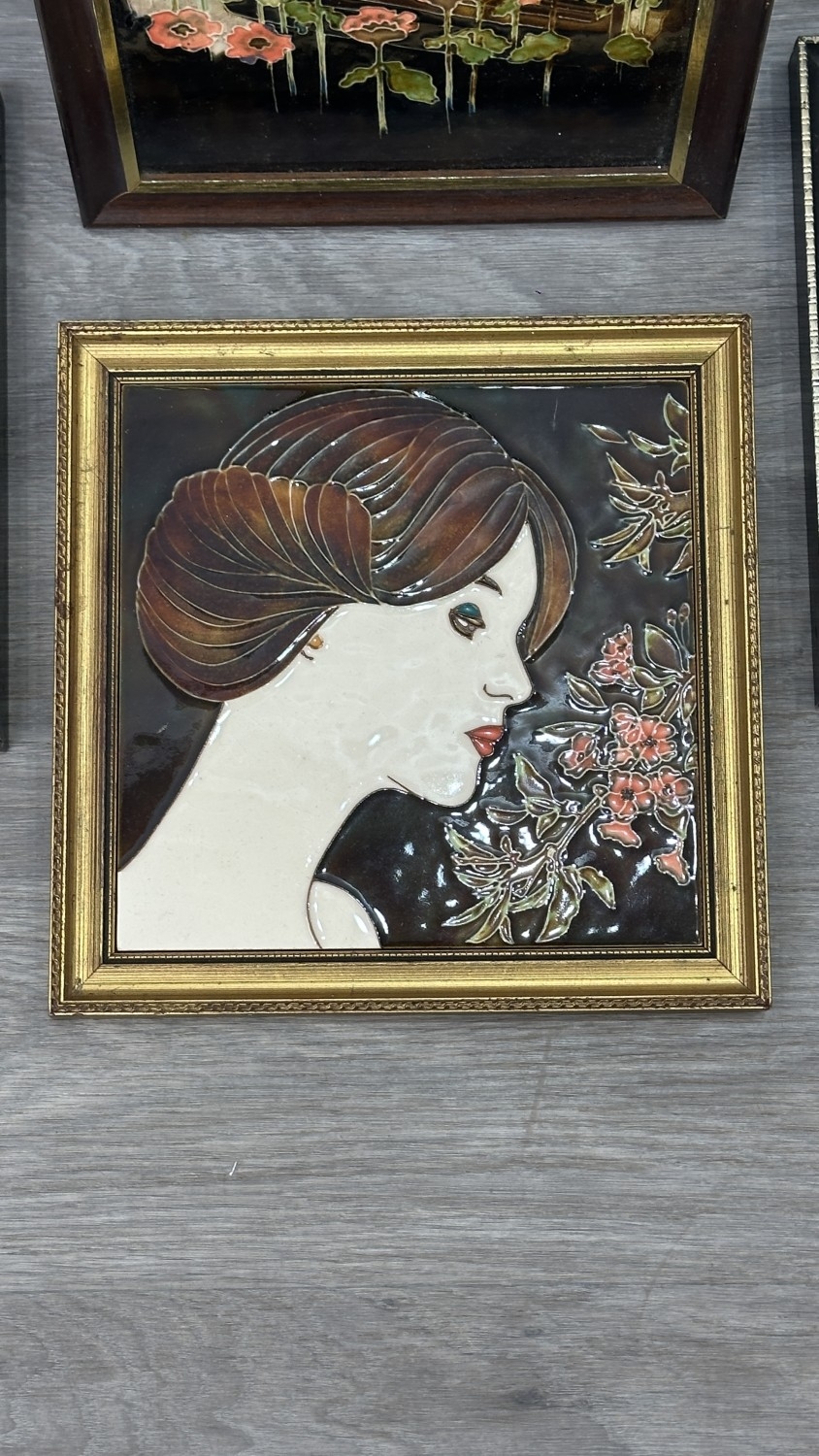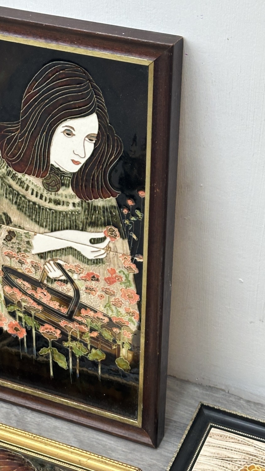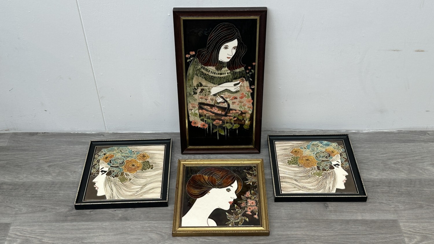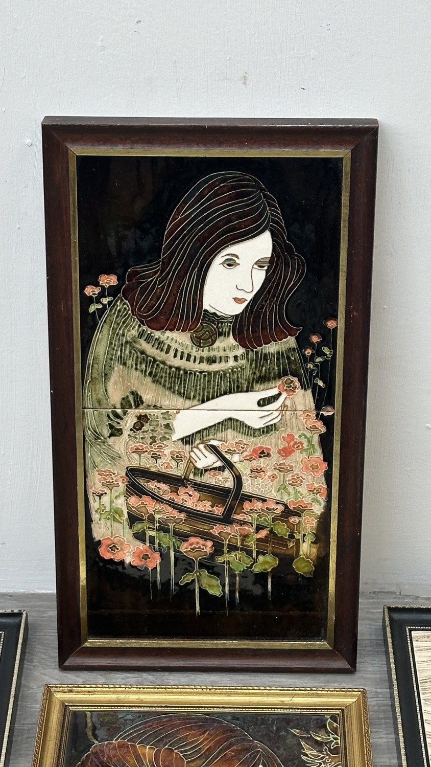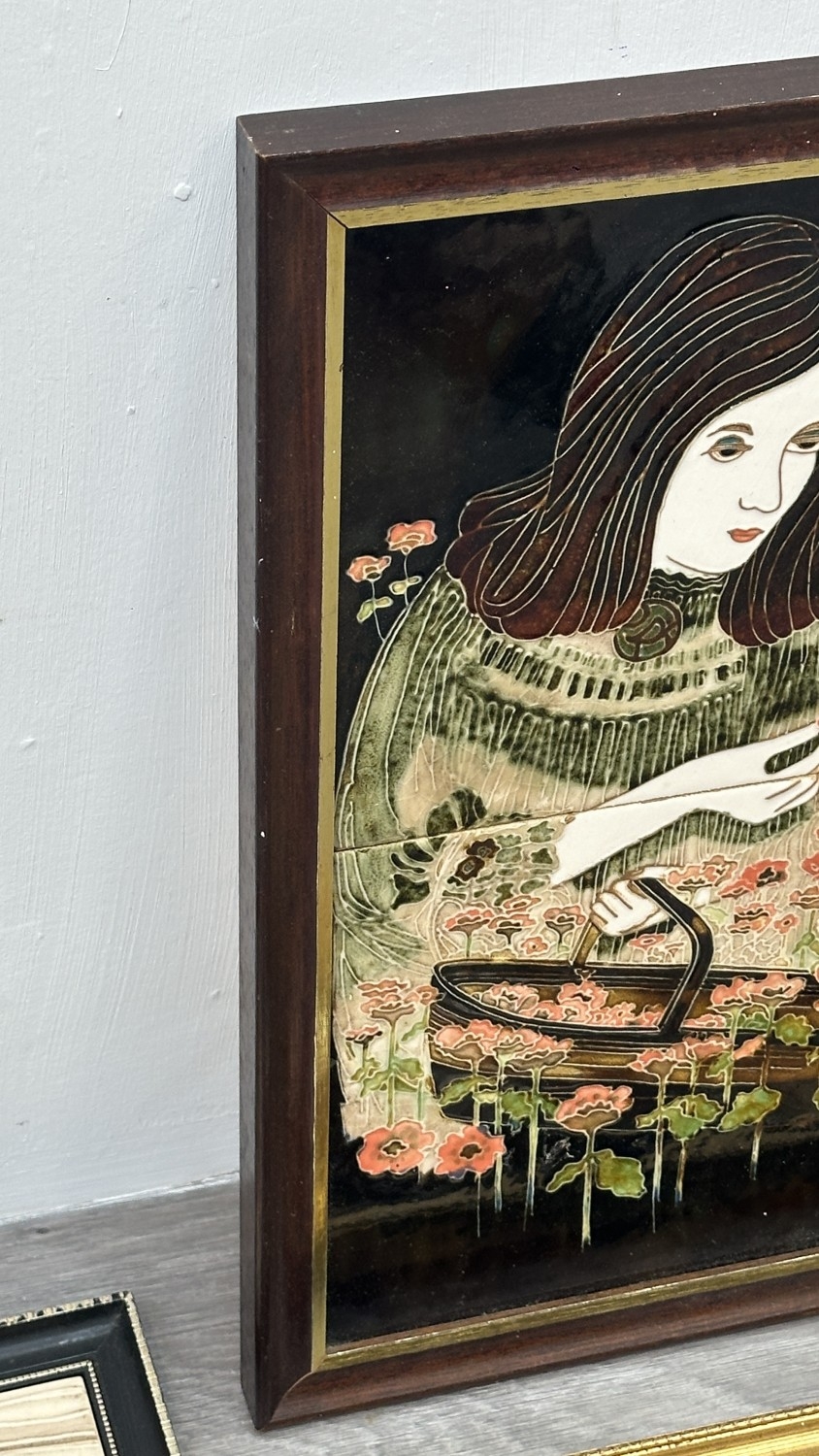Four framed hand painted ceramic tubelined tile wall plaques, two Maw & Co. Art Nouveau style, one Art Nouveau style possibly by Maw & Co. and one unbranded depicting lady and flower basket - largest approx. 44cm high x 24cm wide