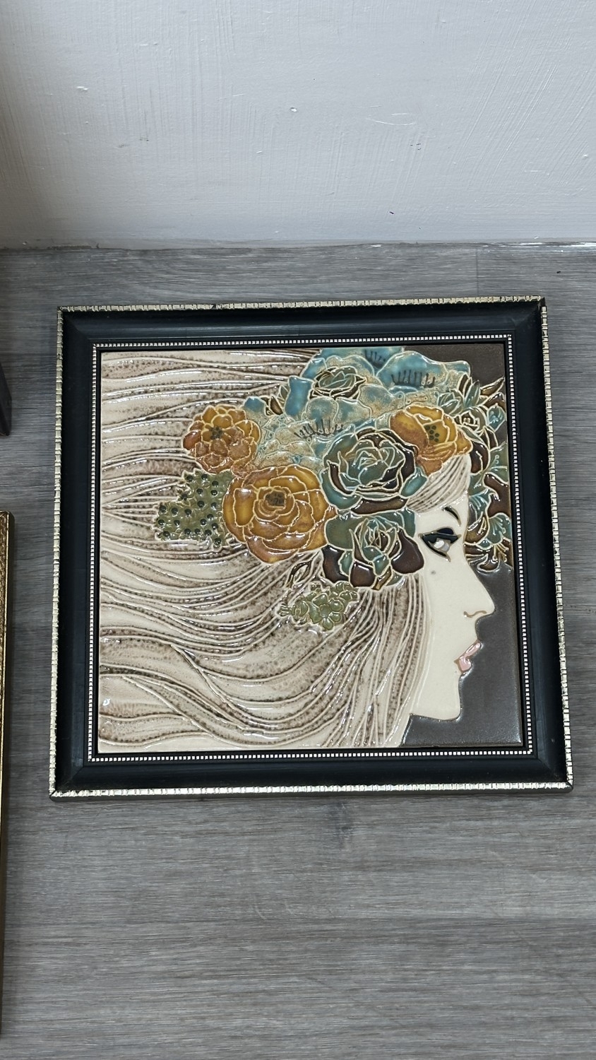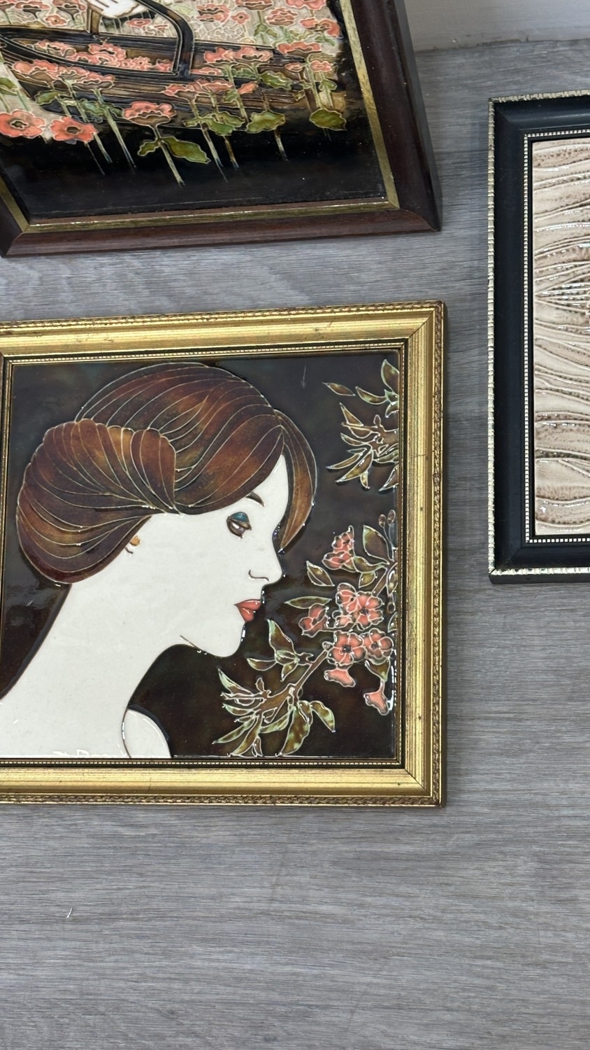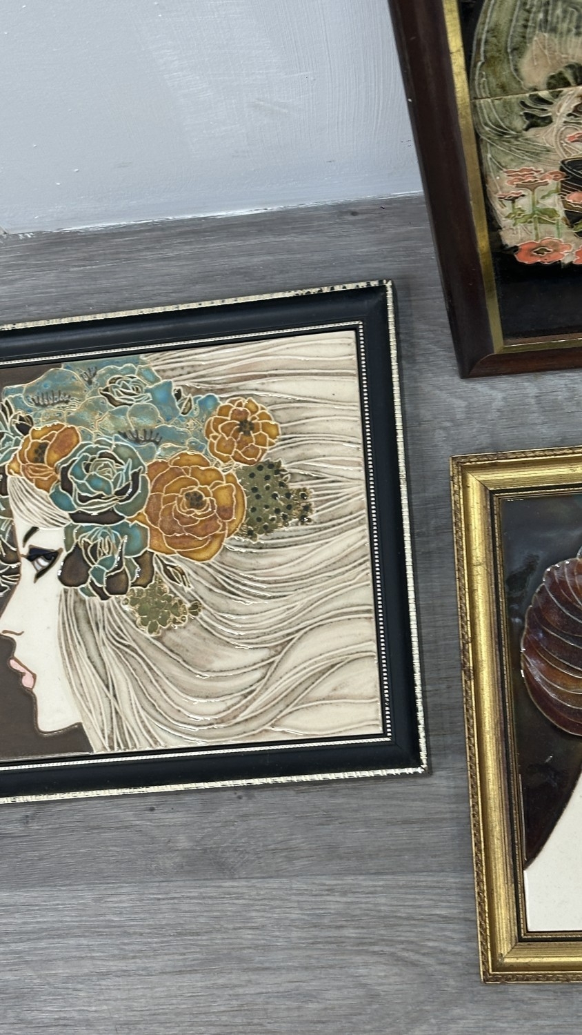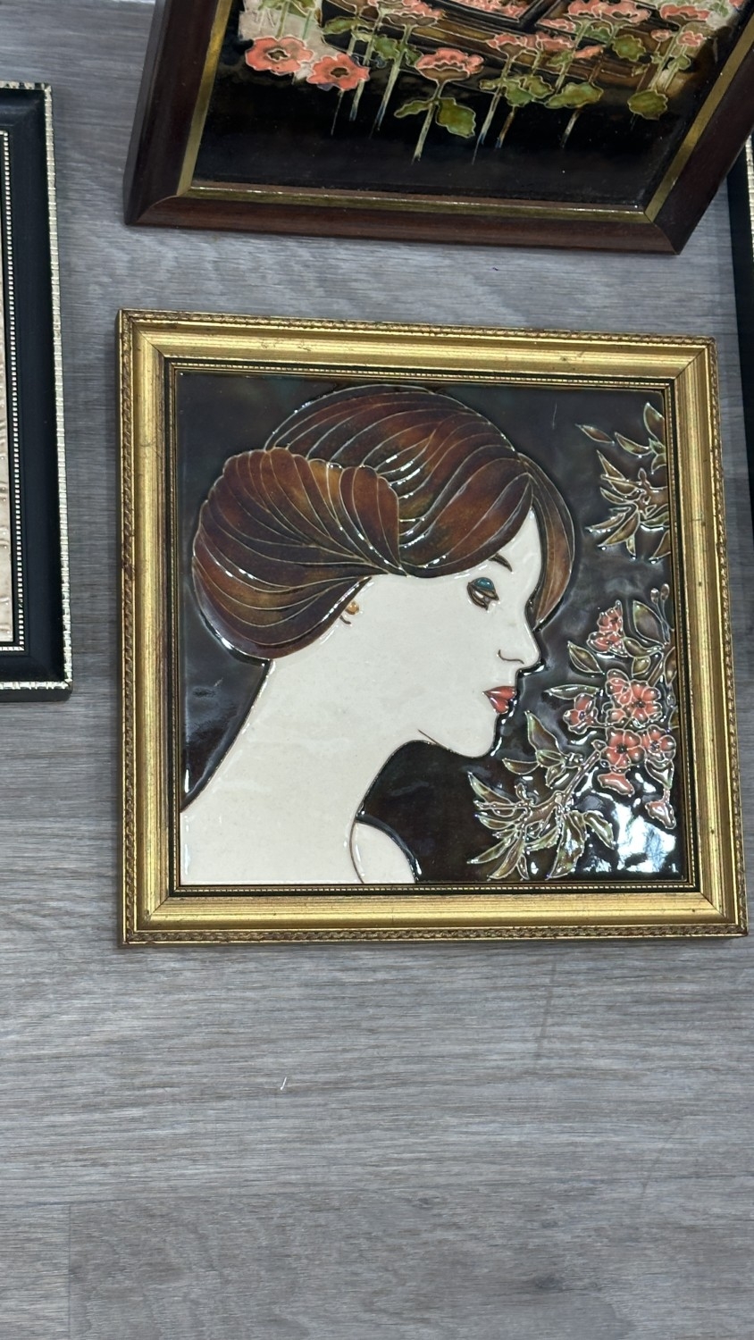 Four framed hand painted ceramic tubelined tile wall plaques, two Maw & Co. Art Nouveau style, one Art Nouveau style possibly by Maw & Co. and one unbranded depicting lady and flower basket - largest approx. 44cm high x 24cm wide