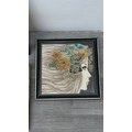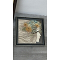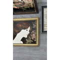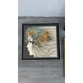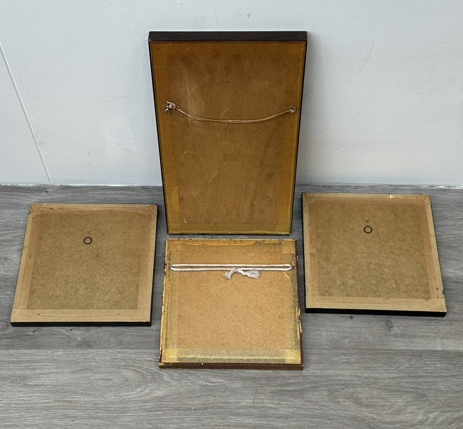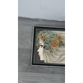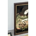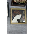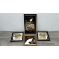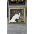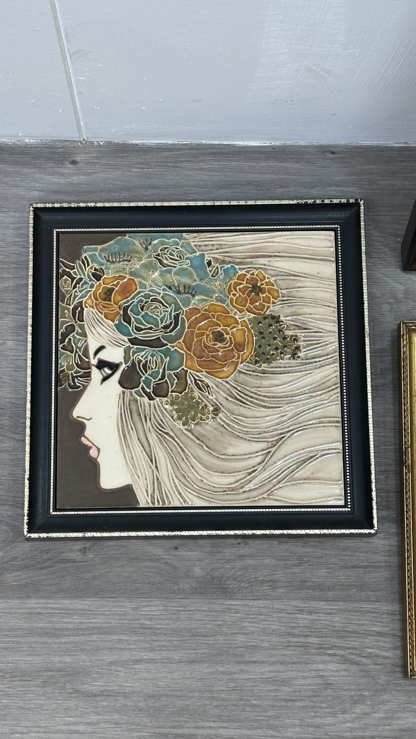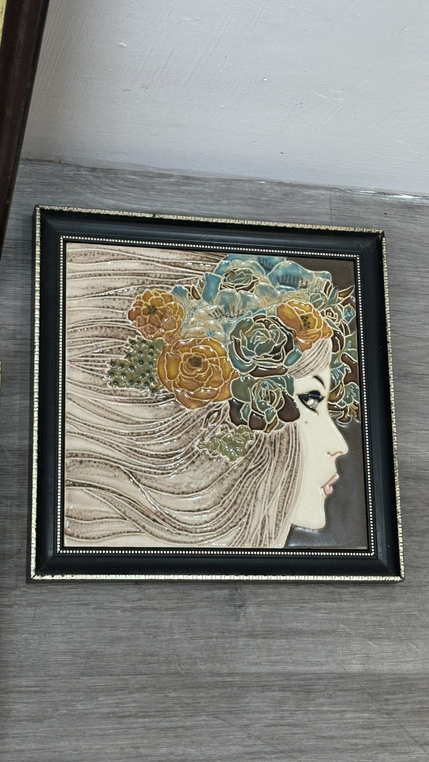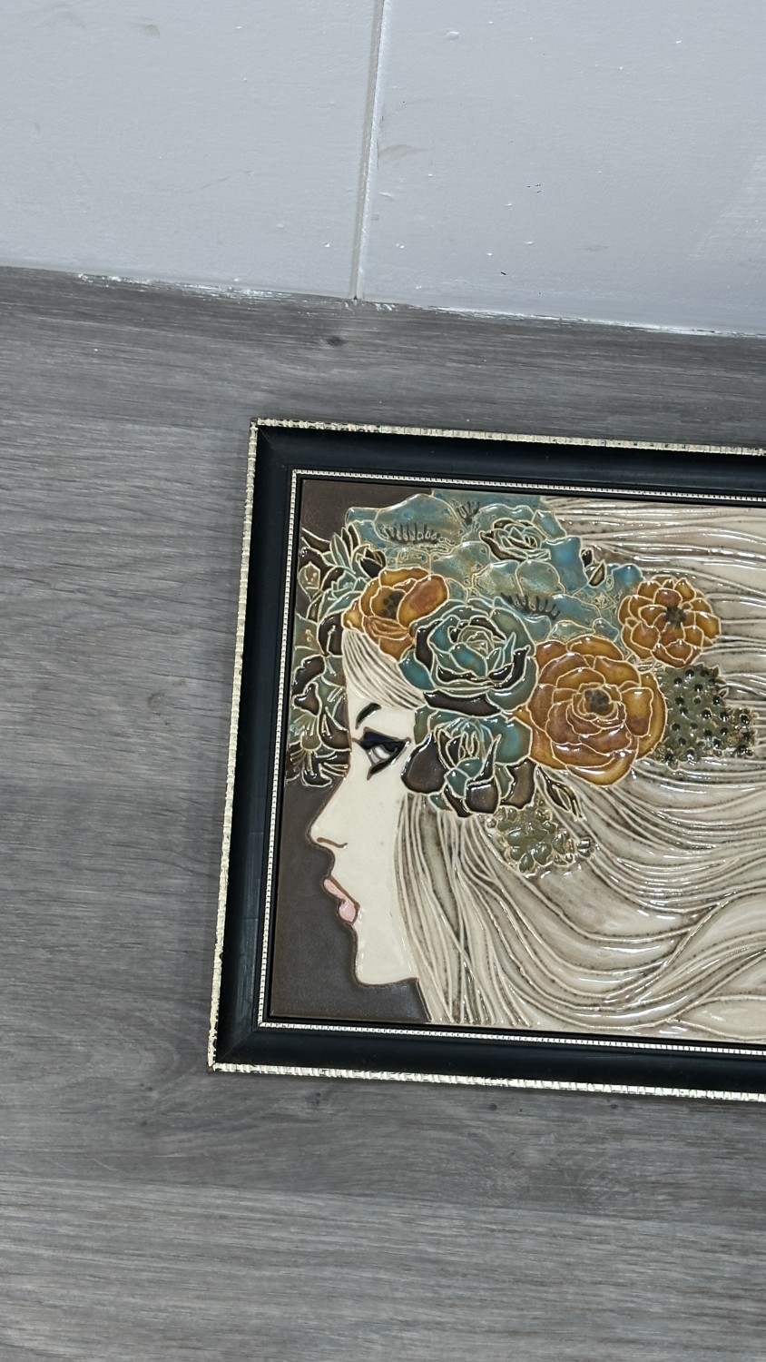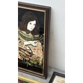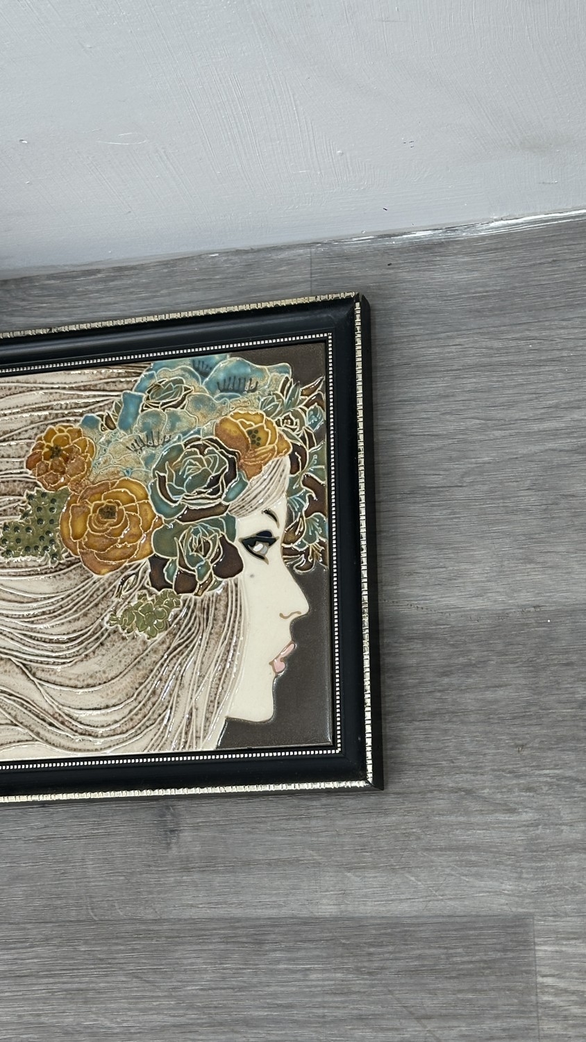 Four framed hand painted ceramic tubelined tile wall plaques, two Maw & Co. Art Nouveau style, one Art Nouveau style possibly by Maw & Co. and one unbranded depicting lady and flower basket - largest approx. 44cm high x 24cm wide