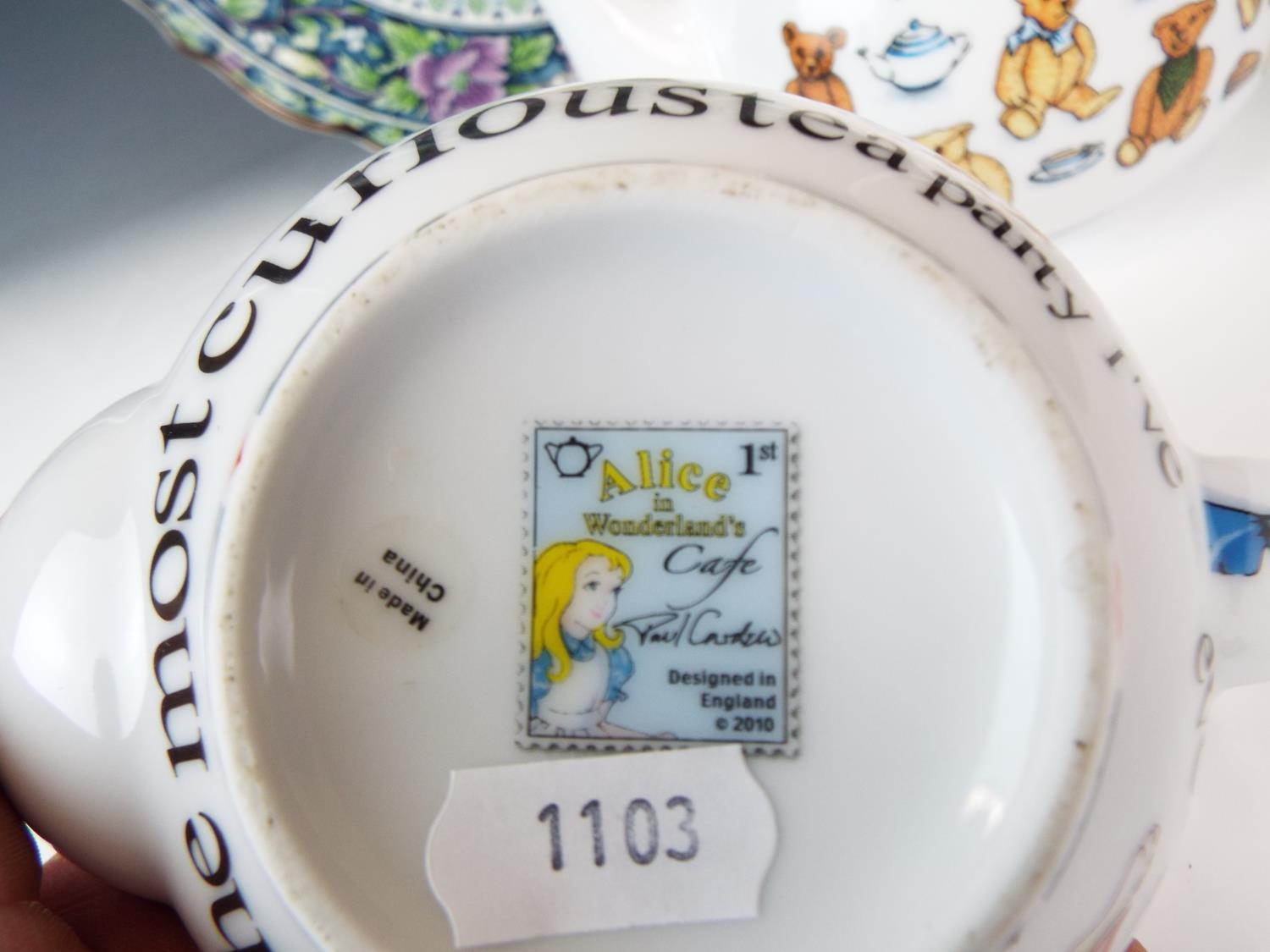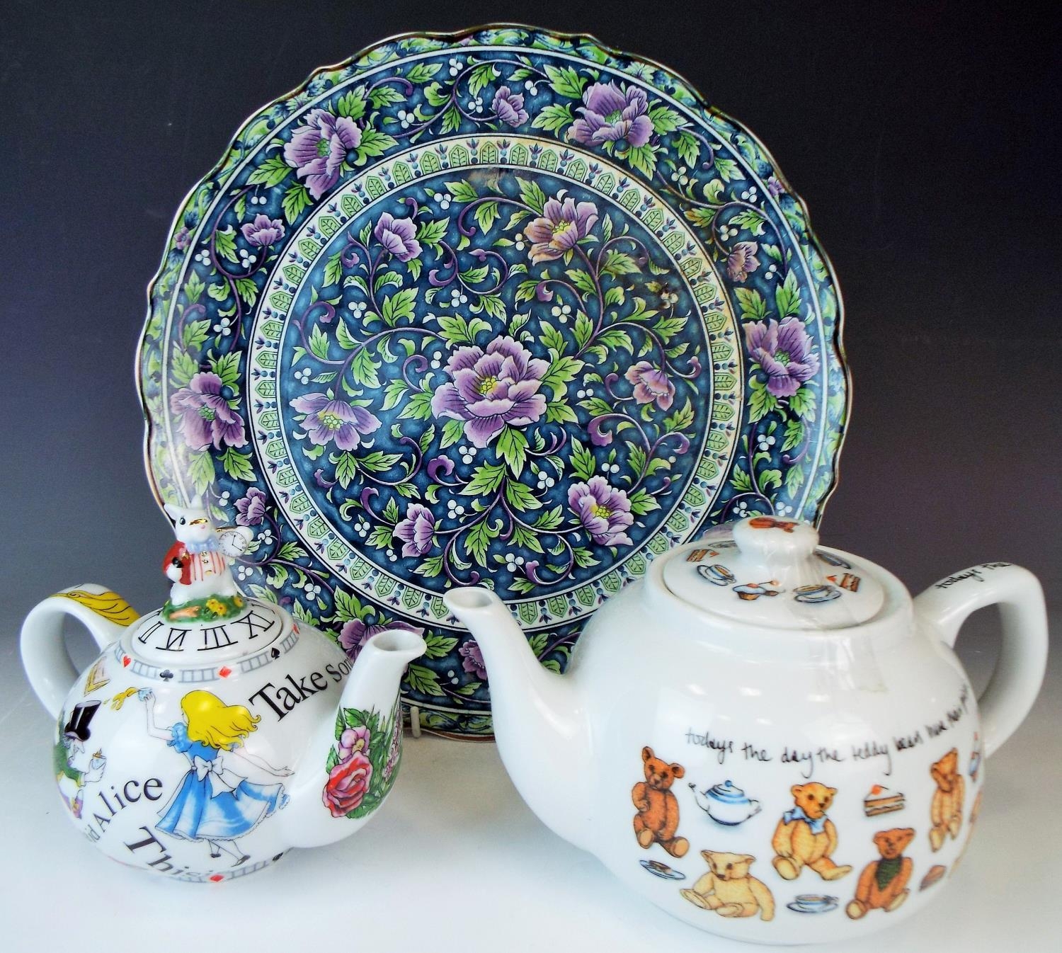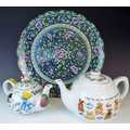 Large and pretty Japanese plate. 13 inches in diameter plus two decorative teapots by Paul Cardew. See photos