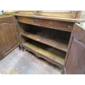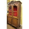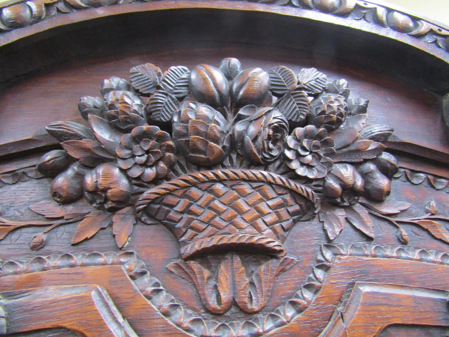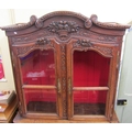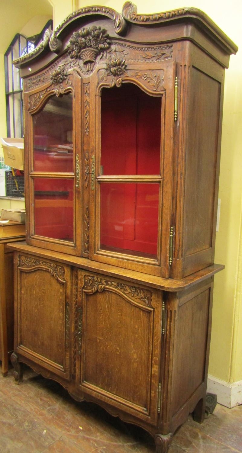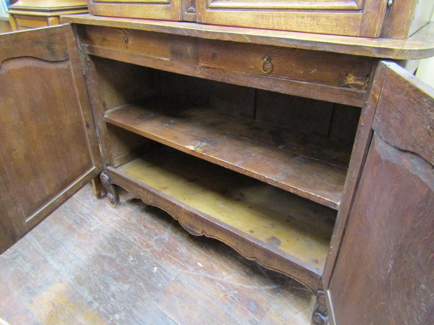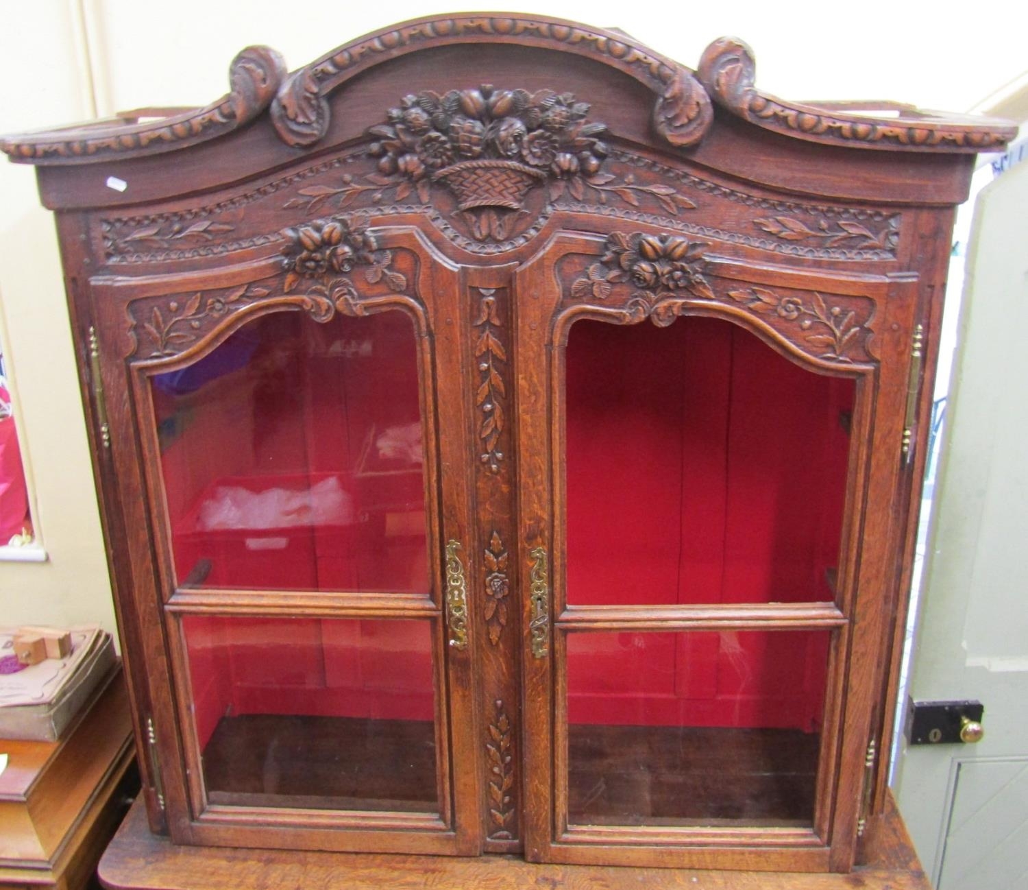 19th century French oak cabinet, the lower section enclosed by two carved and panelled doors, the upper section by two glazed panelled doors, set beneath a shaped frieze with applied carved floral bouquet and other trailing detail, with brass fittings raised on short cabriole supports, 140cm wide