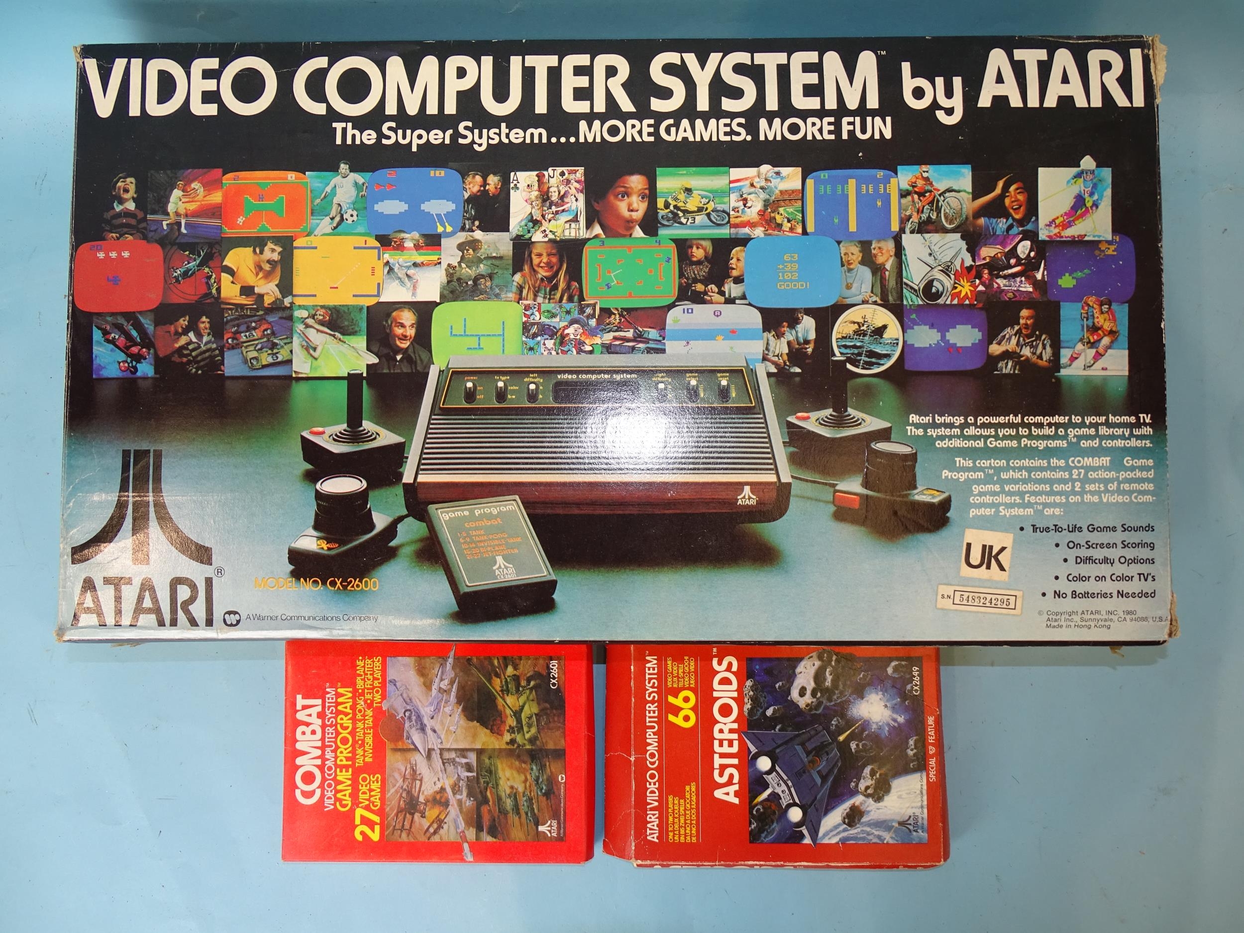 An Atari video computer system, model no. CX-2600, boxed with instructions and two games, 27 'Combat' and 66 'Asteroids'.