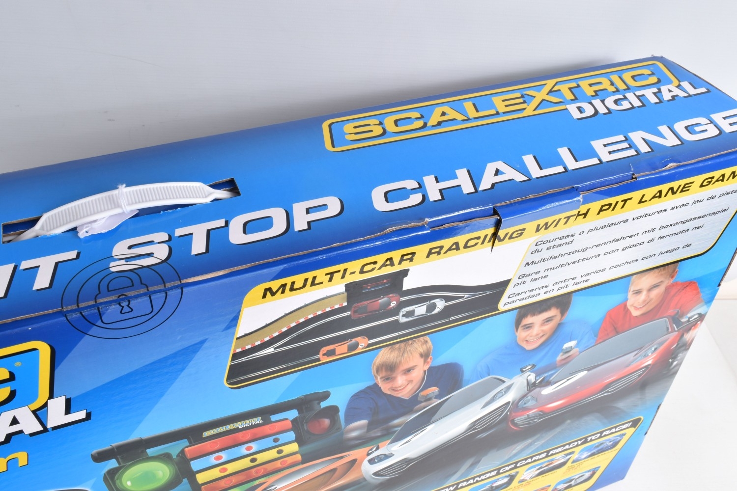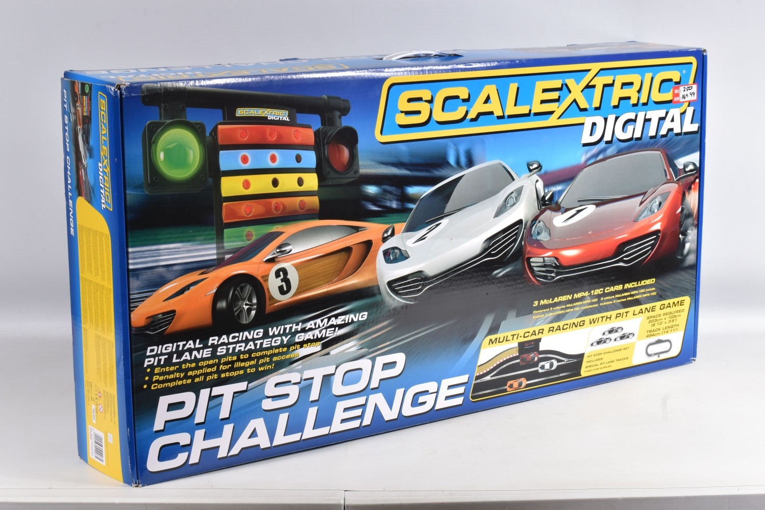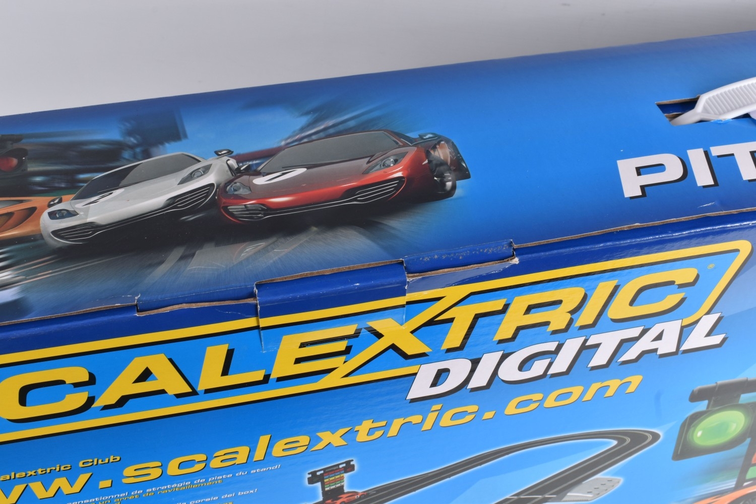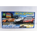 A BOXED HORBY SCALEXTRIC DIGITAL PITSTOP CHALLENGE SET, C1296, set appears new with all parts sealed or segregated within the box, includes all three cars, three triggers, accessories, track and instructions, its polystyrene internal packaging in perfect condition, and its outer cardboard box with carry handle with only some light wear and slightly turned up edges