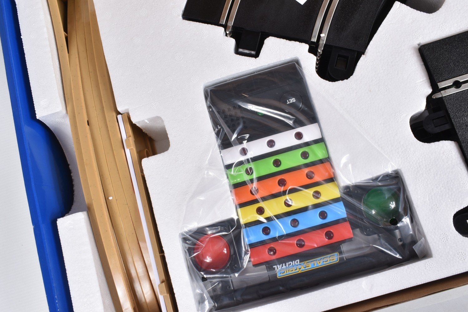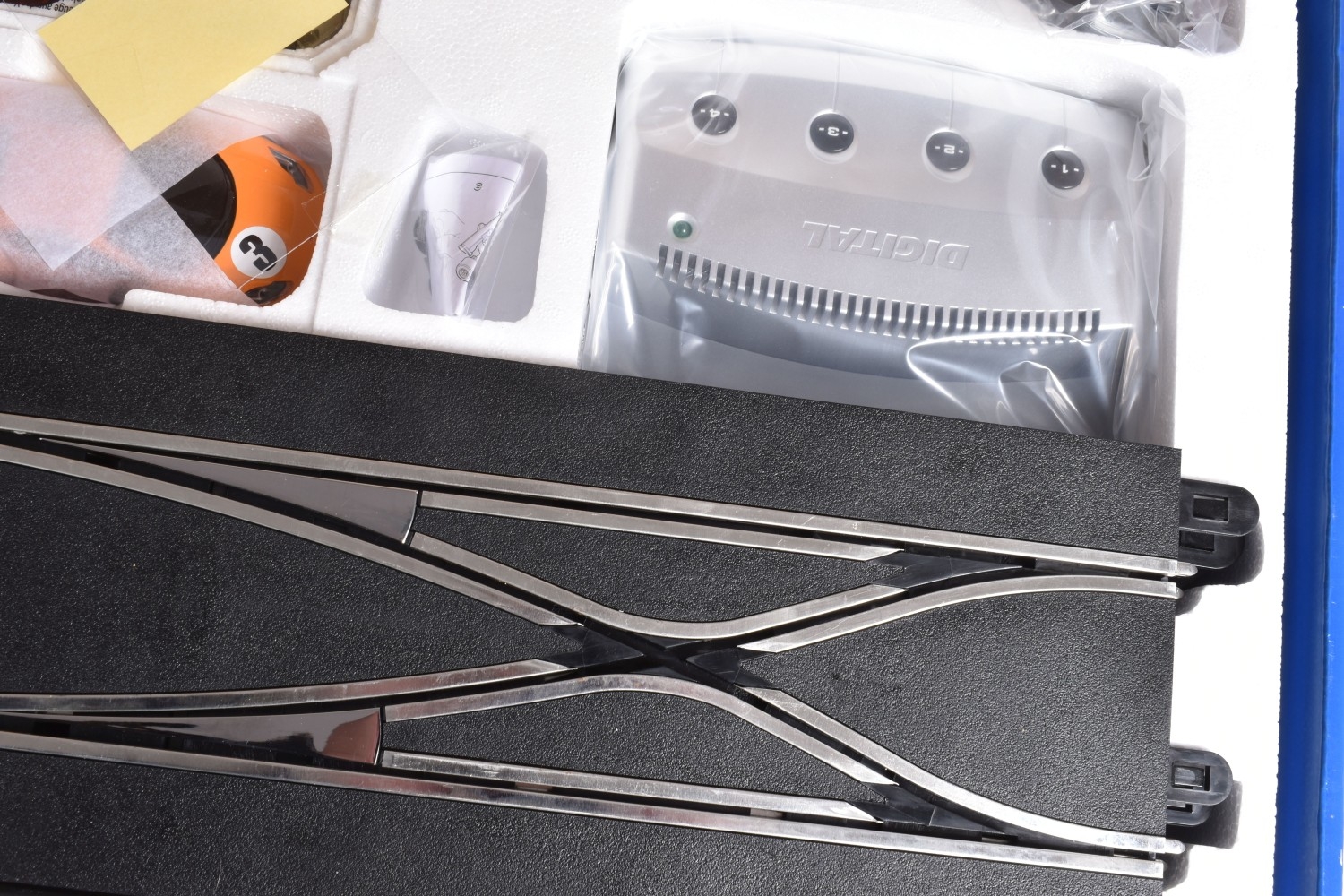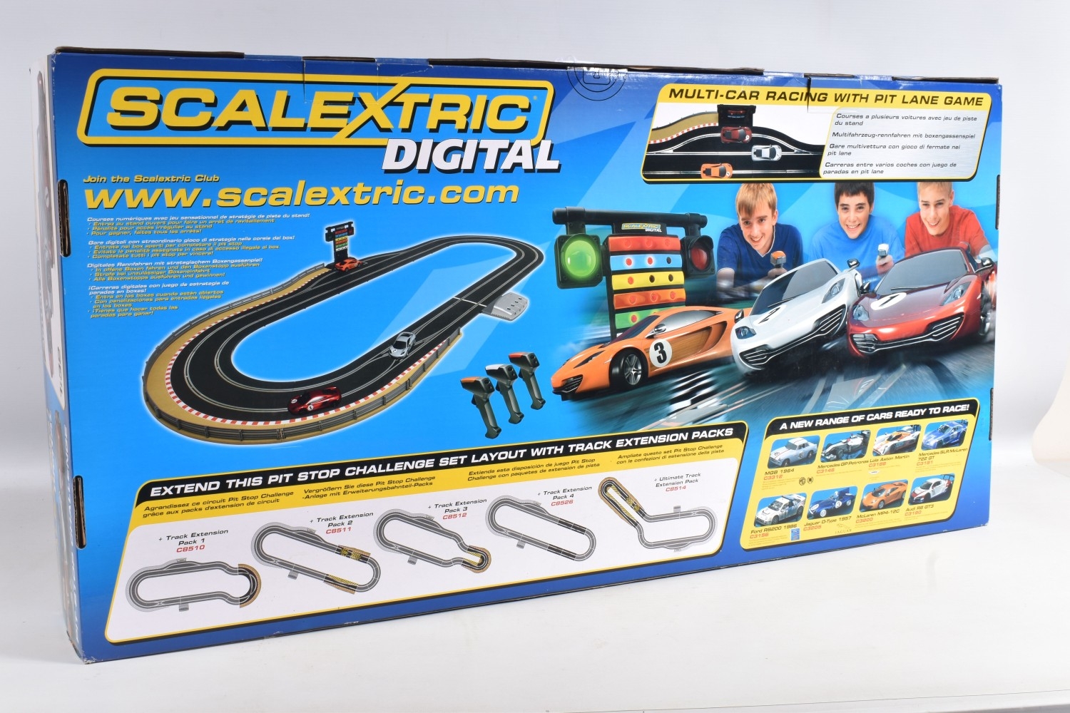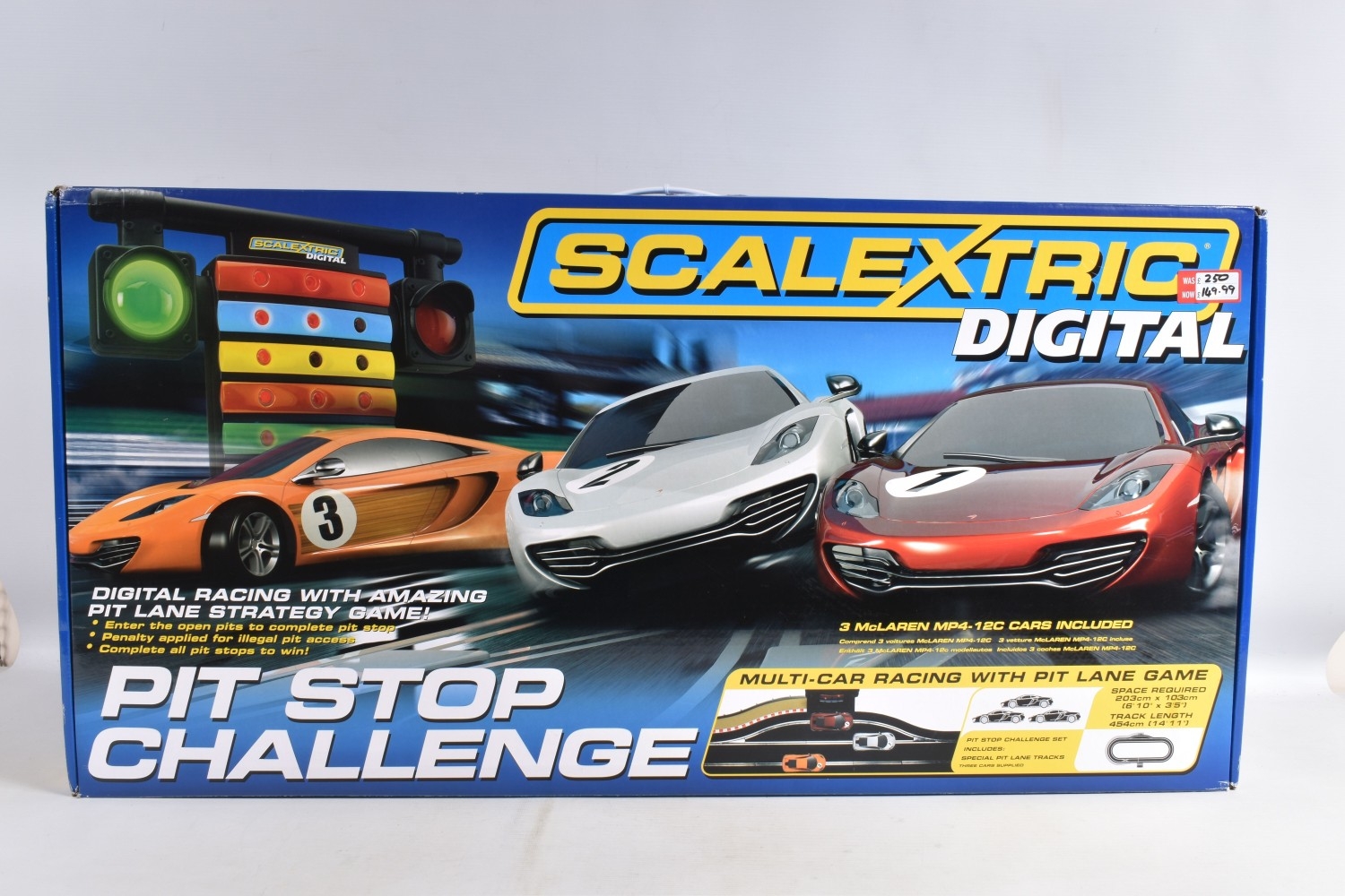 A BOXED HORBY SCALEXTRIC DIGITAL PITSTOP CHALLENGE SET, C1296, set appears new with all parts sealed or segregated within the box, includes all three cars, three triggers, accessories, track and instructions, its polystyrene internal packaging in perfect condition, and its outer cardboard box with carry handle with only some light wear and slightly turned up edges