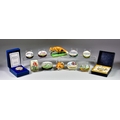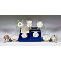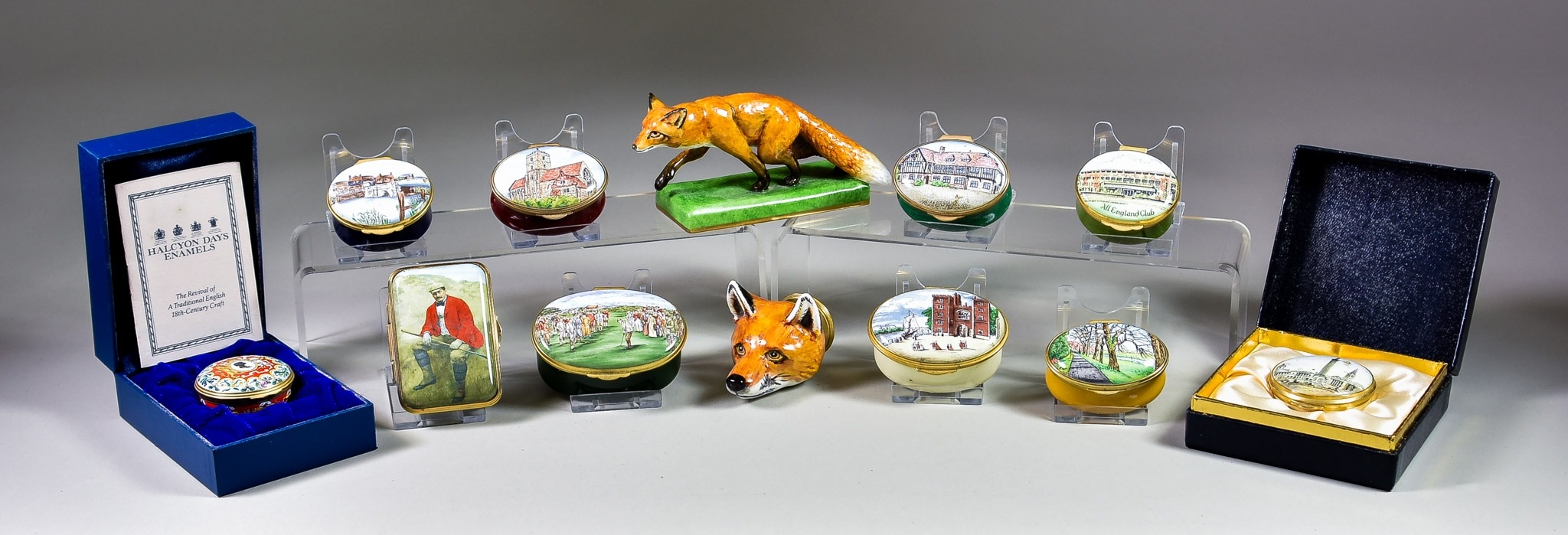 Twenty-One Enamel Boxes, by Crummels, Halcyon Days, Staffordshire Enamels, and others, including - "St. George's Golf Club" oval box, No. 50/50, "Lambeth Palace Millennium" oval box, No. 13/500, "Fox Head Stirrup Cup" inspired by Derby Porcelain original, mostly boxed and with certificates, and Halcyon Days porcelain figure of a fox on rectangular base
