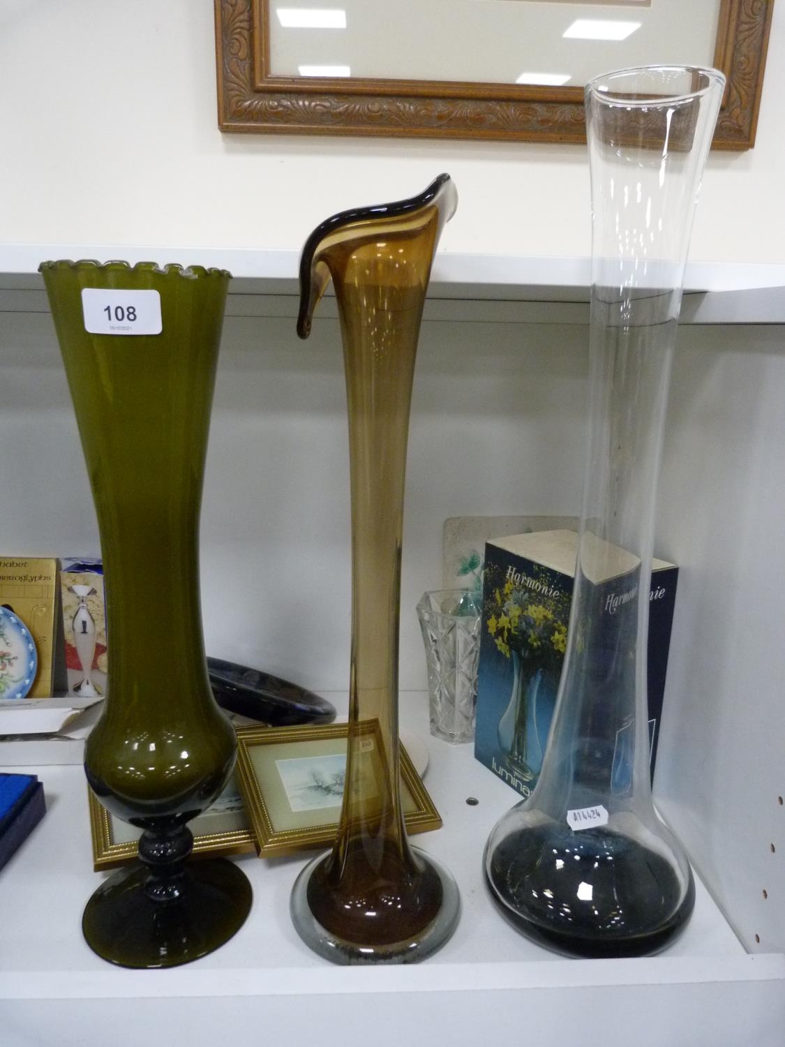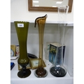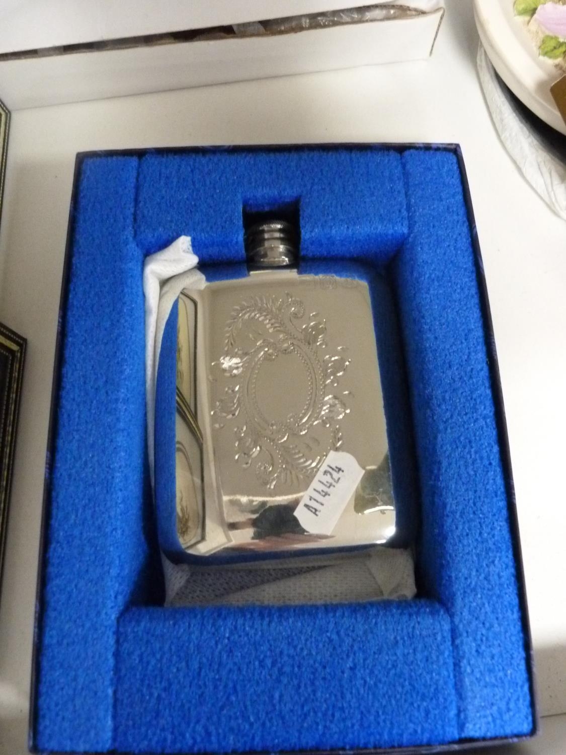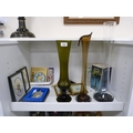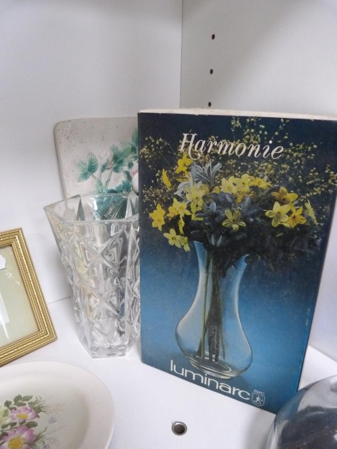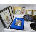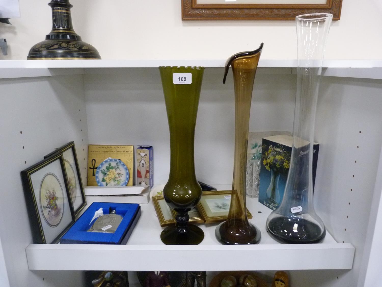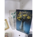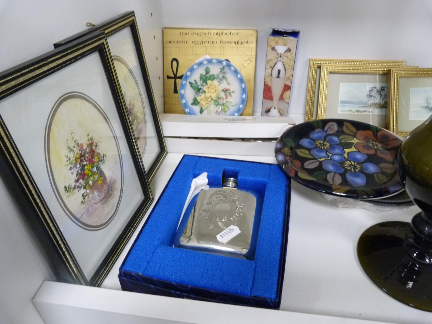 Coloured glass vase, hip flask, small modern pictures, Royal Stanley stand, cut glass vase, boxed glass vase etc.
