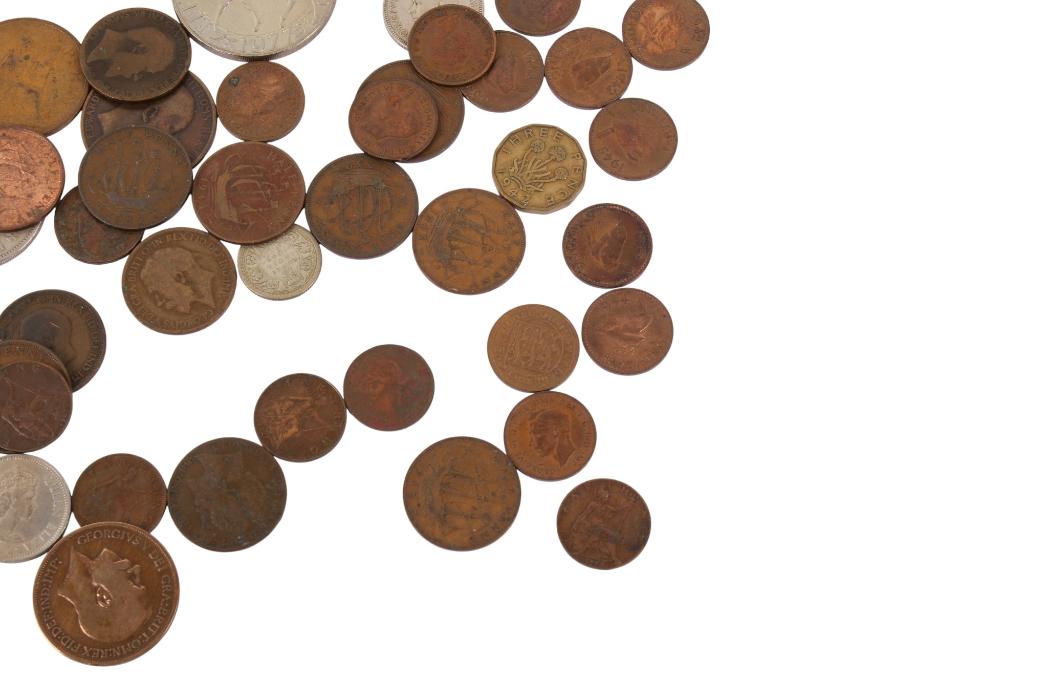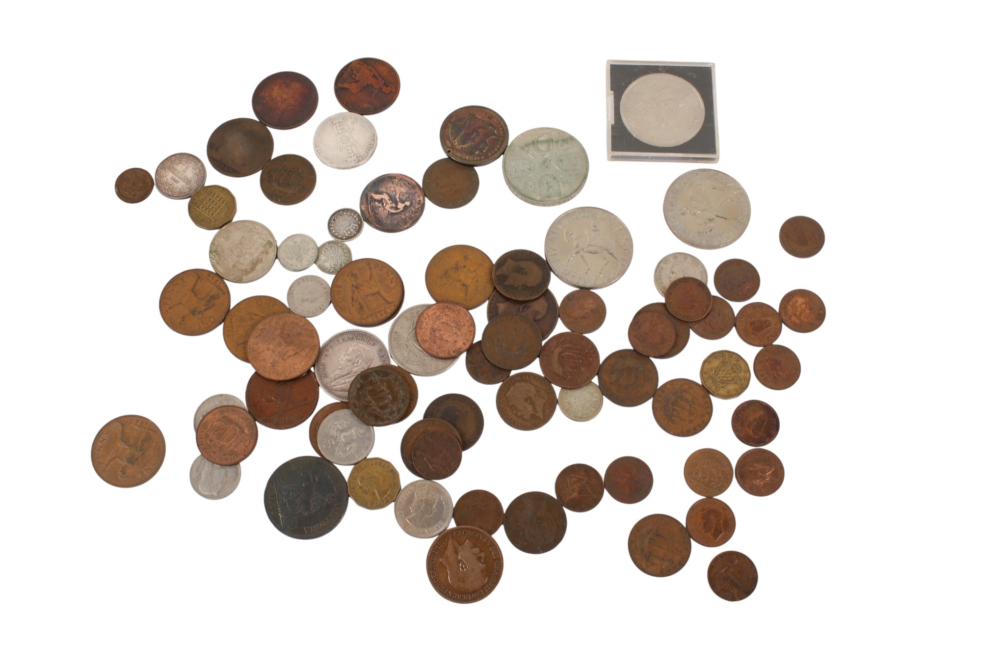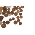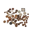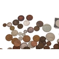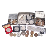 A small collection of assorted world coins in a tin. Including some silver, etc.