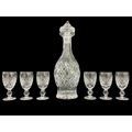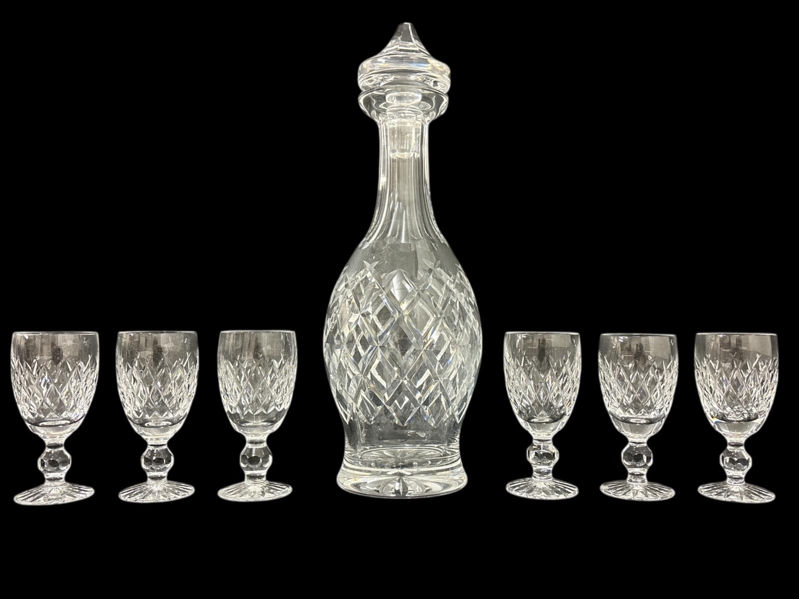 A WATERFORD CUT CRYSTAL DECANTER with corresponding stopper 33cm (h) together with SIX WATERFORD CUT CRYSTAL SHERRY GLASSES in the Boyne pattern 10.5cm (h)