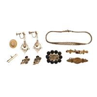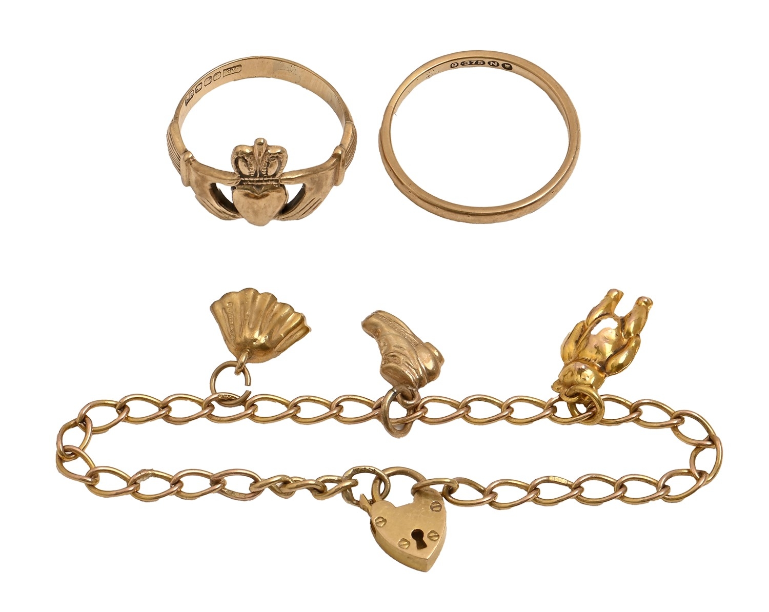 A 9ct gold wedding ring and a 9ct gold Claddagh ring, and a 9ct gold charm bracelet and padlock, 9.1g, ring sizes O, R (3)