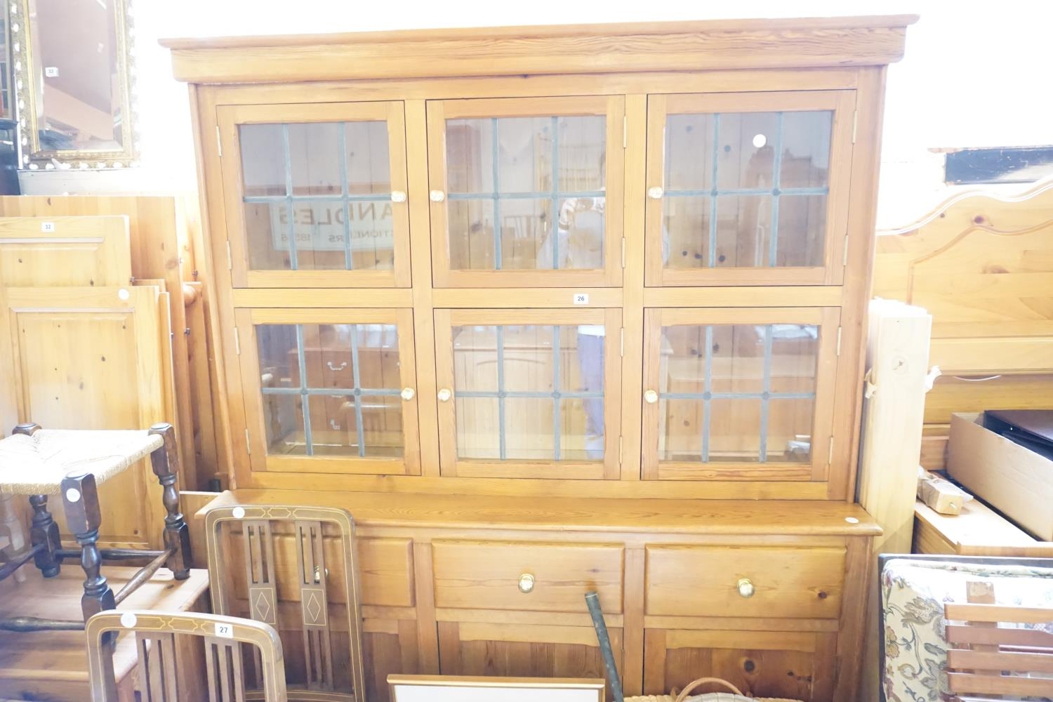 A pine dresser with leaded glazed doors