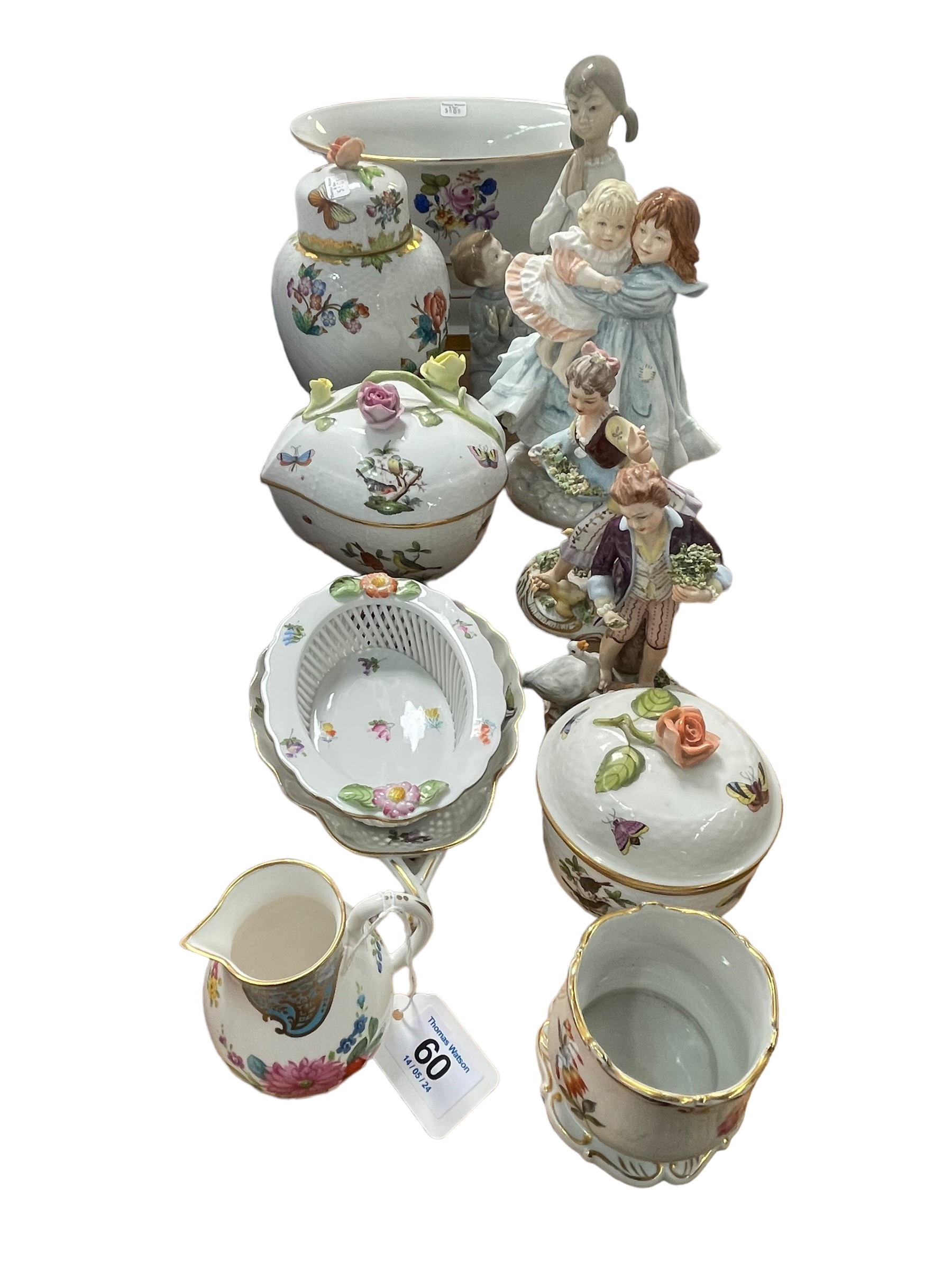 Herend Pottery vases, lidded pots, Lladro group, Royal Worcester group 'Love', pair of Capo di Monte figures, etc.