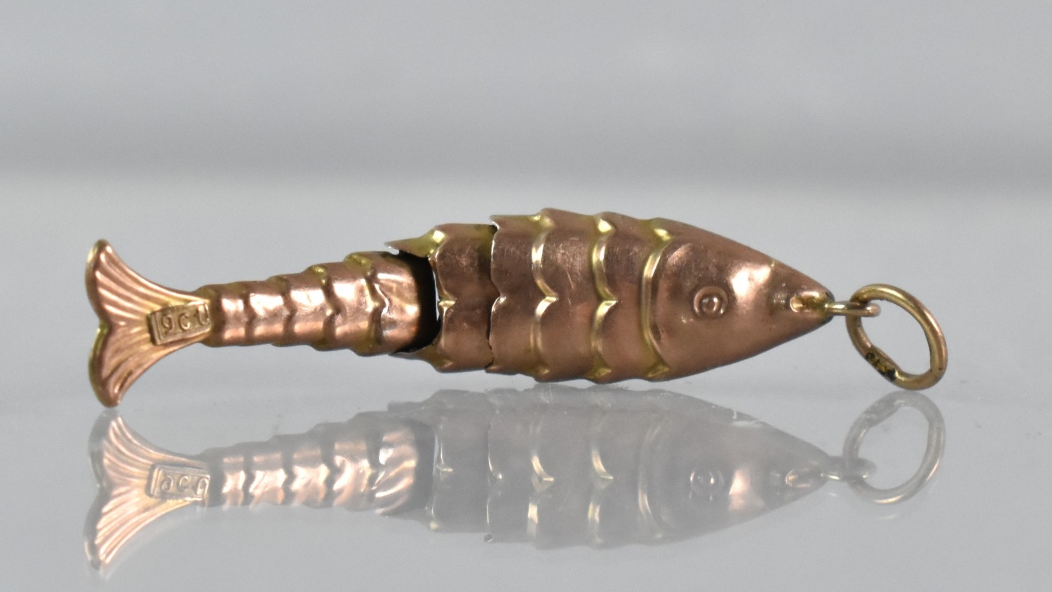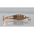 A Vintage 9ct Gold Charm/Pendant, Articulated Fish, Rectangular Panel to Tail Embossed 9ct, 0.6gms, 34.5mm Long