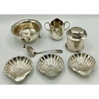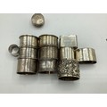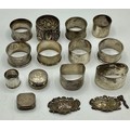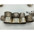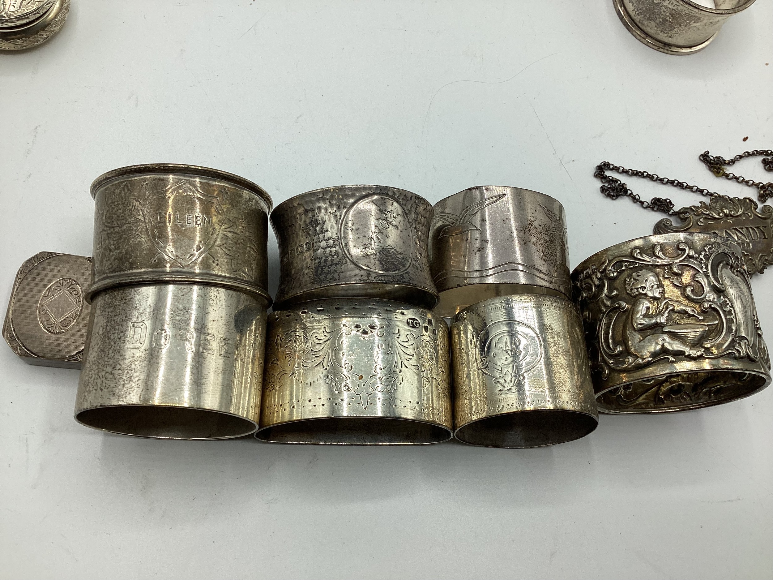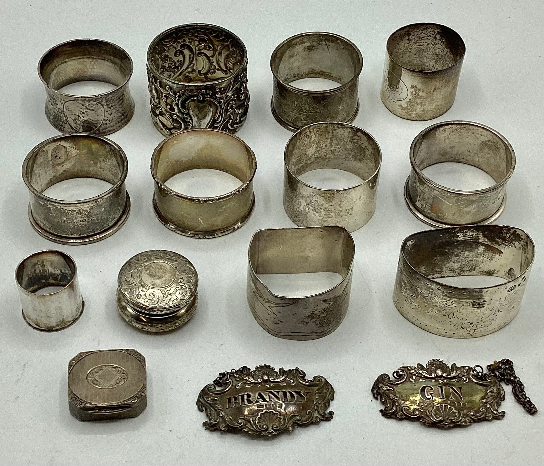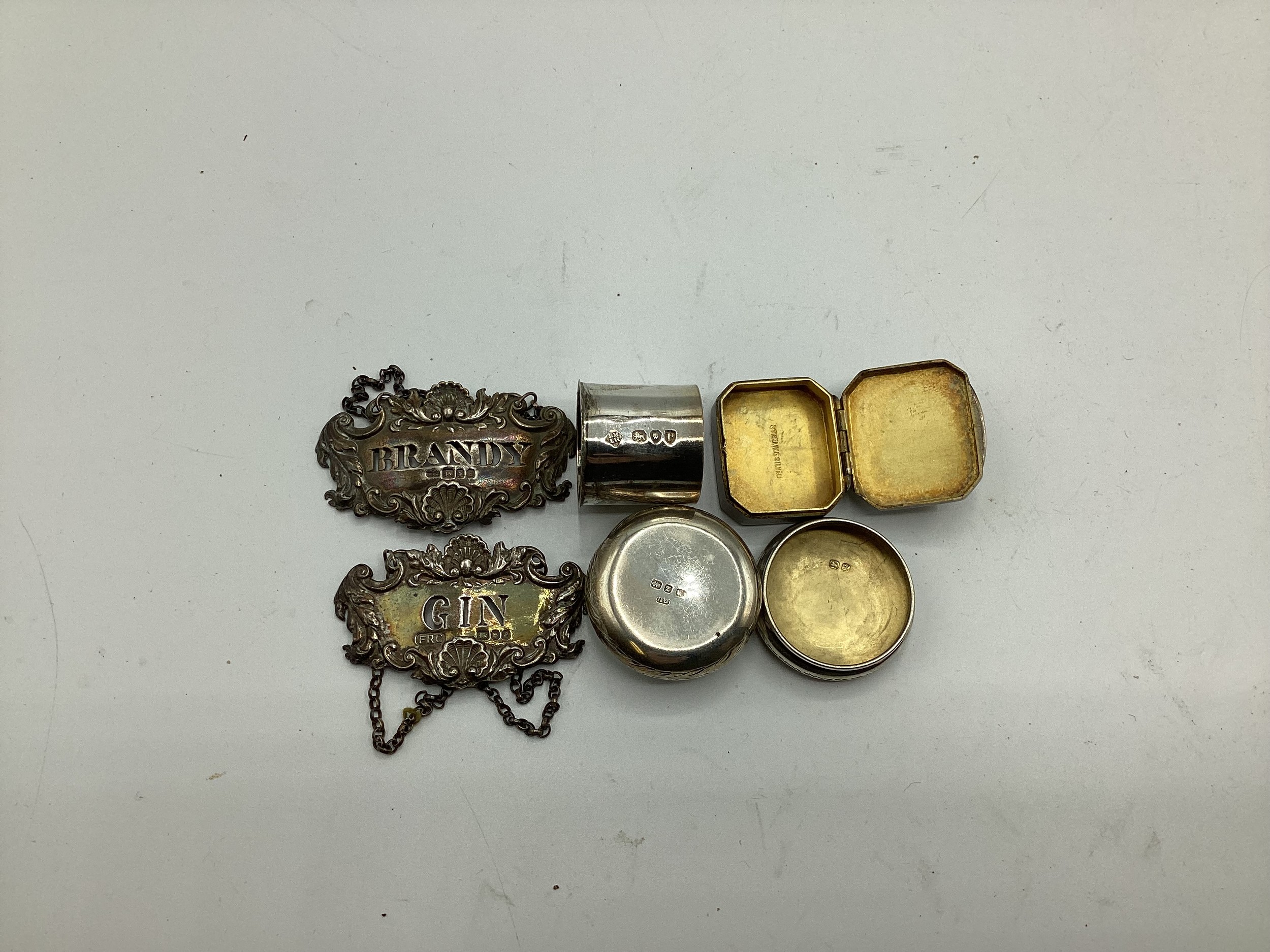 Collection of small sterling items to include napkin rings, decanter labels, patch boxes etc. 331 g