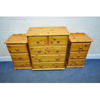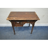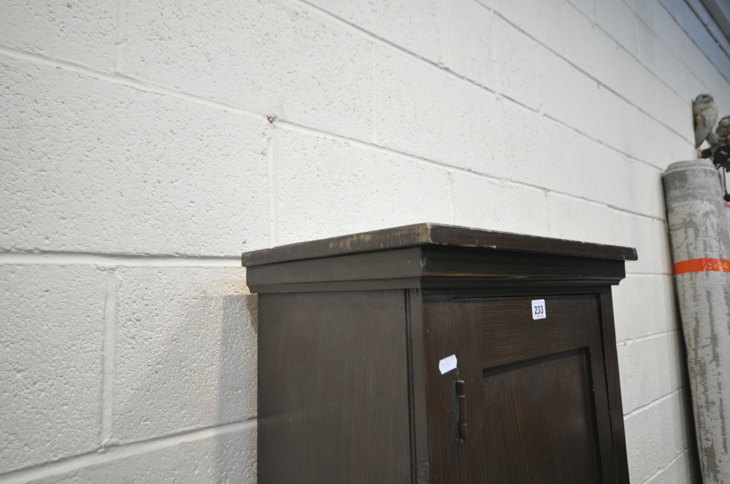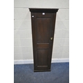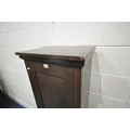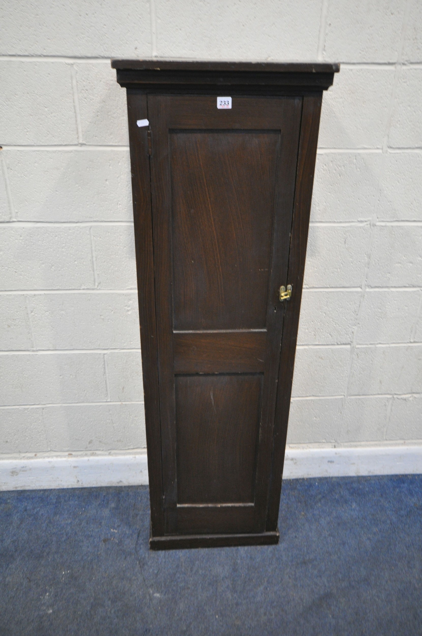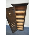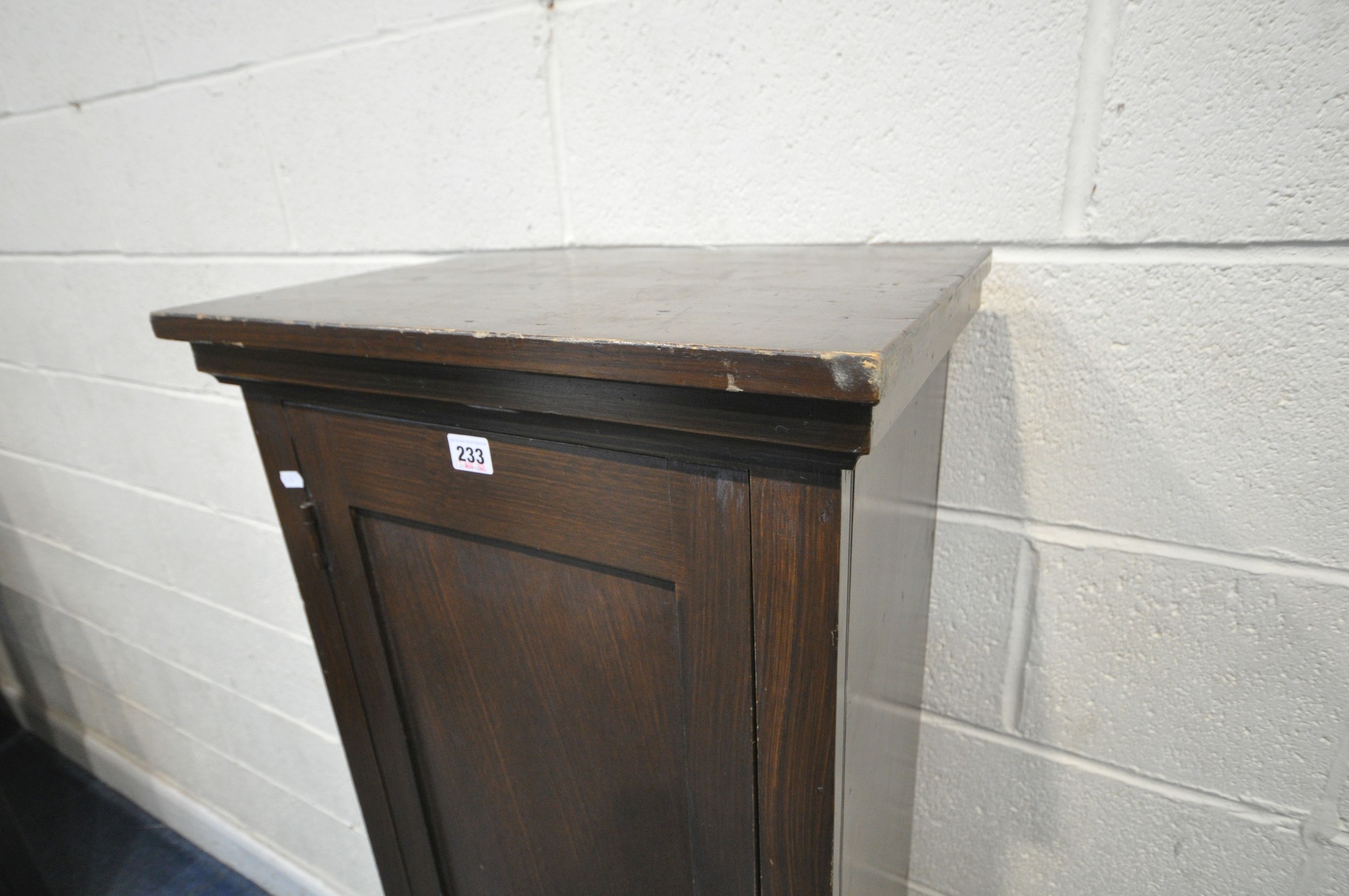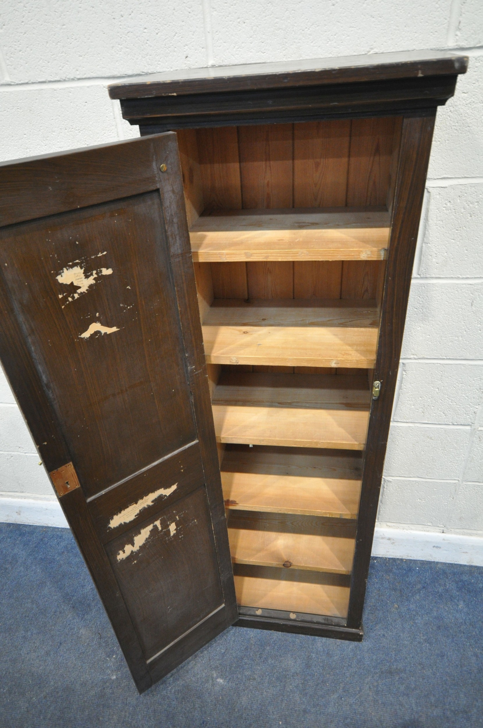 A STAINED PINE CABINET, with a single cupboard door enclosing shelves, width 49cm x depth 33cm x height 153cm, condition report: marks, scuffs, over-stained other wear and usage