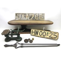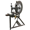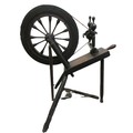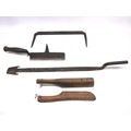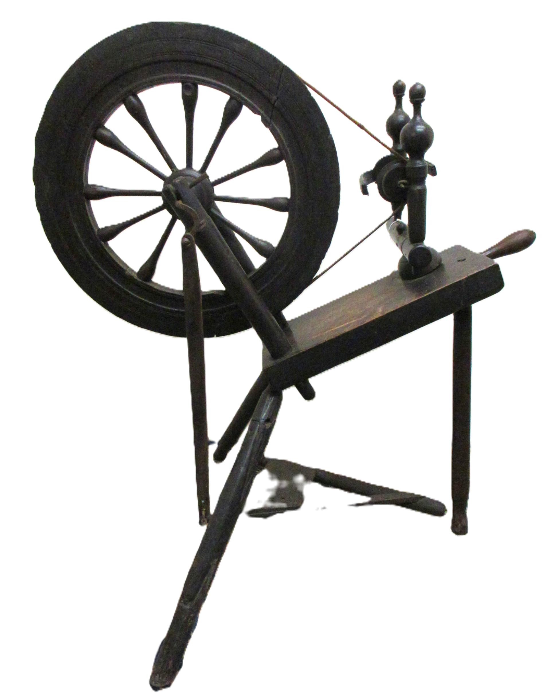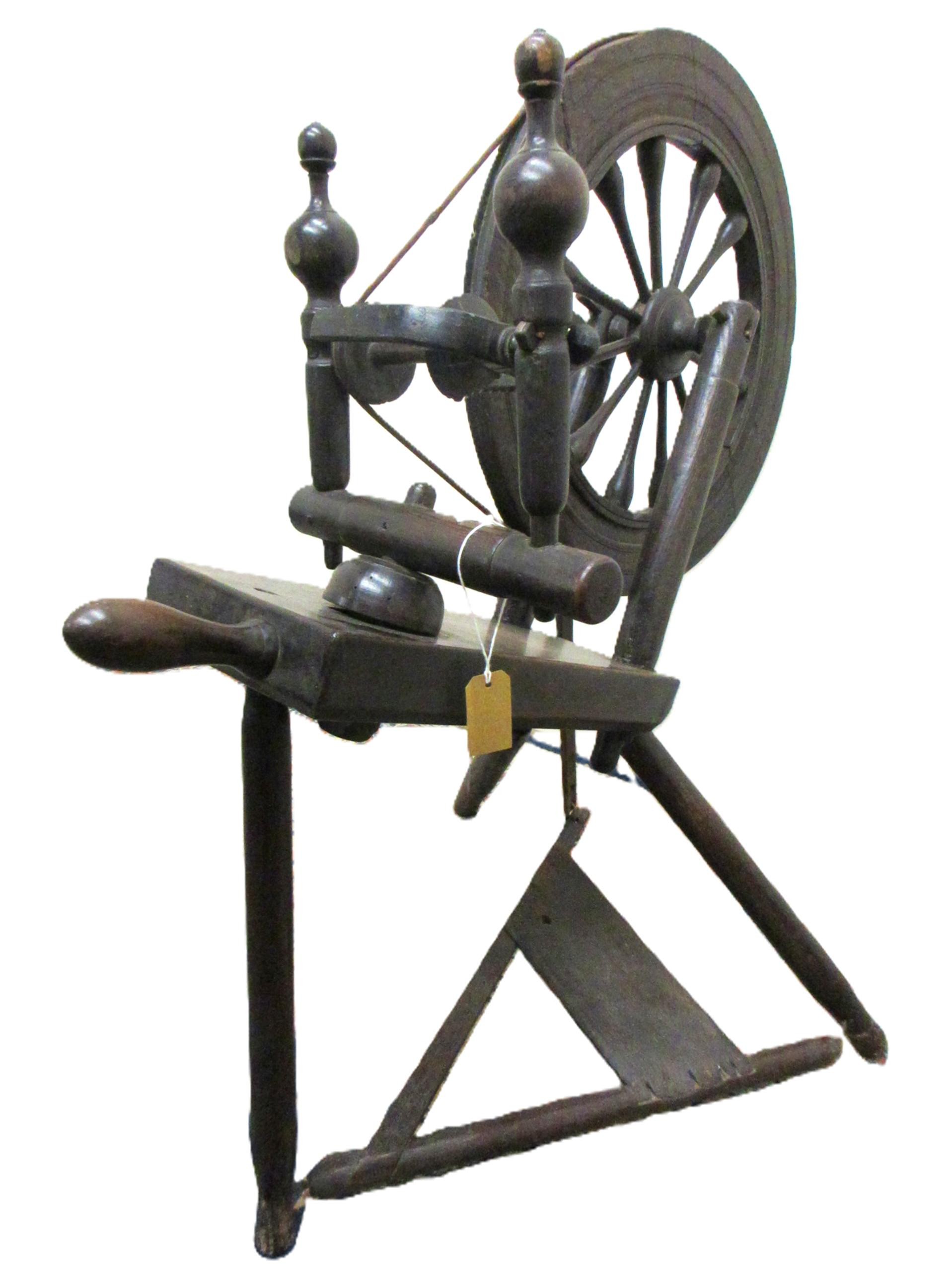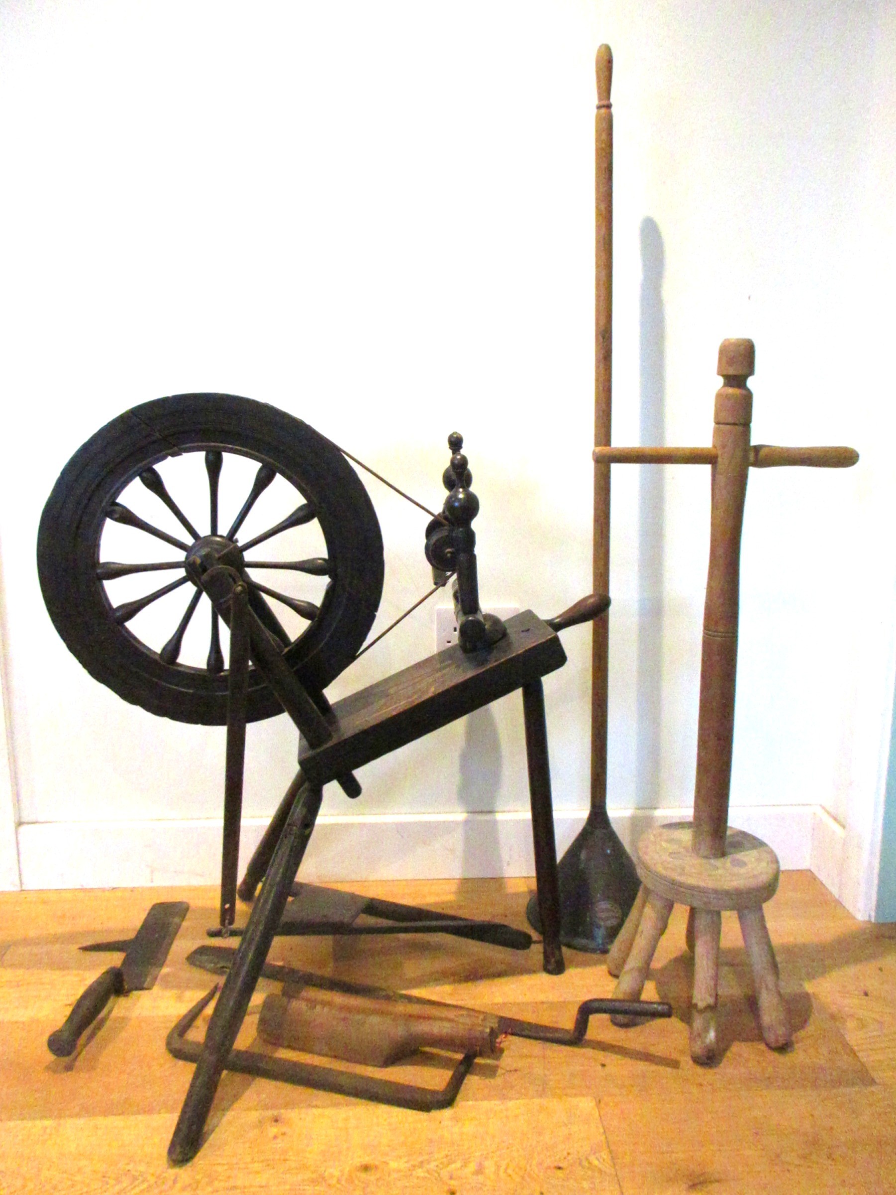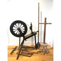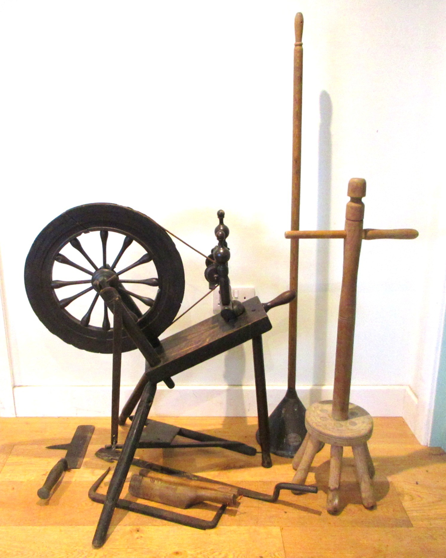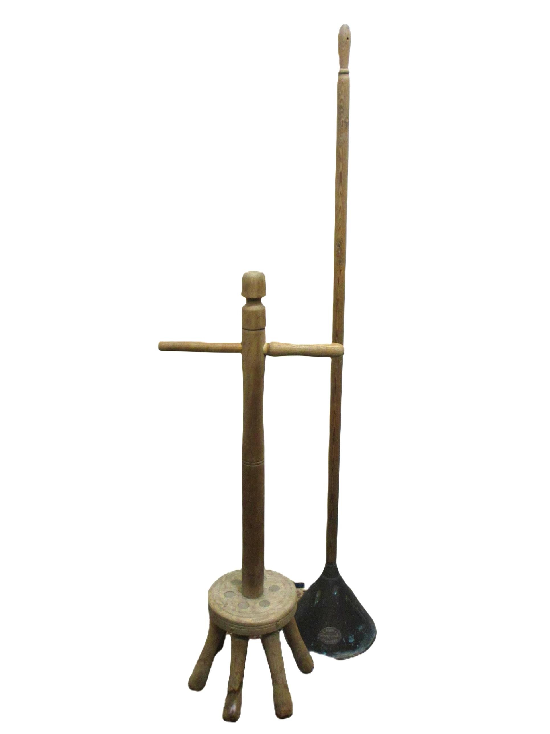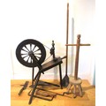 Selection of domestic garment, specialist roofing and plumbing tools comprising Elwell 34 slater's axe for trimming roof tiles to size, with incorporated spike to create nail holes; roofer's long iron ripper for lifting tiles & thatch; roofer/plumber's hardwood lead dresser setting-in stick & bossing stick mallets for clean, accurate folds in sheet metal installations; together with traditional dual-handled thatching prong; Handicraft stained beech timber spinning wheel with single treadle, crank arm, spoked fly wheel & drive band, approx. W 80cm x H 86.6cm, plus late Victorian/Edwardian wooden dolly & Beat All Washing Plunger laundry posser, approx. H 94 & 137cm, etc. Qty. 8