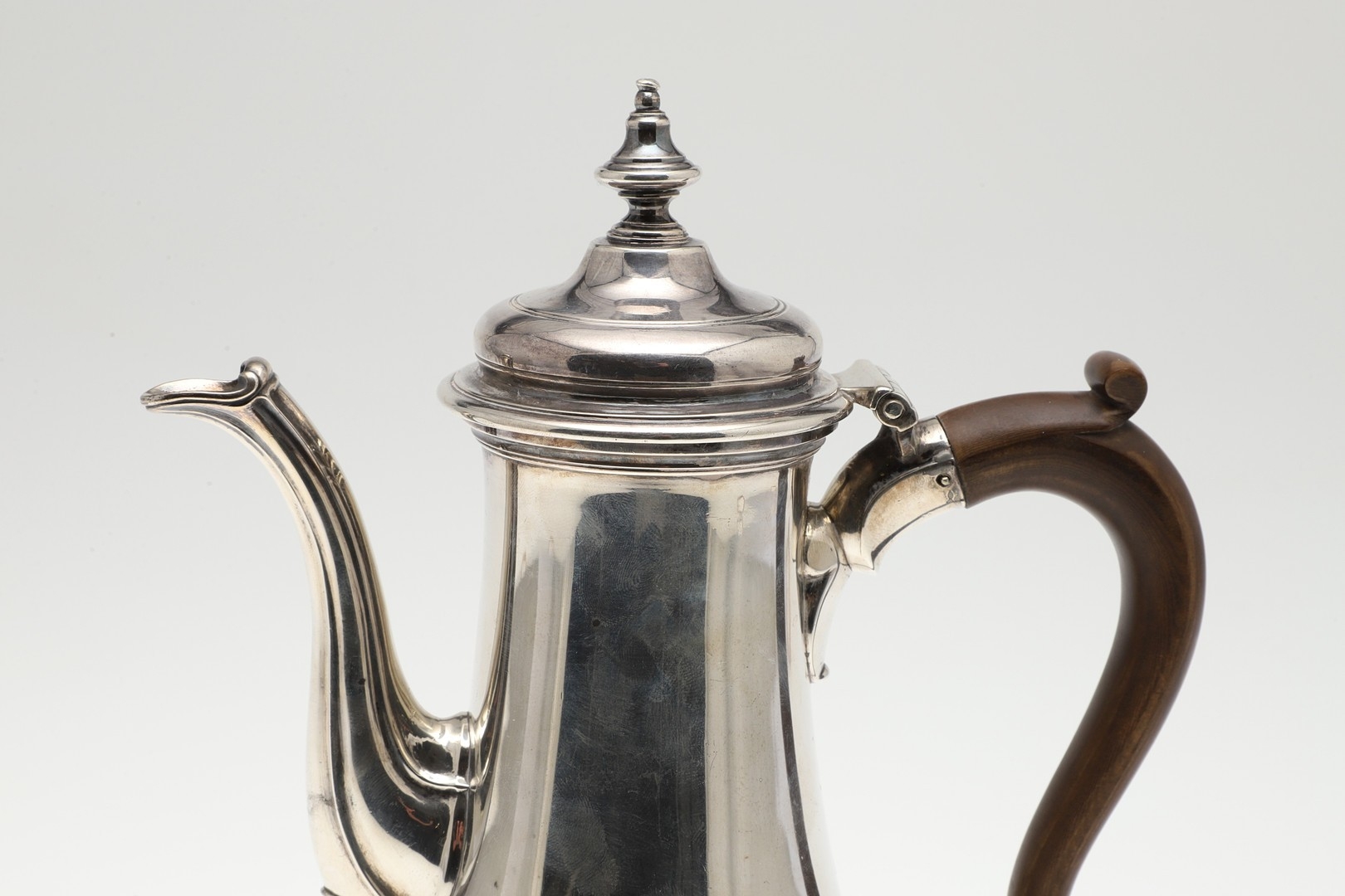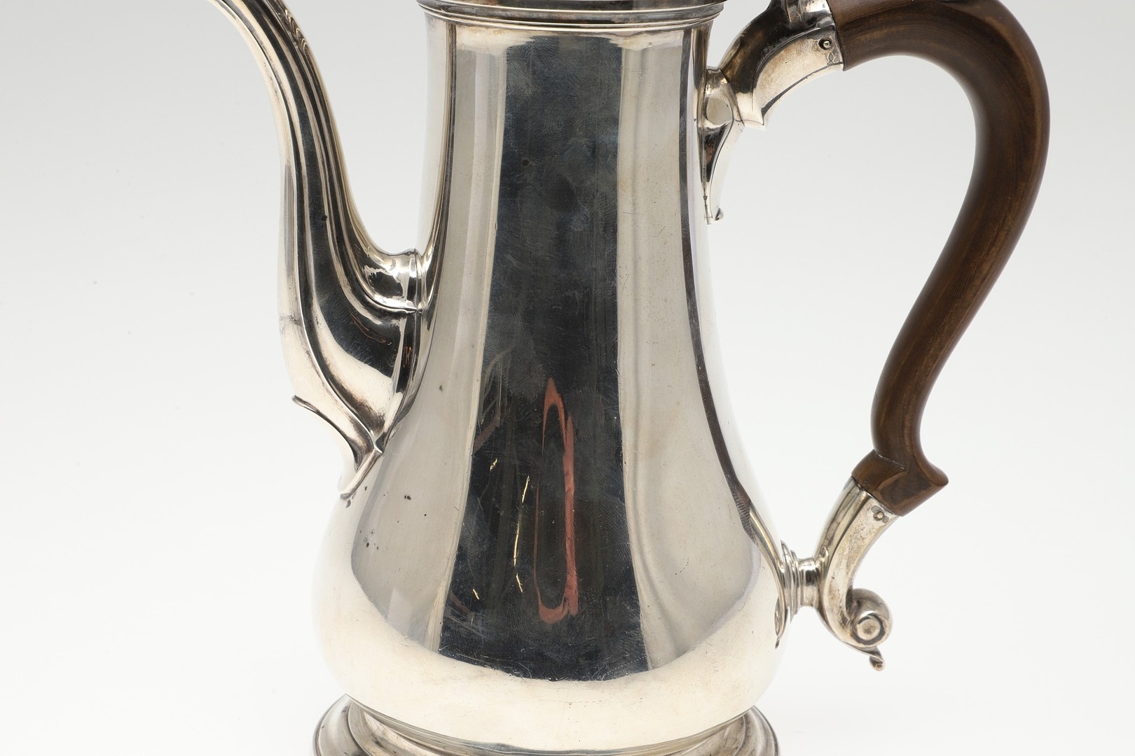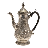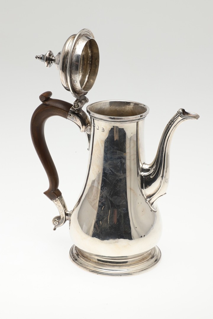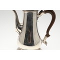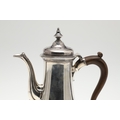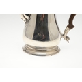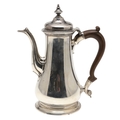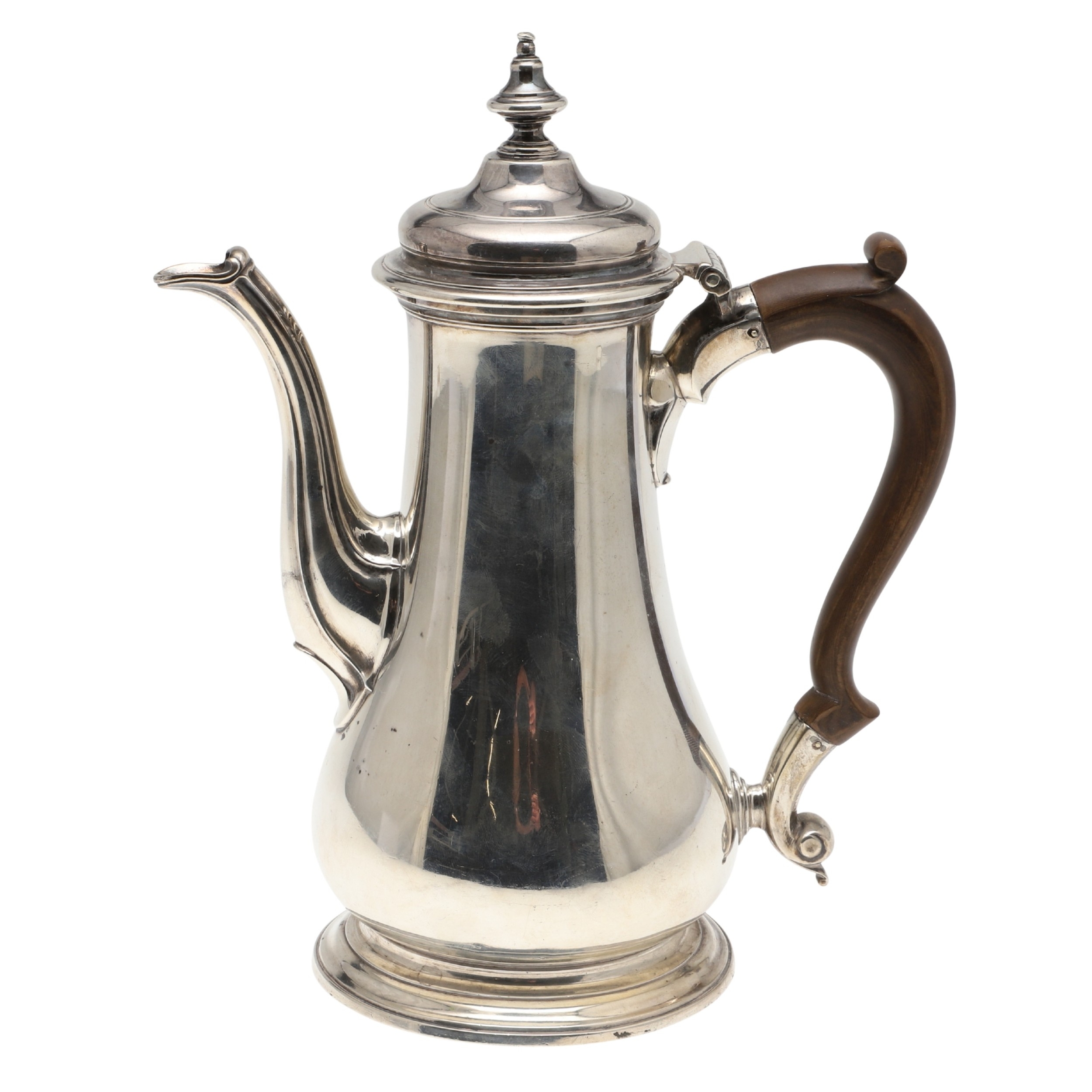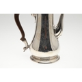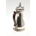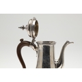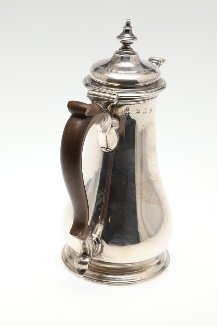 A LATE GEORGE II SILVER COFFEE POT. Of plain baluster form, with scroll handle and round foot, the lid topped with a finial. Height 23cm. Hallmarked Aymé Videau, London, 1756. Total weight 25.5ozt.