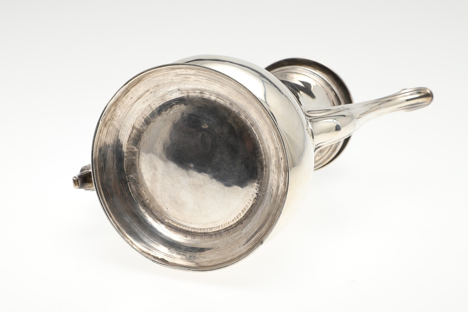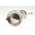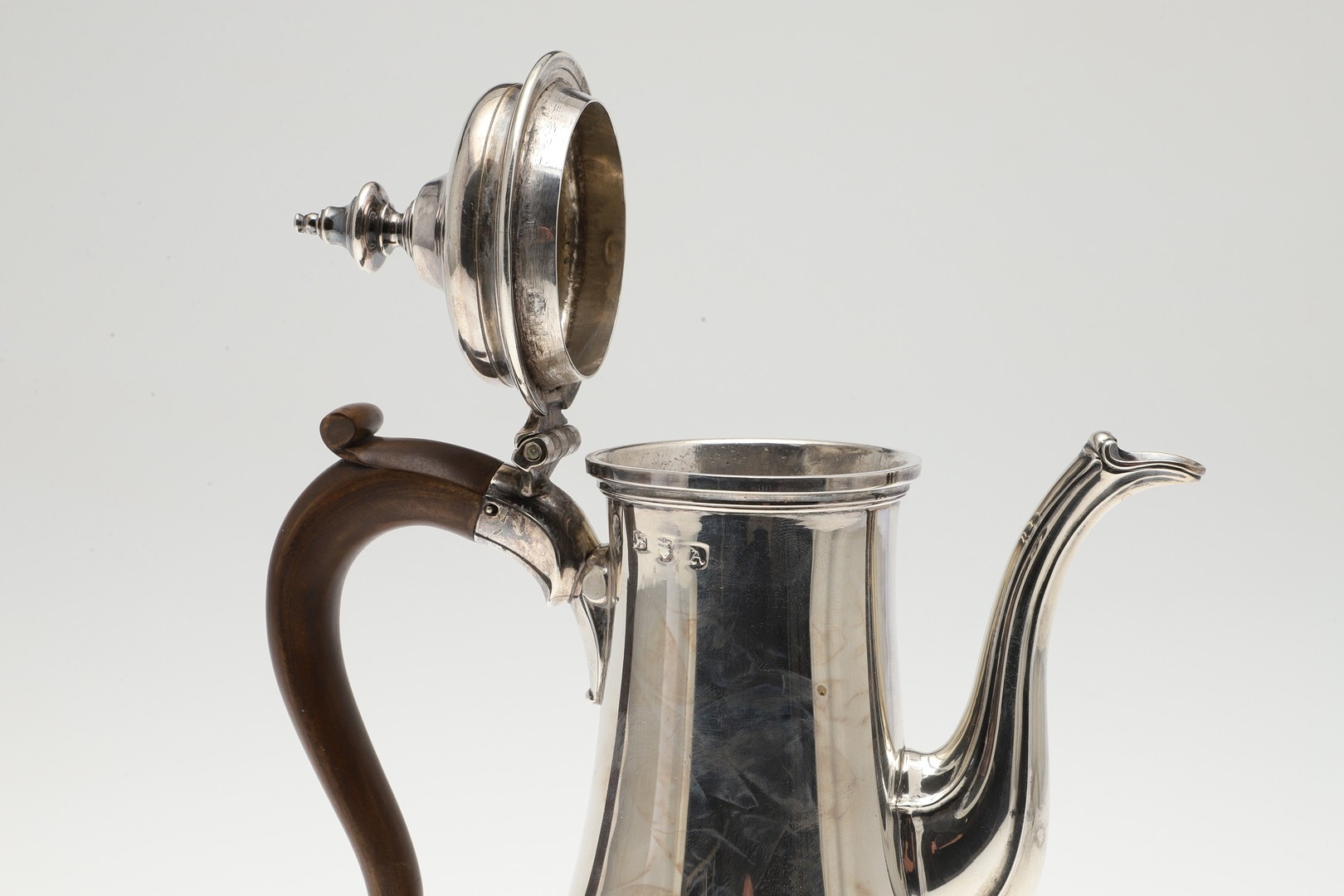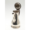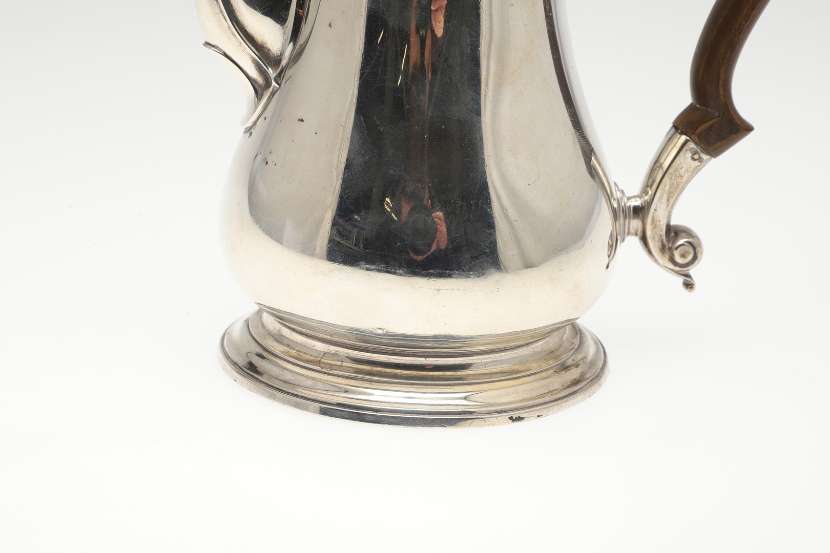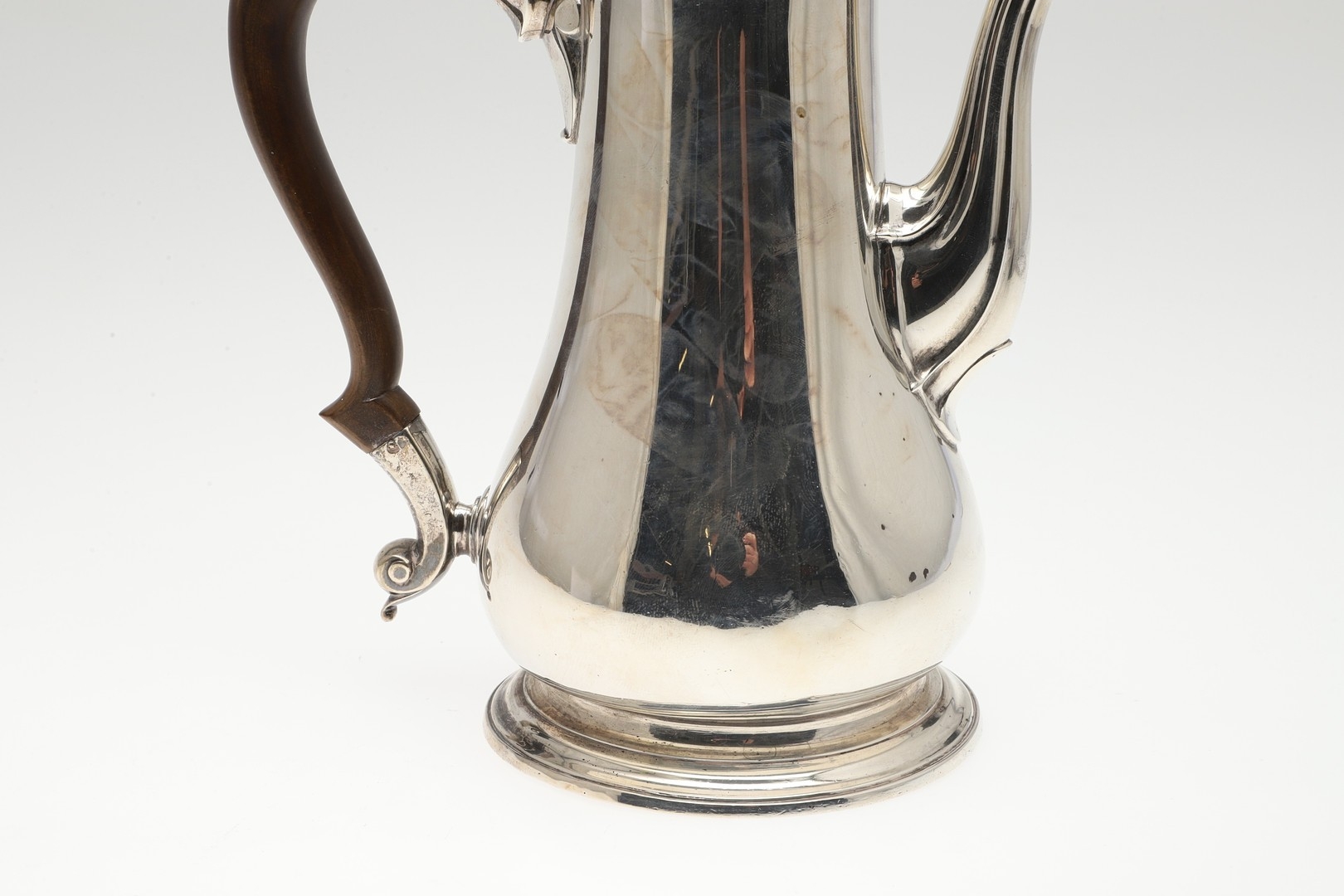 A LATE GEORGE II SILVER COFFEE POT. Of plain baluster form, with scroll handle and round foot, the lid topped with a finial. Height 23cm. Hallmarked Aymé Videau, London, 1756. Total weight 25.5ozt.