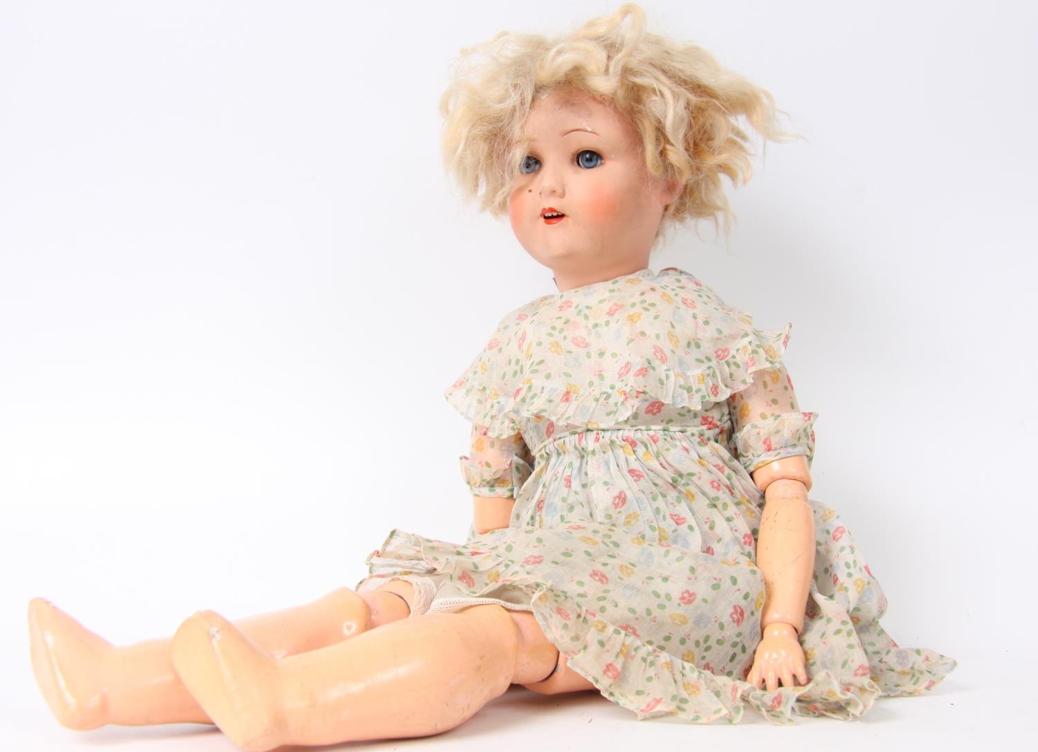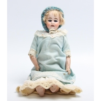 A sprayed bisque head and composition jointed body doll, sleeping blue glass eyes, painted features, open lips revealing four small upper teeth, impressed marks 'HW Germany 61/2' 62cm tall