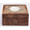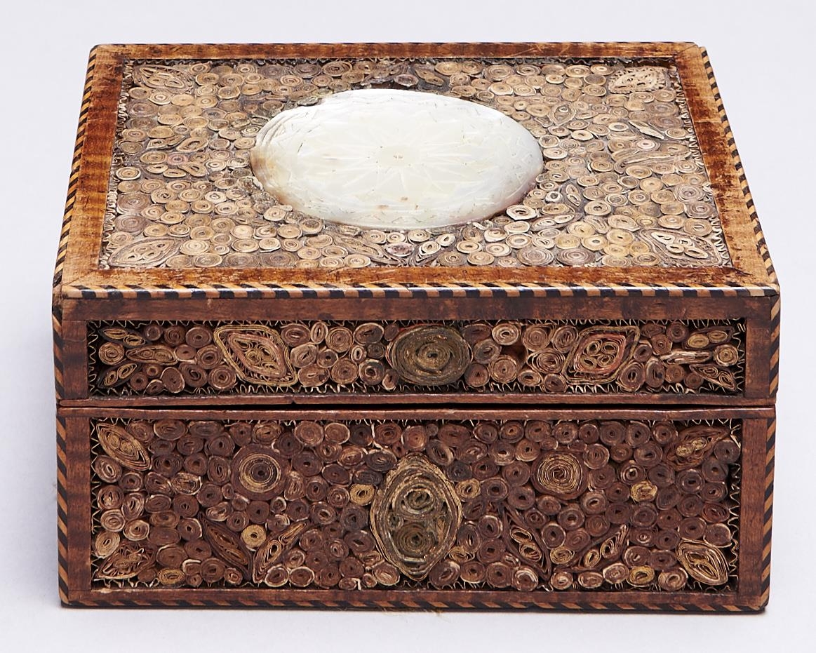 A George IV mahogany and quilled paper box and cover, c1800, with barber pole stringing, 12cm l