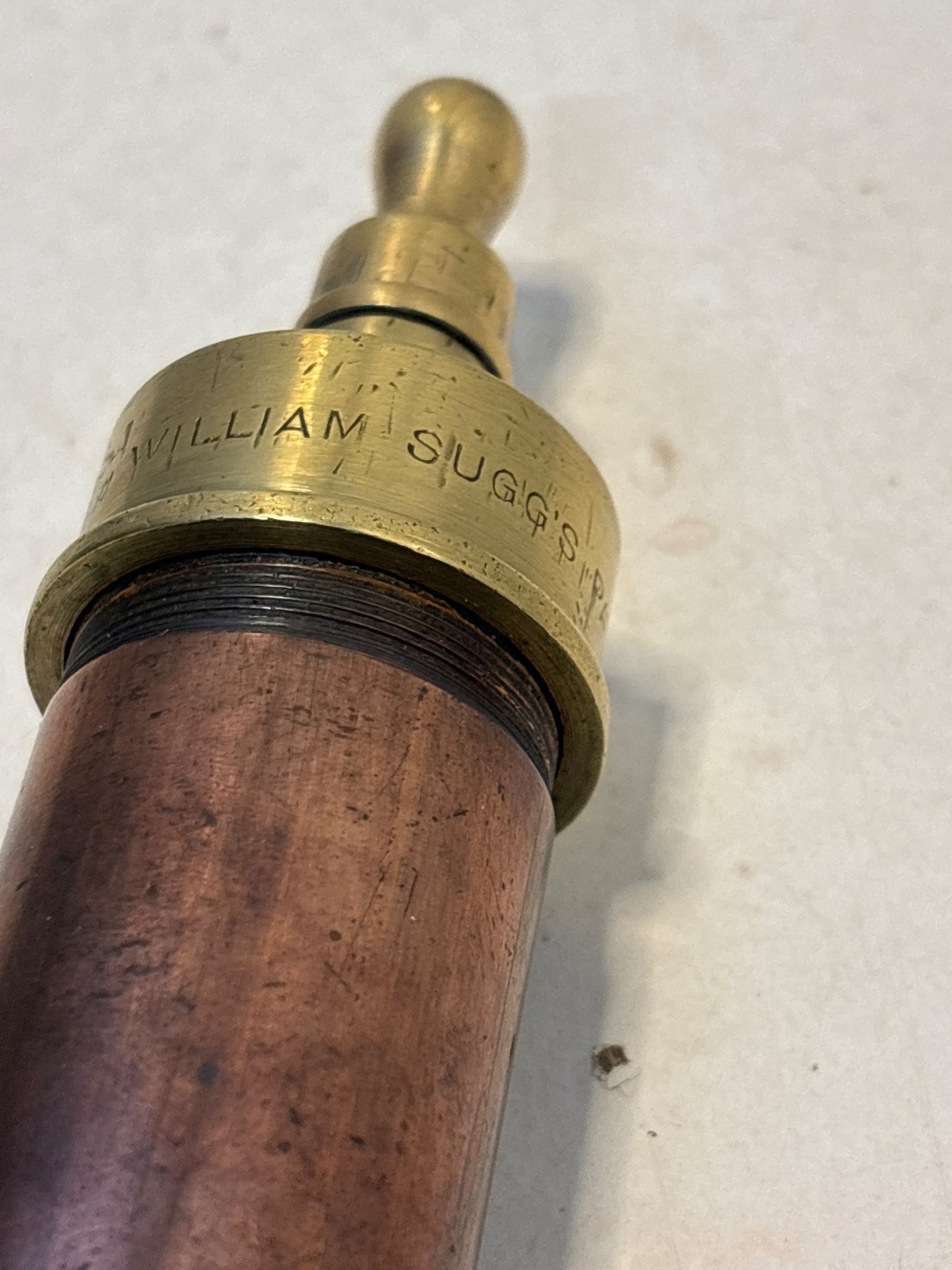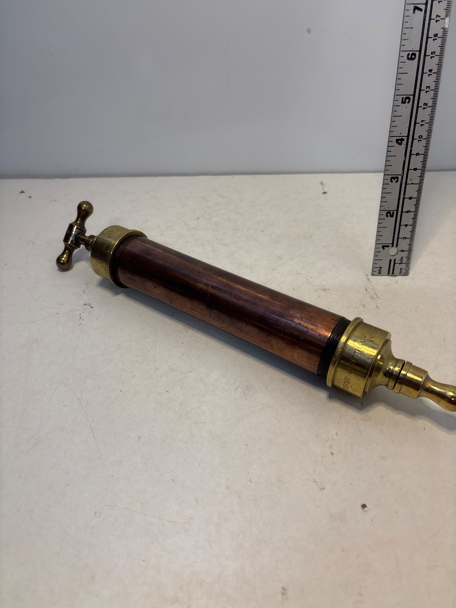 Brass and copper syringe marked 'William Suggs'. Approx. 8 inches long. makers of Victorian gas lights.