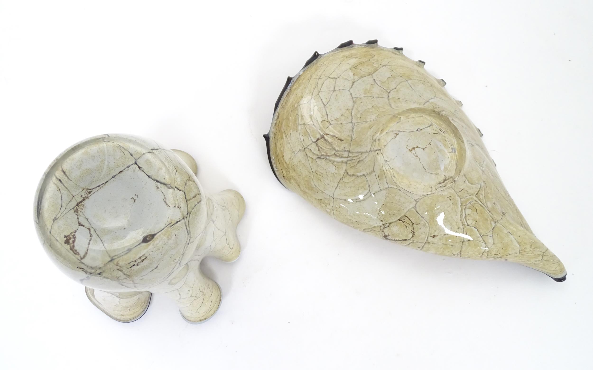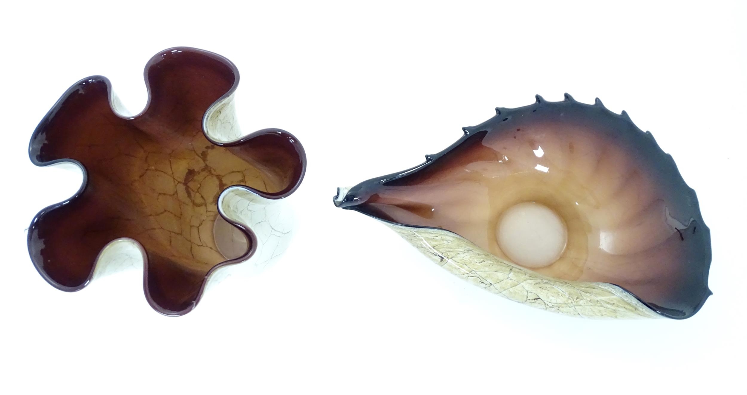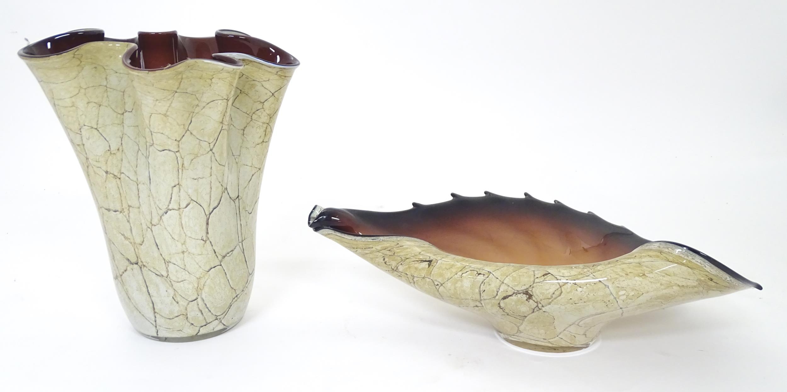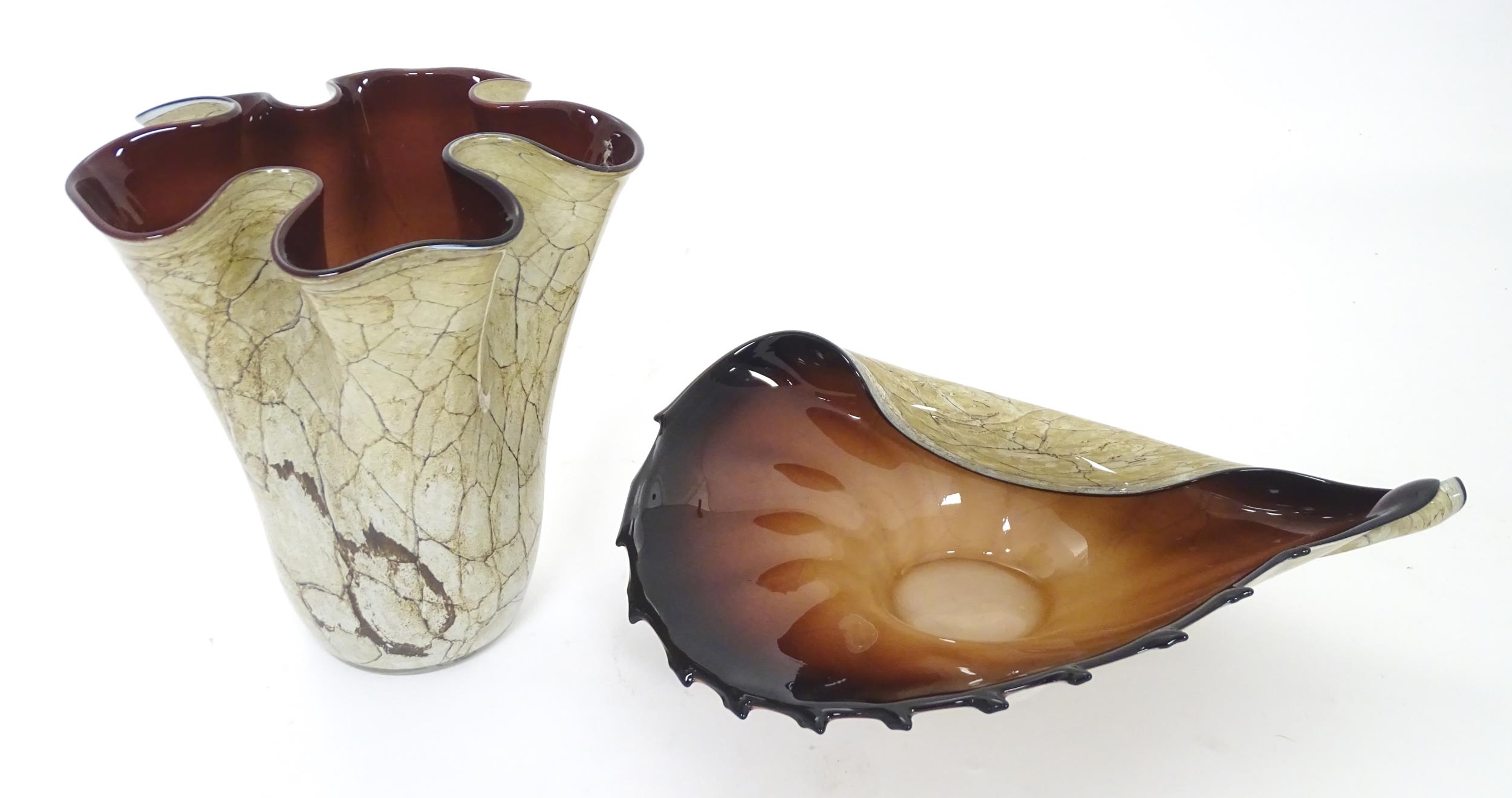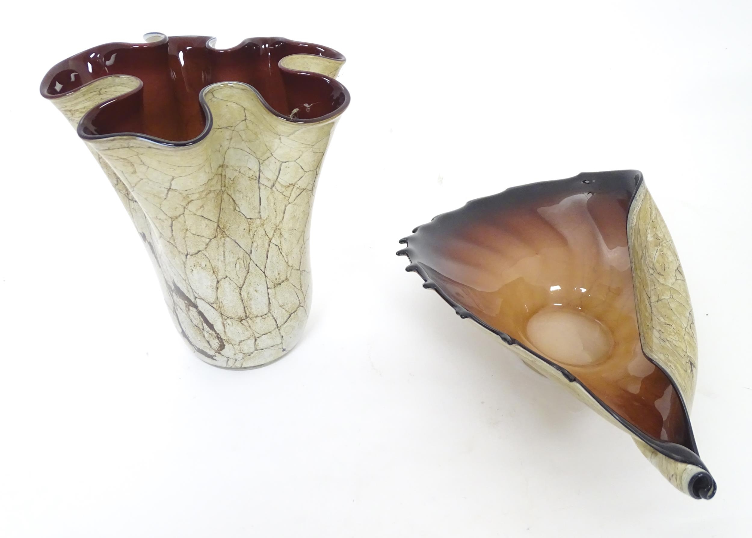 An art glass handkerchief vase together with a bowl of shell form in the manner of Jozefina Krosno Poland. The vase approx 9" high (2)