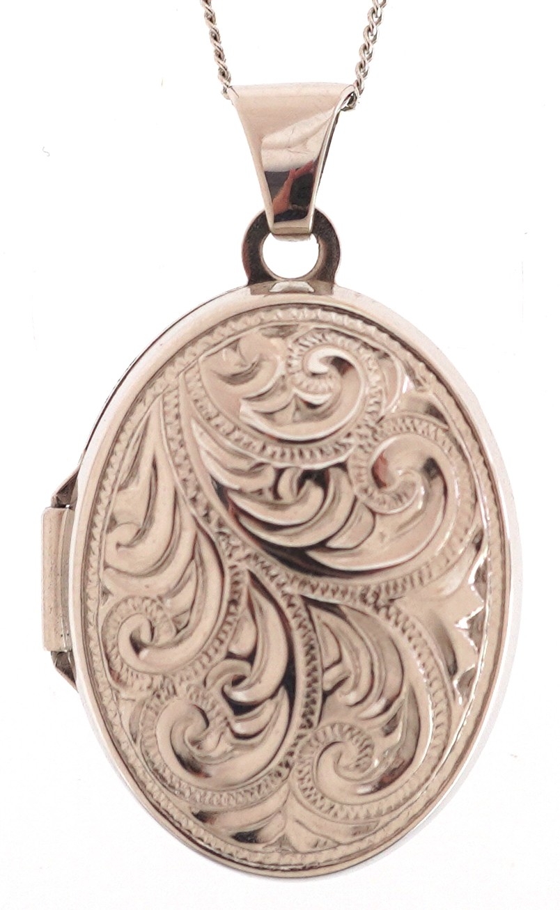 A 9ct white gold engraved locket on a 9ct white gold necklac...