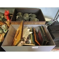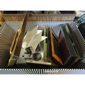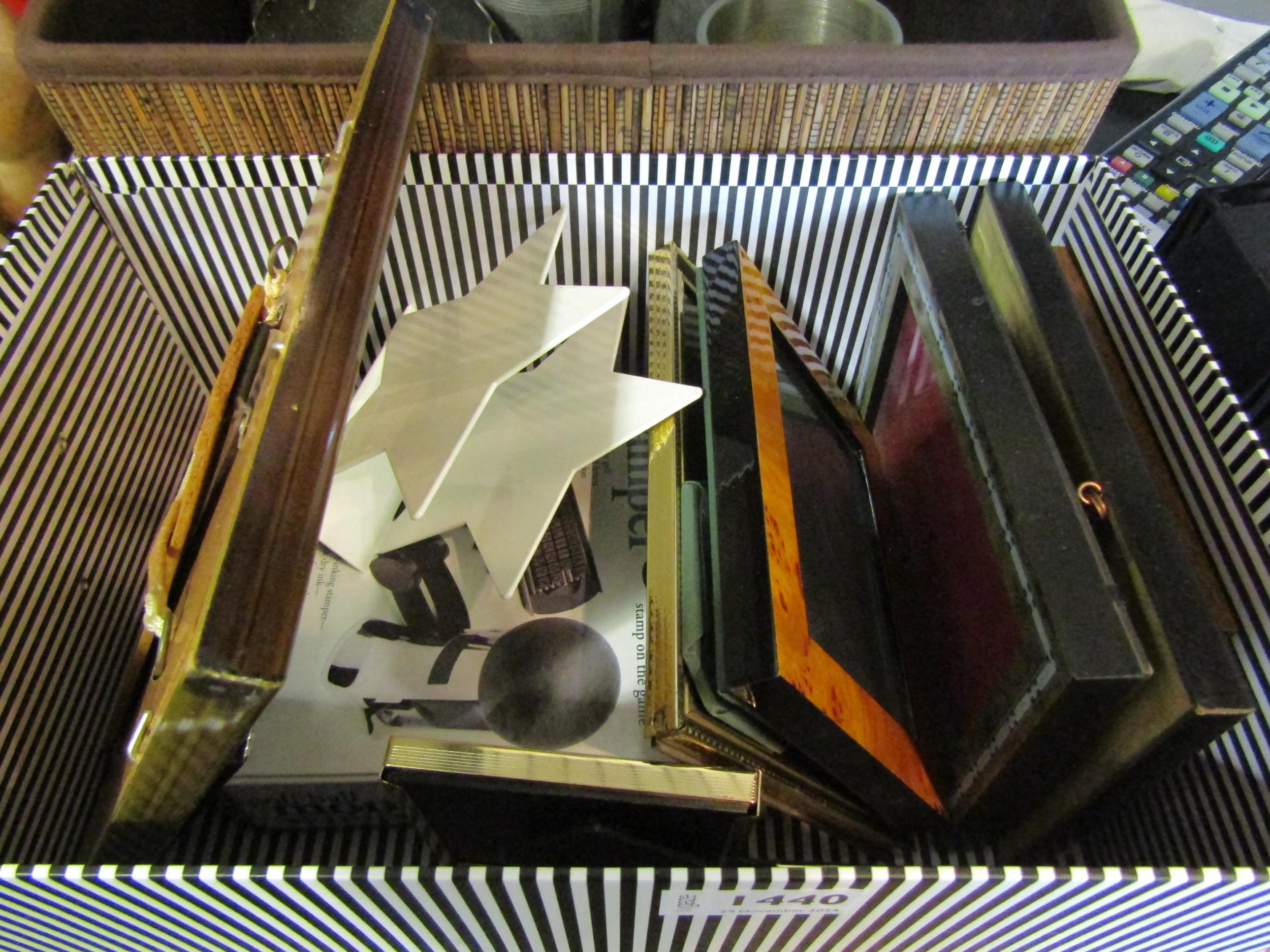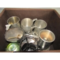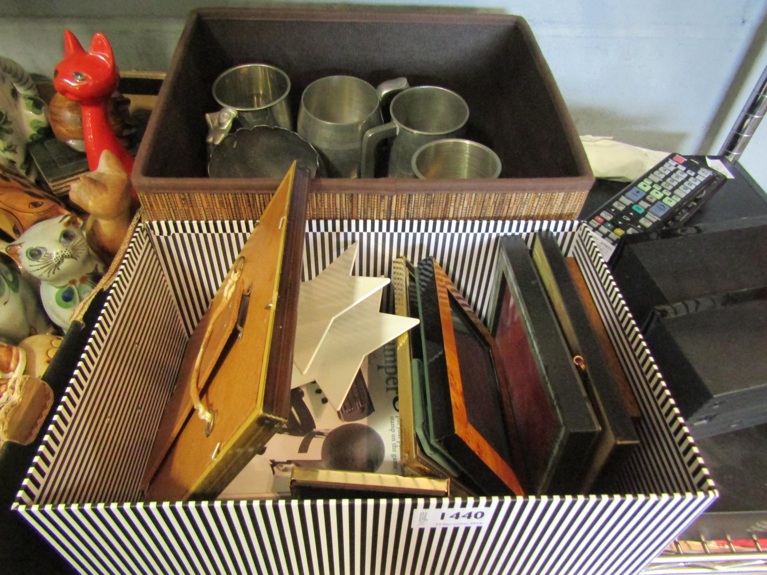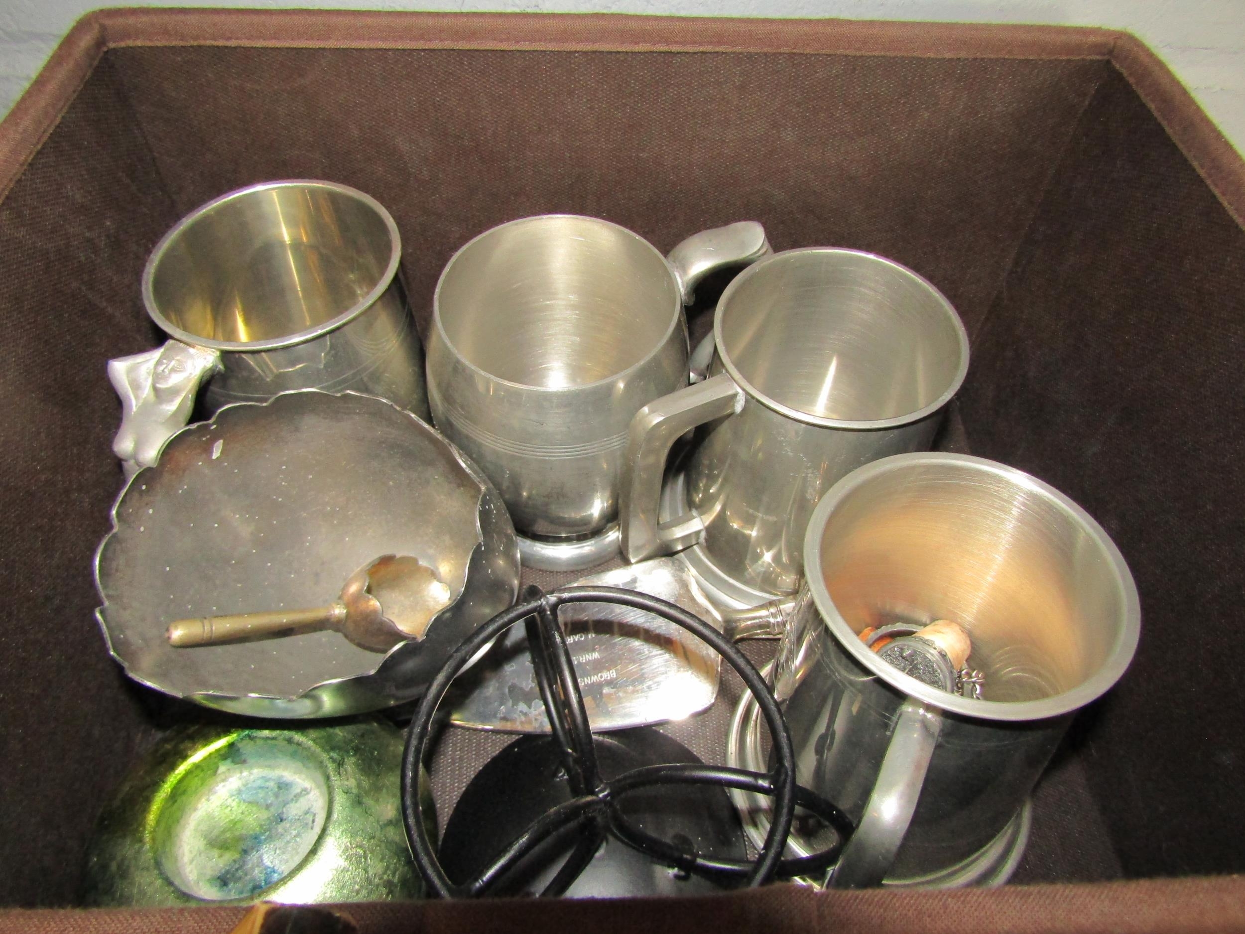 Two boxes containing pewter tankards, a plated cake server, photograph frames etc.
