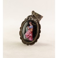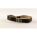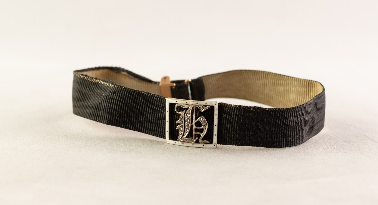 VICTORIAN BLACK MOIRE BRACELET with white enamelled gold coloured metal rectangular open work slide enclosing a Gothic letter H, set with tiny rose diamonds, gold coloured clasp