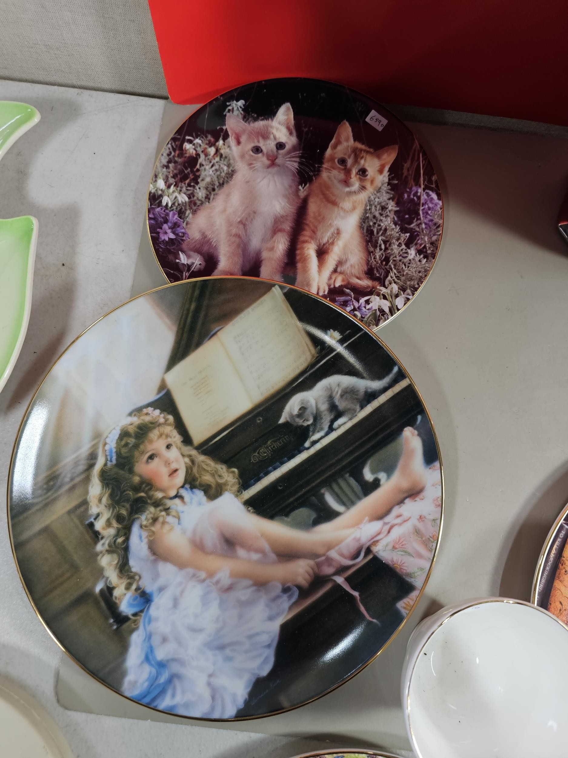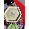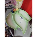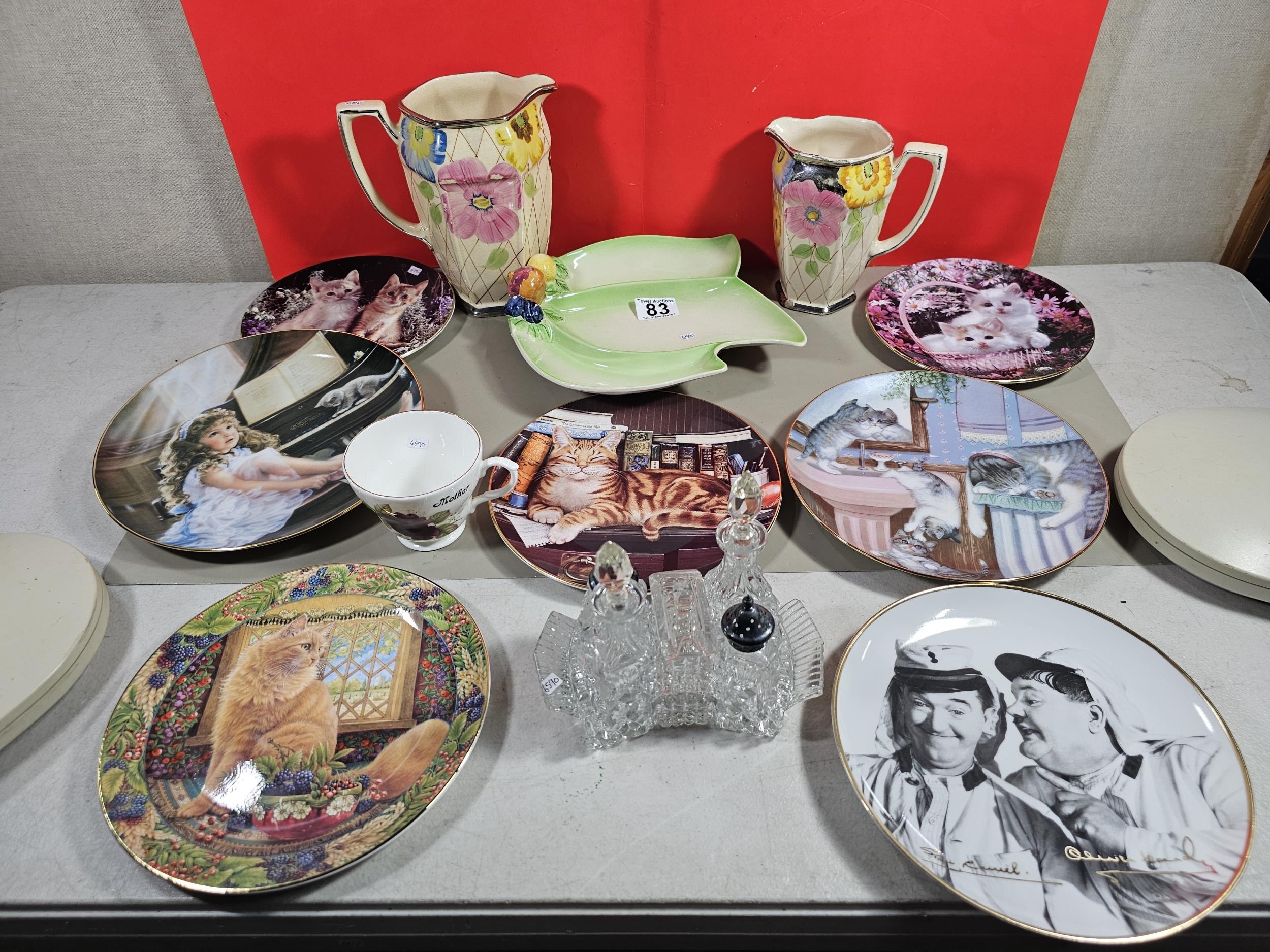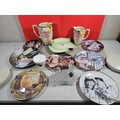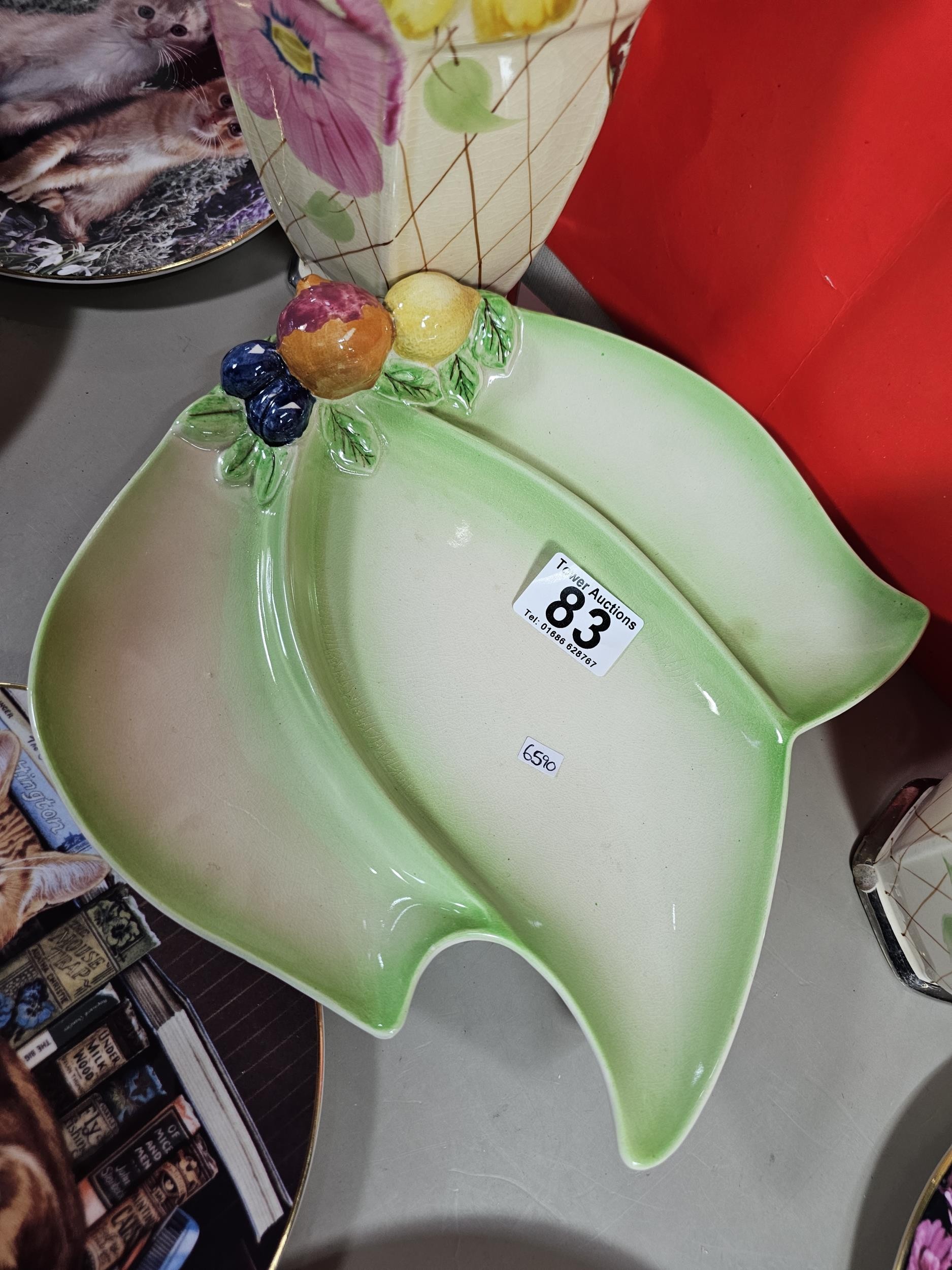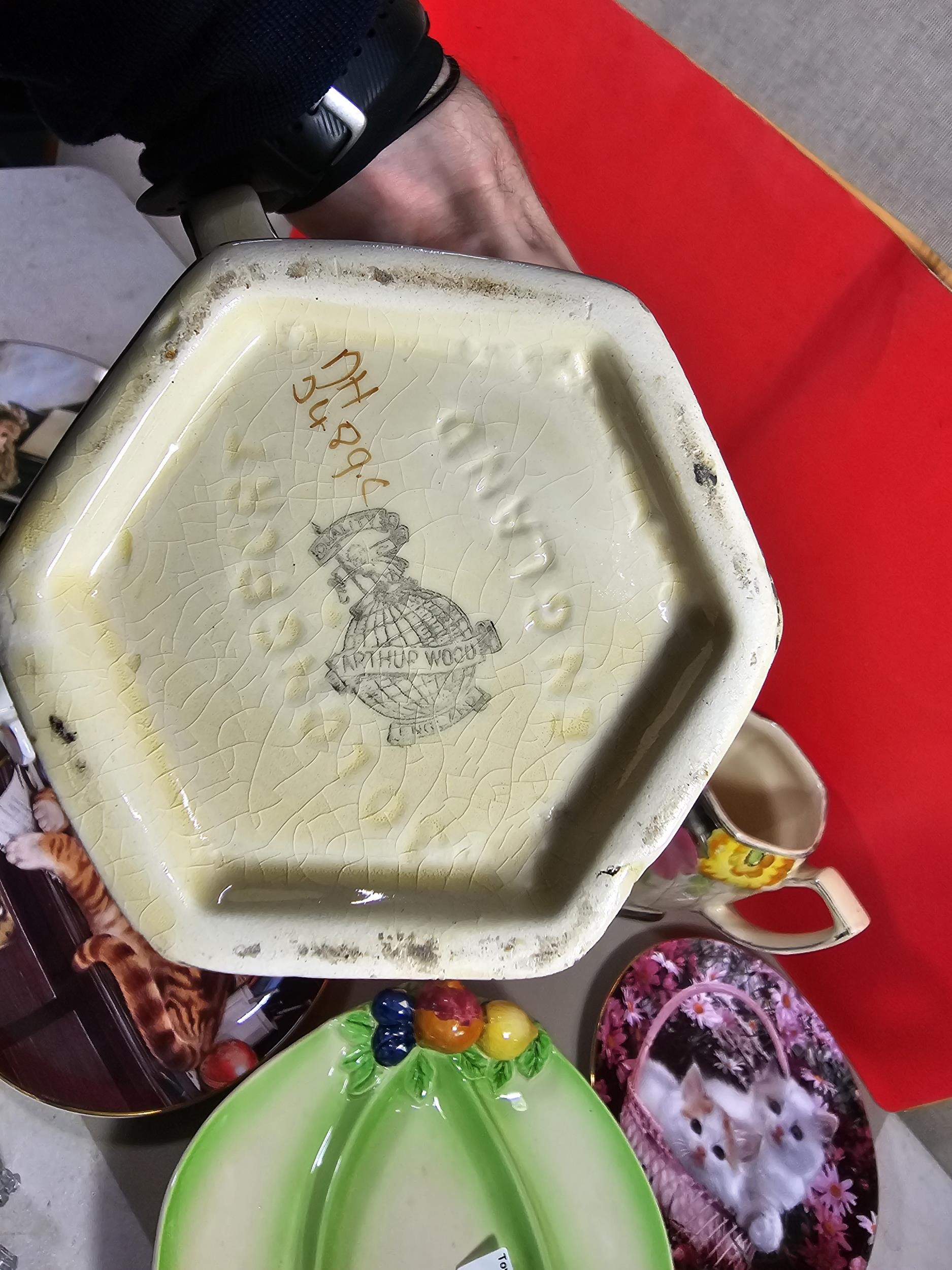 A shelf full of collectables to including picture plates 2x Arthur Wood vases in an art deco style, along with a decorative Royal Norfolk serving dish in green with a fruit design and a condiment set in pressed glass