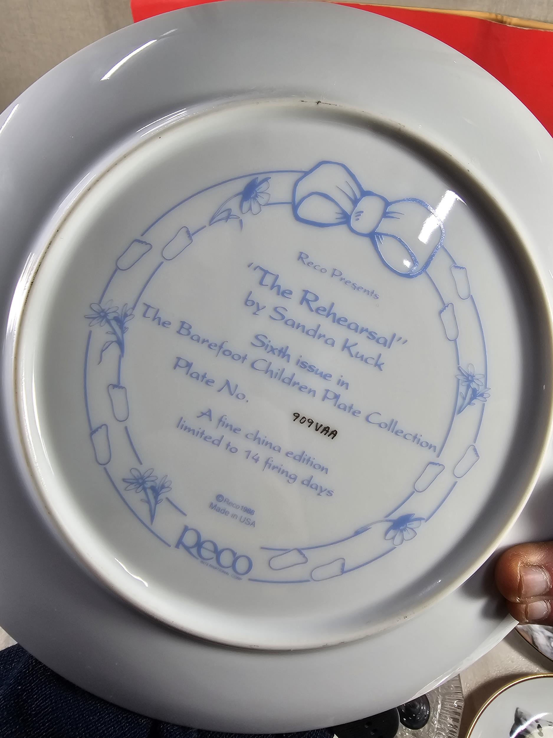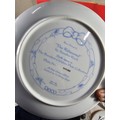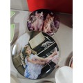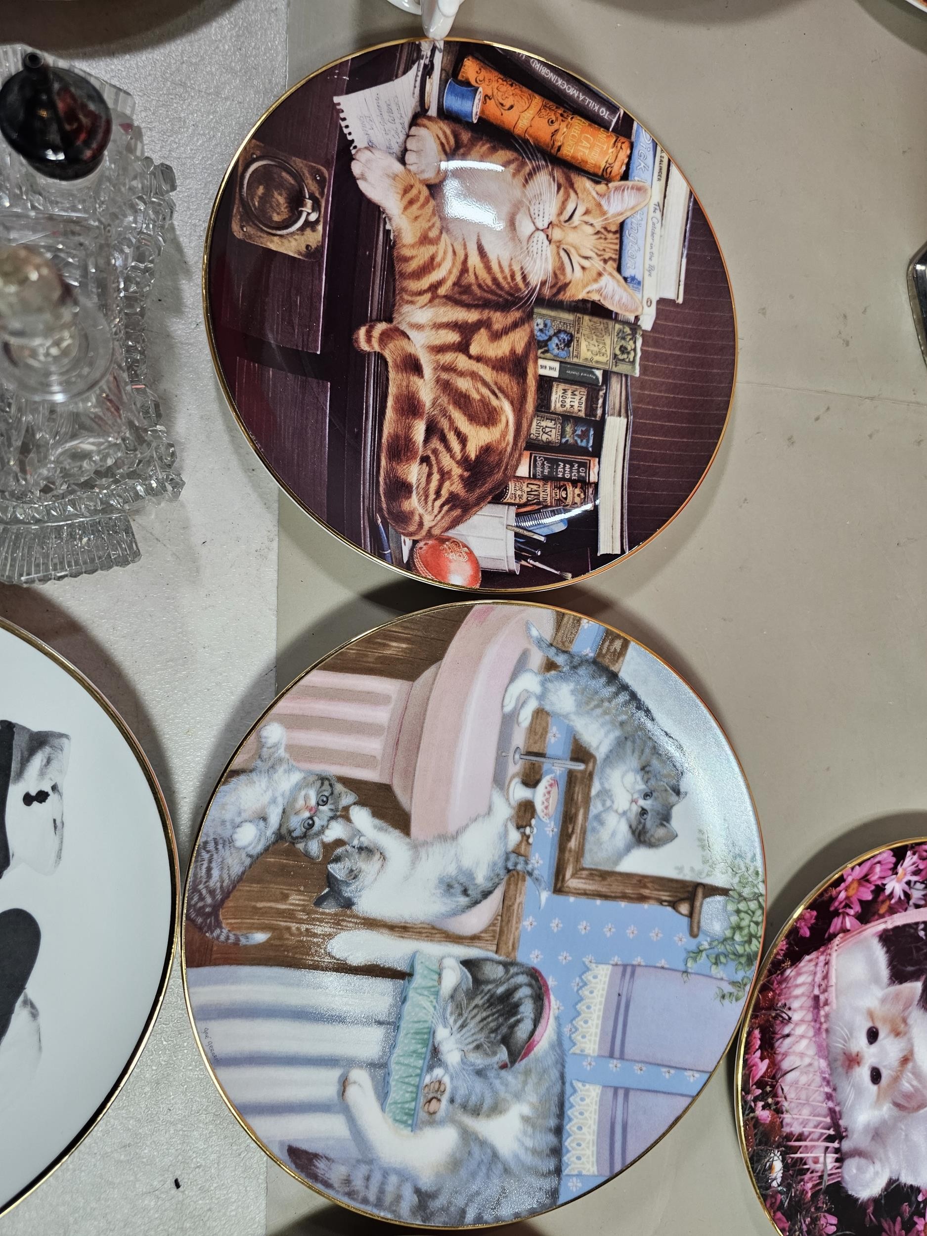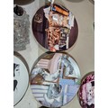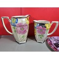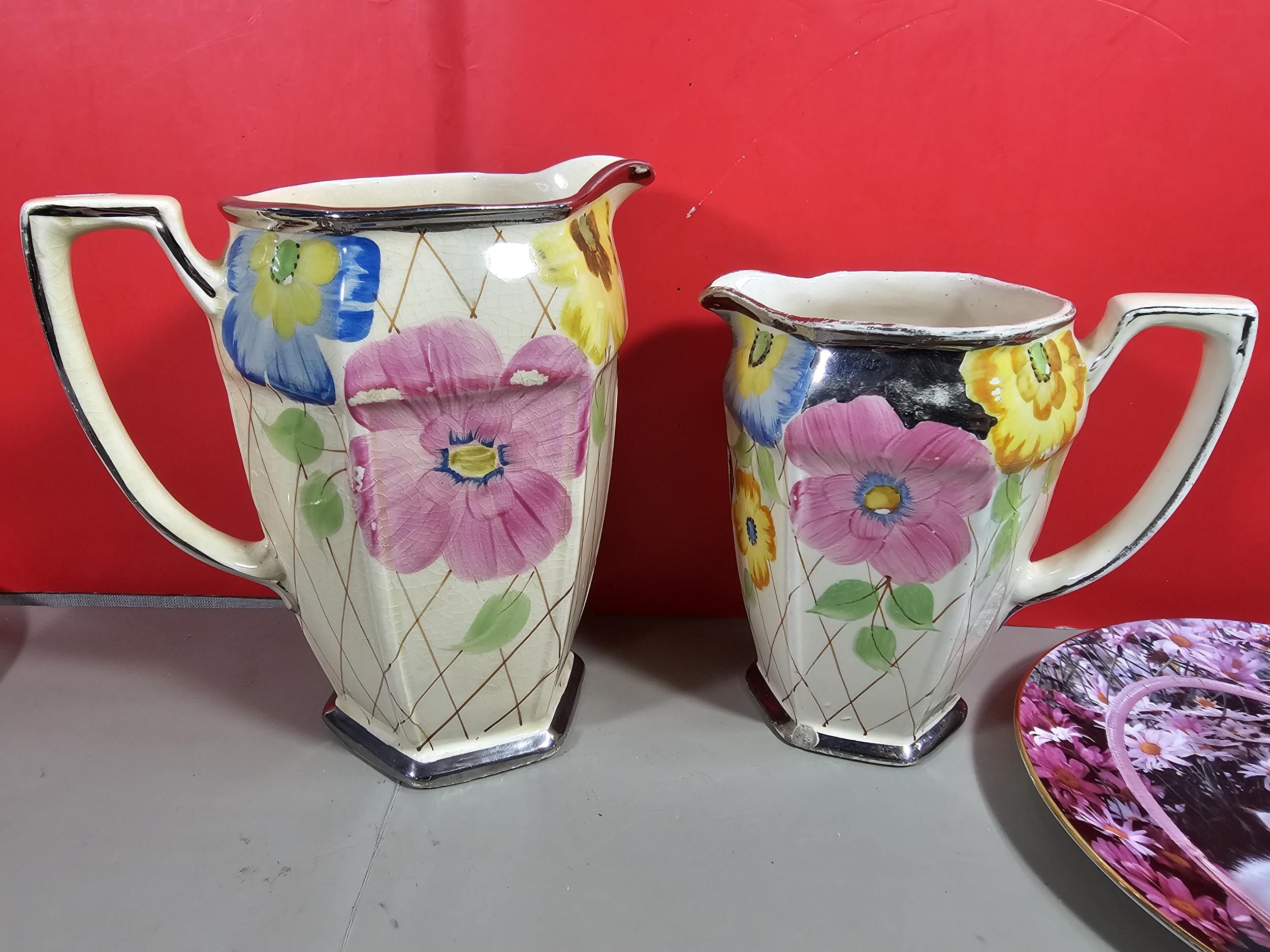 A shelf full of collectables to including picture plates 2x Arthur Wood vases in an art deco style, along with a decorative Royal Norfolk serving dish in green with a fruit design and a condiment set in pressed glass